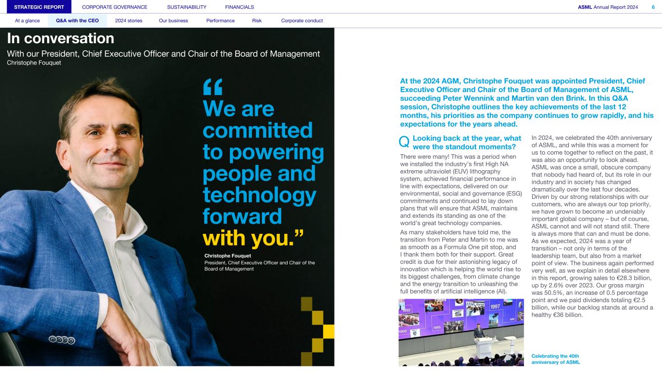 We are committed to powering people and technology forward with you.” Christophe Fouquet President, Chief Executive Officer and Chair of the Board of Management STRATEGIC REPORT CORPORATE GOVERNANCE SUSTAINABILITY FINANCIALS ASML Annual Report 2024 6 At a glance Q&A with the CEO 2024 stories Our business Performance Risk Corporate conduct In conversation With our President, Chief Executive Officer and Chair of the Board of Management Christophe Fouquet At the 2024 AGM, Christophe Fouquet was appointed President, Chief Executive Officer and Chair of the Board of Management of ASML, succeeding Peter Wennink and Martin van den Brink. In this Q&A session, Christophe outlines the key achievements of the last 12 months, his priorities as the company continues to grow rapidly, and his expectations for the years ahead. Q Looking back at the year, what were the standout moments? In 2024, we celebrated the 40th anniversary of ASML, and while this was a moment for us to come together to reflect on the past, it was also an opportunity to look ahead. ASML was once a small, obscure company that nobody had heard of, but its role in our industry and in society has changed dramatically over the last four decades. Driven by our strong relationships with our customers, who are always our top priority, we have grown to become an undeniably important global company – but of course, ASML cannot and will not stand still. There is always more that can and must be done. As we expected, 2024 was a year of transition – not only in terms of the leadership team, but also from a market point of view. The business again performed very well, as we explain in detail elsewhere in this report, growing sales to €28.3 billion, up by 2.6% over 2023. Our gross margin was 50.5%, an increase of 0.5 percentage point and we paid dividends totaling €2.5 billion, while our backlog stands at around a healthy €36 billion. There were many! This was a period when we installed the industry’s first High NA extreme ultraviolet (EUV) lithography system, achieved financial performance in line with expectations, delivered on our environmental, social and governance (ESG) commitments and continued to lay down plans that will ensure that ASML maintains and extends its standing as one of the world’s great technology companies. As many stakeholders have told me, the transition from Peter and Martin to me was as smooth as a Formula One pit stop, and I thank them both for their support. Great credit is due for their astonishing legacy of innovation which is helping the world rise to its biggest challenges, from climate change and the energy transition to unleashing the full benefits of artificial intelligence (AI). Celebrating the 40th anniversary of ASML