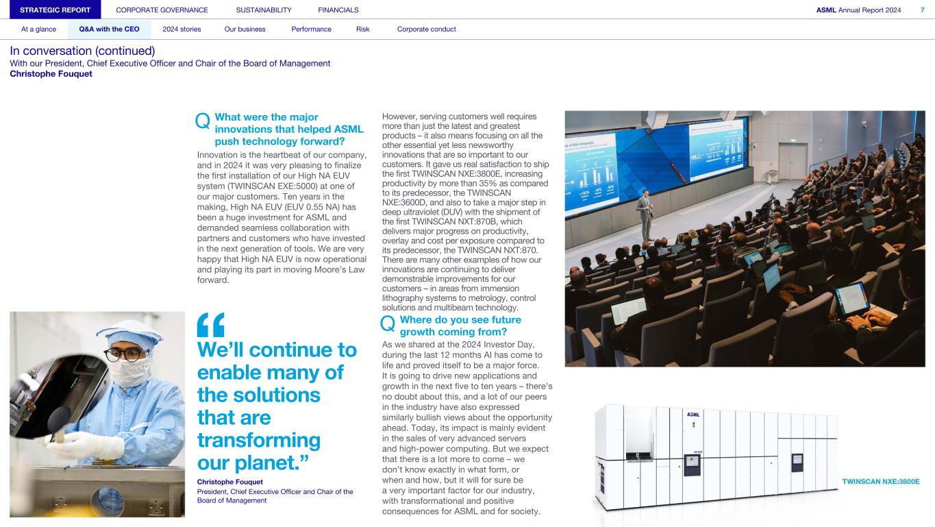 Q What were the major innovations that helped ASML push technology forward? Innovation is the heartbeat of our company, and in 2024 it was very pleasing to finalize the first installation of our High NA EUV system (TWINSCAN EXE:5000) at one of our major customers. Ten years in the making, High NA EUV (EUV 0.55 NA) has been a huge investment for ASML and demanded seamless collaboration with partners and customers who have invested in the next generation of tools. We are very happy that High NA EUV is now operational and playing its part in moving Moore’s Law forward. We’ll continue to enable many of the solutions that are transforming our planet.” Christophe Fouquet President, Chief Executive Officer and Chair of the Board of Management However, serving customers well requires more than just the latest and greatest products – it also means focusing on all the other essential yet less newsworthy innovations that are so important to our customers. It gave us real satisfaction to ship the first TWINSCAN NXE:3800E, increasing productivity by more than 35% as compared to its predecessor, the TWINSCAN NXE:3600D, and also to take a major step in deep ultraviolet (DUV) with the shipment of the first TWINSCAN NXT:870B, which delivers major progress on productivity, overlay and cost per exposure compared to its predecessor, the TWINSCAN NXT:870. There are many other examples of how our innovations are continuing to deliver demonstrable improvements for our customers – in areas from immersion lithography systems to metrology, control solutions and multibeam technology. Q Where do you see future growth coming from? As we shared at the 2024 Investor Day, during the last 12 months AI has come to life and proved itself to be a major force. It is going to drive new applications and growth in the next five to ten years – there’s no doubt about this, and a lot of our peers in the industry have also expressed similarly bullish views about the opportunity ahead. Today, its impact is mainly evident in the sales of very advanced servers and high-power computing. But we expect that there is a lot more to come – we don’t know exactly in what form, or when and how, but it will for sure be a very important factor for our industry, with transformational and positive consequences for ASML and for society. STRATEGIC REPORT CORPORATE GOVERNANCE SUSTAINABILITY FINANCIALS ASML Annual Report 2024 7 At a glance Q&A with the CEO 2024 stories Our business Performance Risk Corporate conduct In conversation (continued) With our President, Chief Executive Officer and Chair of the Board of Management Christophe Fouquet