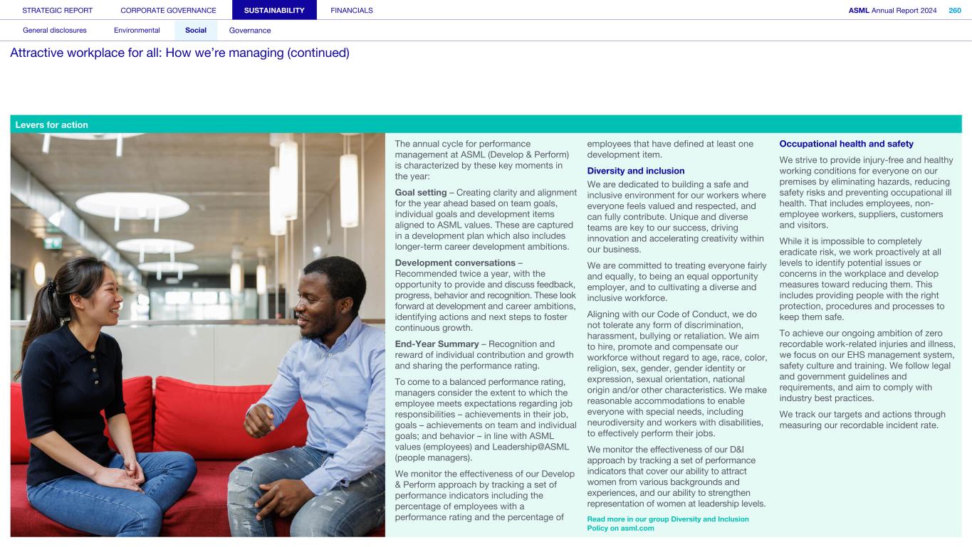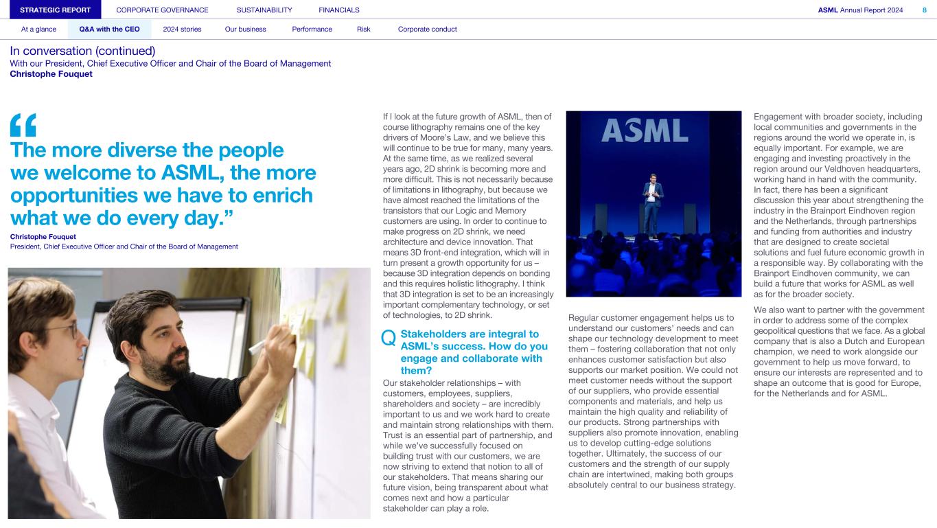 If I look at the future growth of ASML, then of course lithography remains one of the key drivers of Moore’s Law, and we believe this will continue to be true for many, many years. At the same time, as we realized several years ago, 2D shrink is becoming more and more difficult. This is not necessarily because of limitations in lithography, but because we have almost reached the limitations of the transistors that our Logic and Memory customers are using. In order to continue to make progress on 2D shrink, we need architecture and device innovation. That means 3D front-end integration, which will in turn present a growth opportunity for us – because 3D integration depends on bonding and this requires holistic lithography. I think that 3D integration is set to be an increasingly important complementary technology, or set of technologies, to 2D shrink. Q Stakeholders are integral to ASML’s success. How do you engage and collaborate with them? Our stakeholder relationships – with customers, employees, suppliers, shareholders and society – are incredibly important to us and we work hard to create and maintain strong relationships with them. Trust is an essential part of partnership, and while we’ve successfully focused on building trust with our customers, we are now striving to extend that notion to all of our stakeholders. That means sharing our future vision, being transparent about what comes next and how a particular stakeholder can play a role. Regular customer engagement helps us to understand our customers’ needs and can shape our technology development to meet them – fostering collaboration that not only enhances customer satisfaction but also supports our market position. We could not meet customer needs without the support of our suppliers, who provide essential components and materials, and help us maintain the high quality and reliability of our products. Strong partnerships with suppliers also promote innovation, enabling us to develop cutting-edge solutions together. Ultimately, the success of our customers and the strength of our supply chain are intertwined, making both groups absolutely central to our business strategy. Engagement with broader society, including local communities and governments in the regions around the world we operate in, is equally important. For example, we are engaging and investing proactively in the region around our Veldhoven headquarters, working hand in hand with the community. In fact, there has been a significant discussion this year about strengthening the industry in the Brainport Eindhoven region and the Netherlands, through partnerships and funding from authorities and industry that are designed to create societal solutions and fuel future economic growth in a responsible way. By collaborating with the Brainport Eindhoven community, we can build a future that works for ASML as well as for the broader society. We also want to partner with the government in order to address some of the complex geopolitical questions that we face. As a global company that is also a Dutch and European champion, we need to work alongside our government to help us move forward, to ensure our interests are represented and to shape an outcome that is good for Europe, for the Netherlands and for ASML. STRATEGIC REPORT CORPORATE GOVERNANCE SUSTAINABILITY FINANCIALS ASML Annual Report 2024 8 At a glance Q&A with the CEO 2024 stories Our business Performance Risk Corporate conduct In conversation (continued) With our President, Chief Executive Officer and Chair of the Board of Management Christophe Fouquet The more diverse the people we welcome to ASML, the more opportunities we have to enrich what we do every day.” Christophe Fouquet President, Chief Executive Officer and Chair of the Board of Management