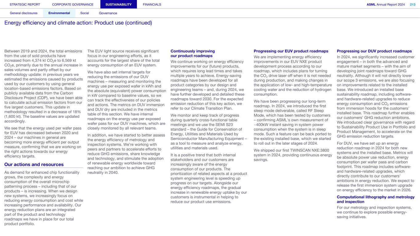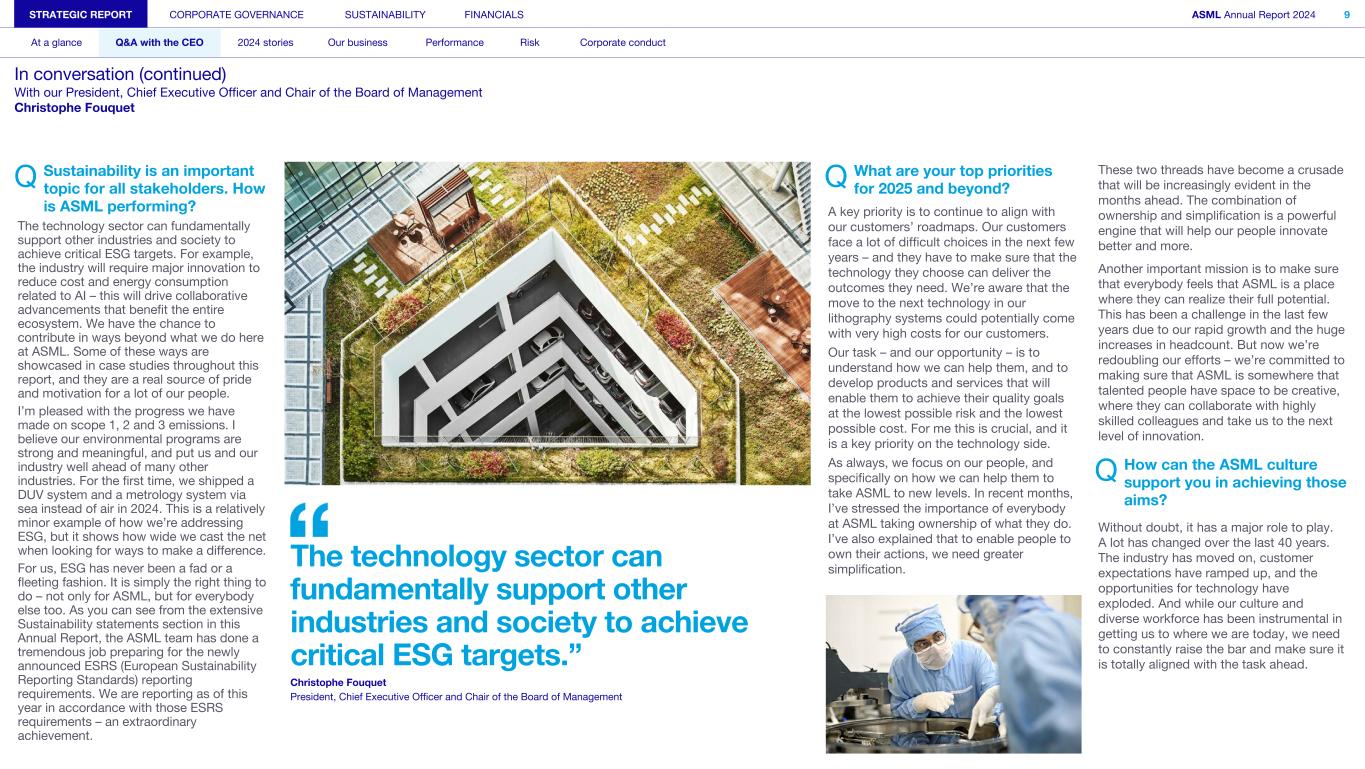 Q Sustainability is an important topic for all stakeholders. How is ASML performing? The technology sector can fundamentally support other industries and society to achieve critical ESG targets. For example, the industry will require major innovation to reduce cost and energy consumption related to AI – this will drive collaborative advancements that benefit the entire ecosystem. We have the chance to contribute in ways beyond what we do here at ASML. Some of these ways are showcased in case studies throughout this report, and they are a real source of pride and motivation for a lot of our people. I’m pleased with the progress we have made on scope 1, 2 and 3 emissions. I believe our environmental programs are strong and meaningful, and put us and our industry well ahead of many other industries. For the first time, we shipped a DUV system and a metrology system via sea instead of air in 2024. This is a relatively minor example of how we’re addressing ESG, but it shows how wide we cast the net when looking for ways to make a difference. For us, ESG has never been a fad or a fleeting fashion. It is simply the right thing to do – not only for ASML, but for everybody else too. As you can see from the extensive Sustainability statements section in this Annual Report, the ASML team has done a tremendous job preparing for the newly announced ESRS (European Sustainability Reporting Standards) reporting requirements. We are reporting as of this year in accordance with those ESRS requirements – an extraordinary achievement. Q What are your top priorities for 2025 and beyond? A key priority is to continue to align with our customers’ roadmaps. Our customers face a lot of difficult choices in the next few years – and they have to make sure that the technology they choose can deliver the outcomes they need. We’re aware that the move to the next technology in our lithography systems could potentially come with very high costs for our customers. Our task – and our opportunity – is to understand how we can help them, and to develop products and services that will enable them to achieve their quality goals at the lowest possible risk and the lowest possible cost. For me this is crucial, and it is a key priority on the technology side. As always, we focus on our people, and specifically on how we can help them to take ASML to new levels. In recent months, I’ve stressed the importance of everybody at ASML taking ownership of what they do. I’ve also explained that to enable people to own their actions, we need greater simplification. These two threads have become a crusade that will be increasingly evident in the months ahead. The combination of ownership and simplification is a powerful engine that will help our people innovate better and more. Another important mission is to make sure that everybody feels that ASML is a place where they can realize their full potential. This has been a challenge in the last few years due to our rapid growth and the huge increases in headcount. But now we’re redoubling our efforts – we’re committed to making sure that ASML is somewhere that talented people have space to be creative, where they can collaborate with highly skilled colleagues and take us to the next level of innovation. Q How can the ASML culture support you in achieving those aims? Without doubt, it has a major role to play. A lot has changed over the last 40 years. The industry has moved on, customer expectations have ramped up, and the opportunities for technology have exploded. And while our culture and diverse workforce has been instrumental in getting us to where we are today, we need to constantly raise the bar and make sure it is totally aligned with the task ahead. STRATEGIC REPORT CORPORATE GOVERNANCE SUSTAINABILITY FINANCIALS ASML Annual Report 2024 9 At a glance Q&A with the CEO 2024 stories Our business Performance Risk Corporate conduct In conversation (continued) With our President, Chief Executive Officer and Chair of the Board of Management Christophe Fouquet The technology sector can fundamentally support other industries and society to achieve critical ESG targets.” Christophe Fouquet President, Chief Executive Officer and Chair of the Board of Management
