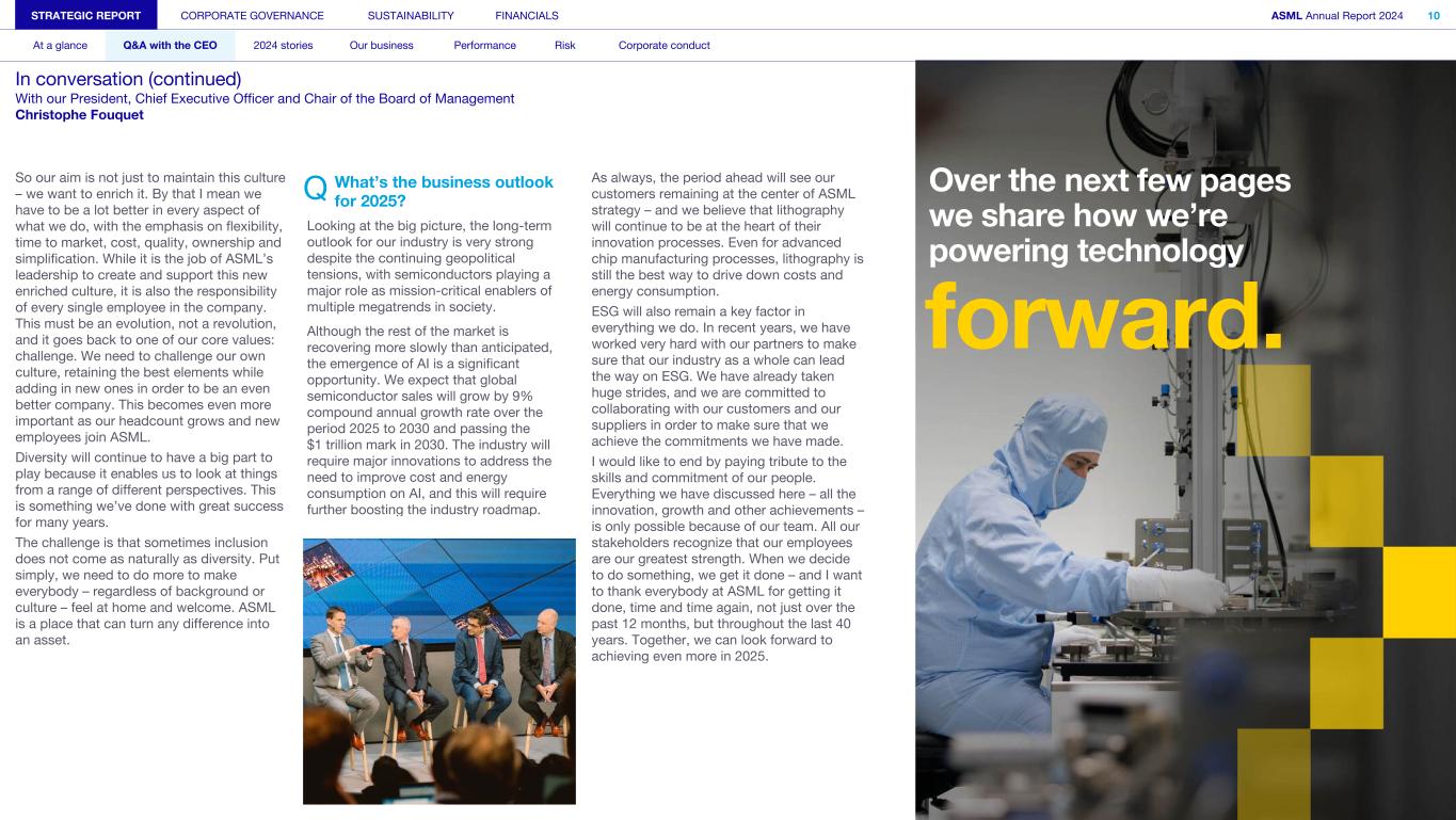 So our aim is not just to maintain this culture – we want to enrich it. By that I mean we have to be a lot better in every aspect of what we do, with the emphasis on flexibility, time to market, cost, quality, ownership and simplification. While it is the job of ASML’s leadership to create and support this new enriched culture, it is also the responsibility of every single employee in the company. This must be an evolution, not a revolution, and it goes back to one of our core values: challenge. We need to challenge our own culture, retaining the best elements while adding in new ones in order to be an even better company. This becomes even more important as our headcount grows and new employees join ASML. Diversity will continue to have a big part to play because it enables us to look at things from a range of different perspectives. This is something we’ve done with great success for many years. The challenge is that sometimes inclusion does not come as naturally as diversity. Put simply, we need to do more to make everybody – regardless of background or culture – feel at home and welcome. ASML is a place that can turn any difference into an asset. Q What’s the business outlook for 2025? Looking at the big picture, the long-term outlook for our industry is very strong despite the continuing geopolitical tensions, with semiconductors playing a major role as mission-critical enablers of multiple megatrends in society. Although the rest of the market is recovering more slowly than anticipated, the emergence of AI is a significant opportunity. We expect that global semiconductor sales will grow by 9% compound annual growth rate over the period 2025 to 2030 and passing the $1 trillion mark in 2030. The industry will require major innovations to address the need to improve cost and energy consumption on AI, and this will require further boosting the industry roadmap. As always, the period ahead will see our customers remaining at the center of ASML strategy – and we believe that lithography will continue to be at the heart of their innovation processes. Even for advanced chip manufacturing processes, lithography is still the best way to drive down costs and energy consumption. ESG will also remain a key factor in everything we do. In recent years, we have worked very hard with our partners to make sure that our industry as a whole can lead the way on ESG. We have already taken huge strides, and we are committed to collaborating with our customers and our suppliers in order to make sure that we achieve the commitments we have made. I would like to end by paying tribute to the skills and commitment of our people. Everything we have discussed here – all the innovation, growth and other achievements – is only possible because of our team. All our stakeholders recognize that our employees are our greatest strength. When we decide to do something, we get it done – and I want to thank everybody at ASML for getting it done, time and time again, not just over the past 12 months, but throughout the last 40 years. Together, we can look forward to achieving even more in 2025. STRATEGIC REPORT CORPORATE GOVERNANCE SUSTAINABILITY FINANCIALS ASML Annual Report 2024 10 At a glance Q&A with the CEO 2024 stories Our business Performance Risk Corporate conduct In conversation (continued) With our President, Chief Executive Officer and Chair of the Board of Management Christophe Fouquet Over the next few pages we share how we’re powering technology forward.