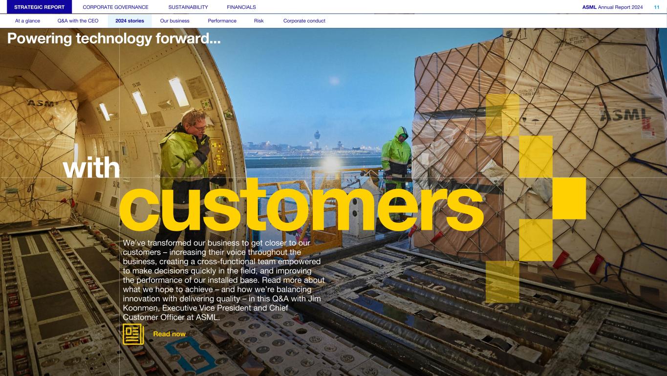 Powering technology forward... STRATEGIC REPORT CORPORATE GOVERNANCE SUSTAINABILITY FINANCIALS ASML Annual Report 2024 11 At a glance Q&A with the CEO 2024 stories Our business Performance Risk Corporate conduct customers with We’ve transformed our business to get closer to our customers – increasing their voice throughout the business, creating a cross-functional team empowered to make decisions quickly in the field, and improving the performance of our installed base. Read more about what we hope to achieve – and how we’re balancing innovation with delivering quality – in this Q&A with Jim Koonmen, Executive Vice President and Chief Customer Officer at ASML. Read now