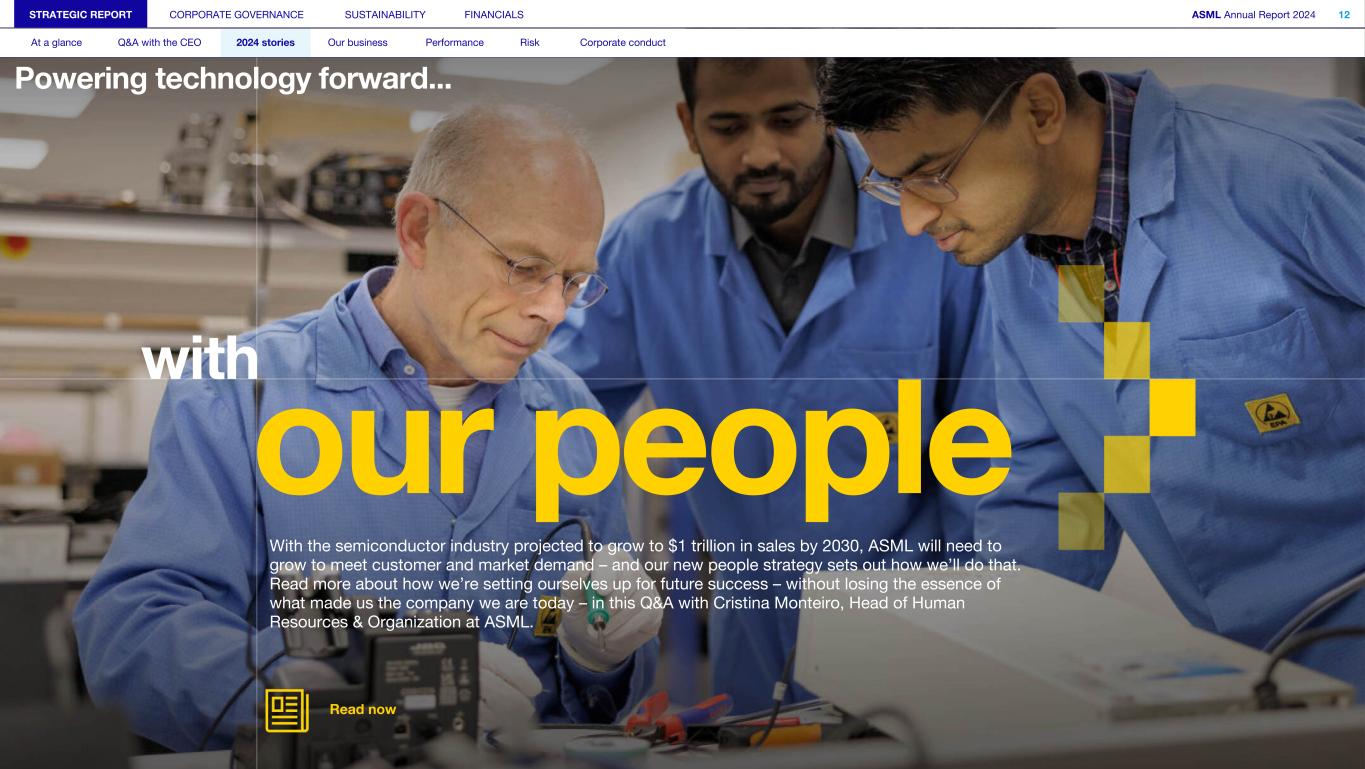 our people Powering technology forward... with With the semiconductor industry projected to grow to $1 trillion in sales by 2030, ASML will need to grow to meet customer and market demand – and our new people strategy sets out how we’ll do that. Read more about how we’re setting ourselves up for future success – without losing the essence of what made us the company we are today – in this Q&A with Cristina Monteiro, Head of Human Resources & Organization at ASML. Read now STRATEGIC REPORT CORPORATE GOVERNANCE SUSTAINABILITY FINANCIALS ASML Annual Report 2024 12 At a glance Q&A with the CEO 2024 stories Our business Performance Risk Corporate conduct