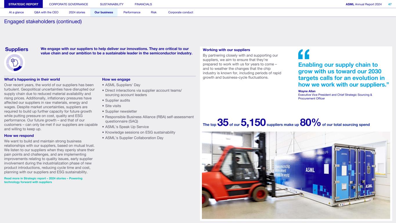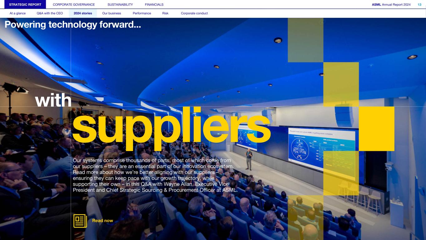 Powering technology forward... STRATEGIC REPORT CORPORATE GOVERNANCE SUSTAINABILITY FINANCIALS ASML Annual Report 2024 13 At a glance Q&A with the CEO 2024 stories Our business Performance Risk Corporate conduct suppliers with Our systems comprise thousands of parts, most of which come from our suppliers – they are an essential part of our innovation ecosystem. Read more about how we’re better aligning with our suppliers – ensuring they can keep pace with our growth trajectory, while supporting their own – in this Q&A with Wayne Allan, Executive Vice President and Chief Strategic Sourcing & Procurement Officer at ASML. Read now