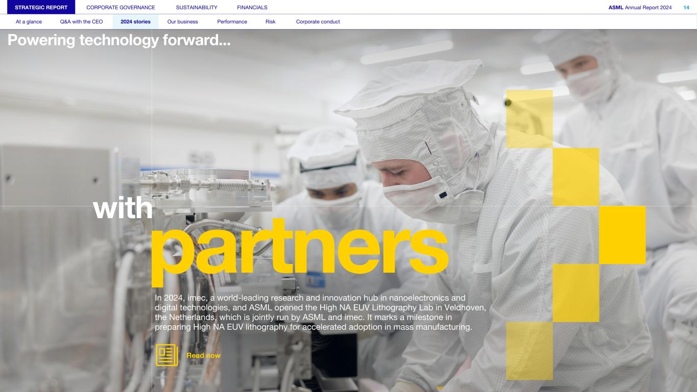 Powering technology forward... STRATEGIC REPORT CORPORATE GOVERNANCE SUSTAINABILITY FINANCIALS ASML Annual Report 2024 14 At a glance Q&A with the CEO 2024 stories Our business Performance Risk Corporate conduct partners with In 2024, imec, a world-leading research and innovation hub in nanoelectronics and digital technologies, and ASML opened the High NA EUV Lithography Lab in Veldhoven, the Netherlands, which is jointly run by ASML and imec. It marks a milestone in preparing High NA EUV lithography for accelerated adoption in mass manufacturing. Read now