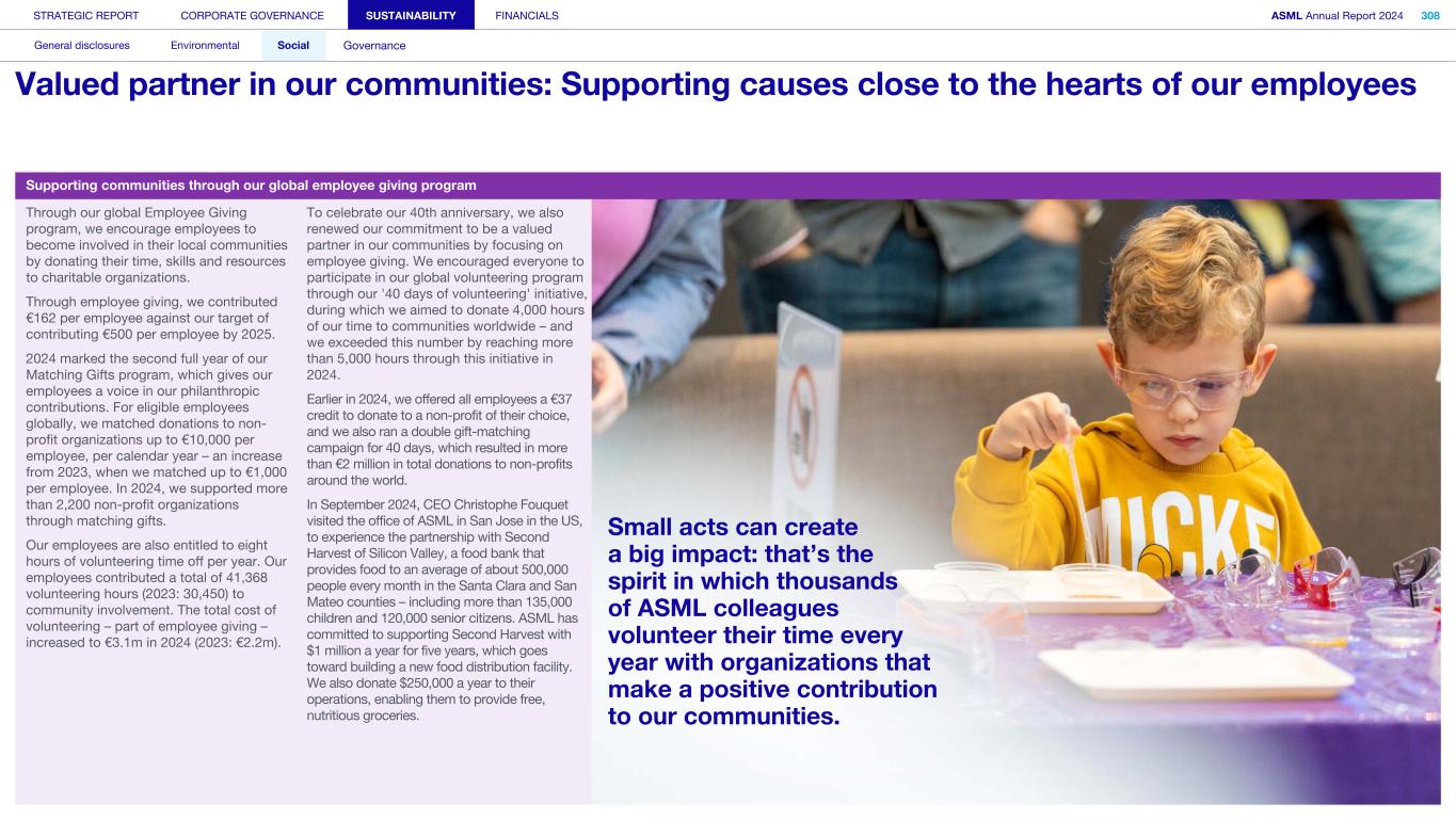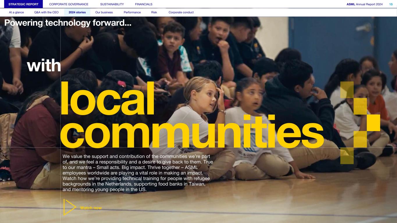 Powering technology forward... STRATEGIC REPORT CORPORATE GOVERNANCE SUSTAINABILITY FINANCIALS ASML Annual Report 2024 15 At a glance Q&A with the CEO 2024 stories Our business Performance Risk Corporate conduct local communities We value the support and contribution of the communities we’re part of, and we feel a responsibility and a desire to give back to them. True to our mantra – Small acts. Big impact. Thrive together – ASML employees worldwide are playing a vital role in making an impact. Watch how we’re providing technical training for people with refugee backgrounds in the Netherlands, supporting food banks in Taiwan, and mentoring young people in the US. Watch now with