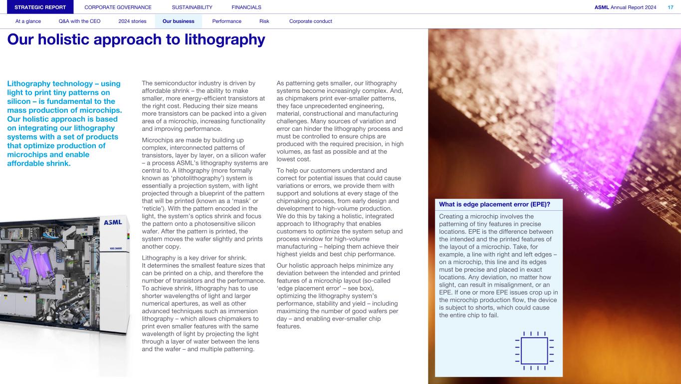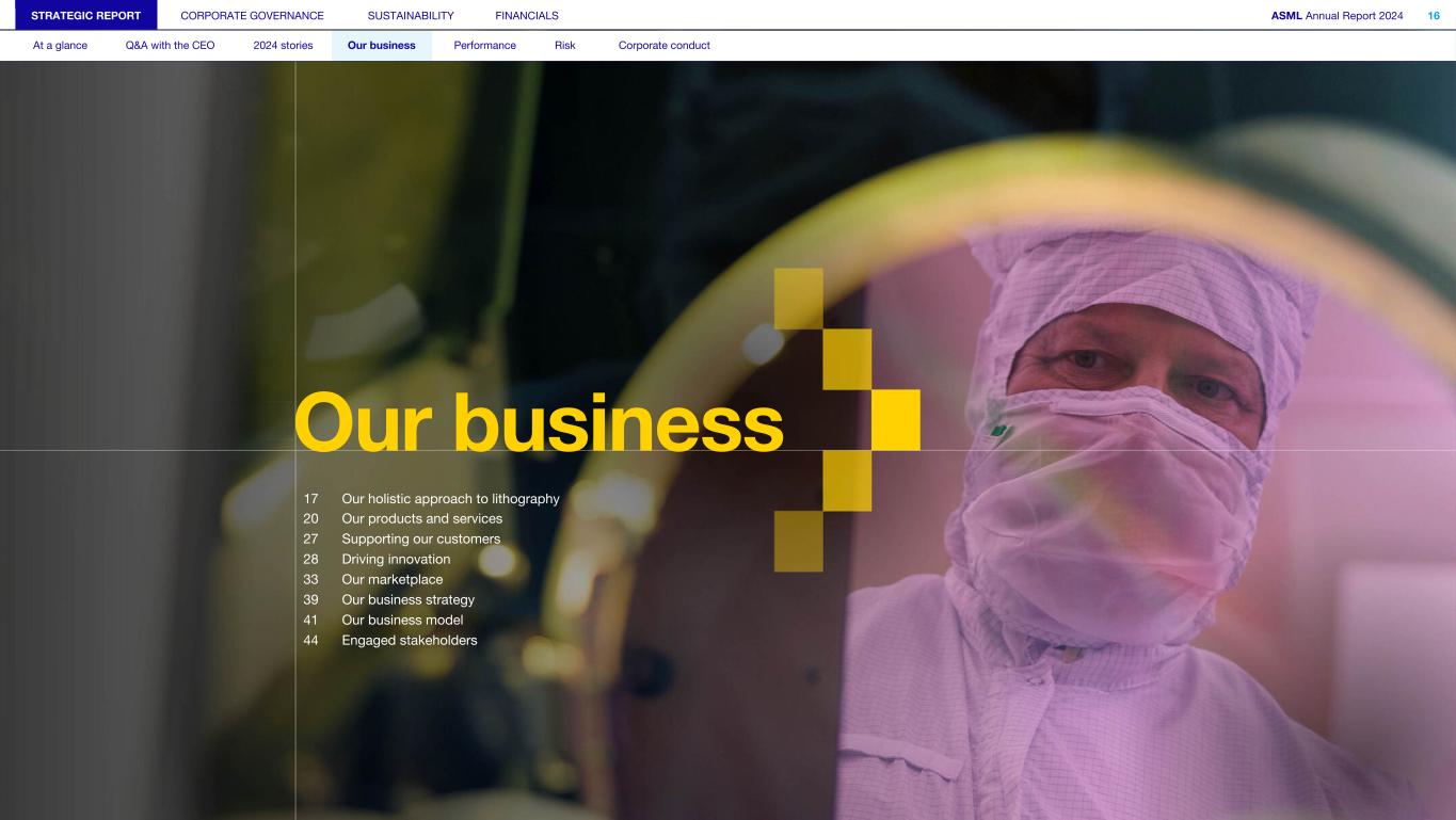 STRATEGIC REPORT CORPORATE GOVERNANCE SUSTAINABILITY FINANCIALS ASML Annual Report 2024 16 At a glance Q&A with the CEO 2024 stories Our business Performance Risk Corporate conduct Our business 17 Our holistic approach to lithography 20 Our products and services 27 Supporting our customers 28 Driving innovation 33 Our marketplace 39 Our business strategy 41 Our business model 44 Engaged stakeholders
