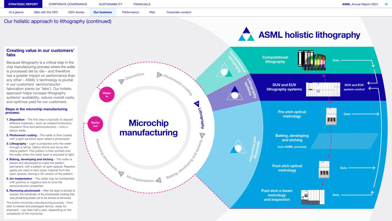 Creating value in our customers’ fabs Because lithography is a critical step in the chip manufacturing process where the wafer is processed die by die – and therefore has a greater impact on performance than any other – ASML’s technology is pivotal in our customers’ semiconductor fabrication plants (or ‘fabs’). Our holistic approach helps increase lithography systems’ availability, reduce overall costs, and optimize yield for our customers. Steps in the microchip manufacturing process: 1. Deposition – The first step is typically to deposit different materials – such as metals/conductors, insulation films and semiconductors – onto a silicon wafer. 2. Photoresist coating – The wafer is then coated with a light-sensitive layer called a photoresist. 3. Lithography – Light is projected onto the wafer through a reticle. Optics shrink and focus the reticle pattern. This pattern is then printed onto the wafer when the resist layer is exposed to light. 4. Baking, developing and etching – The wafer is baked and developed to make the pattern permanent, with a pattern of open spaces. Reactive gases are used to etch away material from the open spaces, leaving a 3D version of the pattern. 5. Ion implantation – The wafer may be bombarded with positive or negative ions to tune the semiconductor properties. 6. Removing photoresist – After the layer is etched or ionized, the remainder of the photoresist coating that was protecting areas not to be etched is removed. The entire microchip manufacturing process – from start to tested and packaged device, ready for shipment – can take half a year, depending on the complexity of the microchip. STRATEGIC REPORT CORPORATE GOVERNANCE SUSTAINABILITY FINANCIALS ASML Annual Report 2024 18 At a glance Q&A with the CEO 2024 stories Our business Performance Risk Corporate conduct Our holistic approach to lithography (continued)