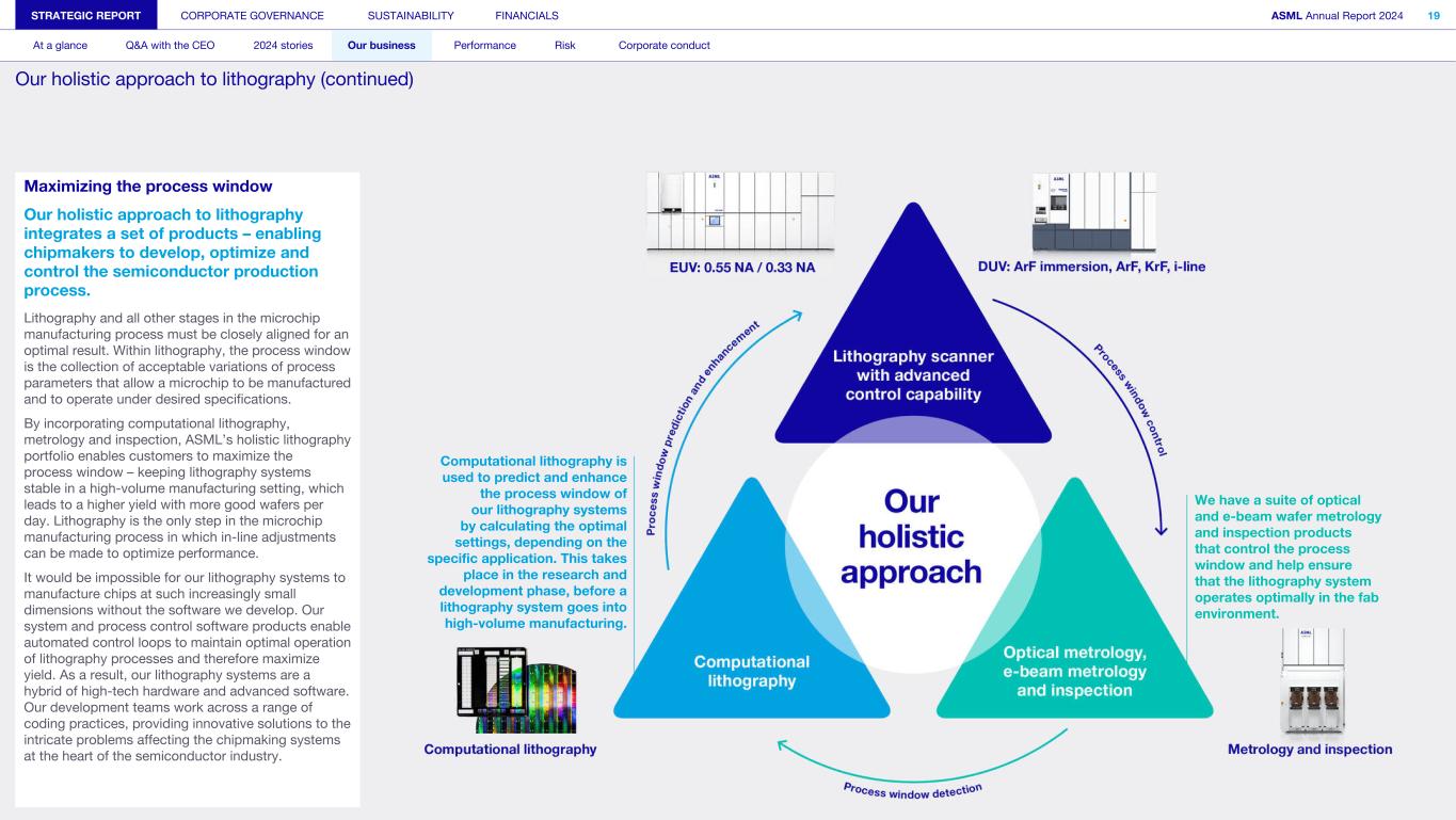Maximizing the process window Our holistic approach to lithography integrates a set of products – enabling chipmakers to develop, optimize and control the semiconductor production process. Lithography and all other stages in the microchip manufacturing process must be closely aligned for an optimal result. Within lithography, the process window is the collection of acceptable variations of process parameters that allow a microchip to be manufactured and to operate under desired specifications. By incorporating computational lithography, metrology and inspection, ASML’s holistic lithography portfolio enables customers to maximize the process window – keeping lithography systems stable in a high-volume manufacturing setting, which leads to a higher yield with more good wafers per day. Lithography is the only step in the microchip manufacturing process in which in-line adjustments can be made to optimize performance. It would be impossible for our lithography systems to manufacture chips at such increasingly small dimensions without the software we develop. Our system and process control software products enable automated control loops to maintain optimal operation of lithography processes and therefore maximize yield. As a result, our lithography systems are a hybrid of high-tech hardware and advanced software. Our development teams work across a range of coding practices, providing innovative solutions to the intricate problems affecting the chipmaking systems at the heart of the semiconductor industry. STRATEGIC REPORT CORPORATE GOVERNANCE SUSTAINABILITY FINANCIALS ASML Annual Report 2024 19 At a glance Q&A with the CEO 2024 stories Our business Performance Risk Corporate conduct Our holistic approach to lithography (continued) Computational lithography is used to predict and enhance the process window of our lithography systems by calculating the optimal settings, depending on the specific application. This takes place in the research and development phase, before a lithography system goes into high-volume manufacturing. We have a suite of optical and e-beam wafer metrology and inspection products that control the process window and help ensure that the lithography system operates optimally in the fab environment.