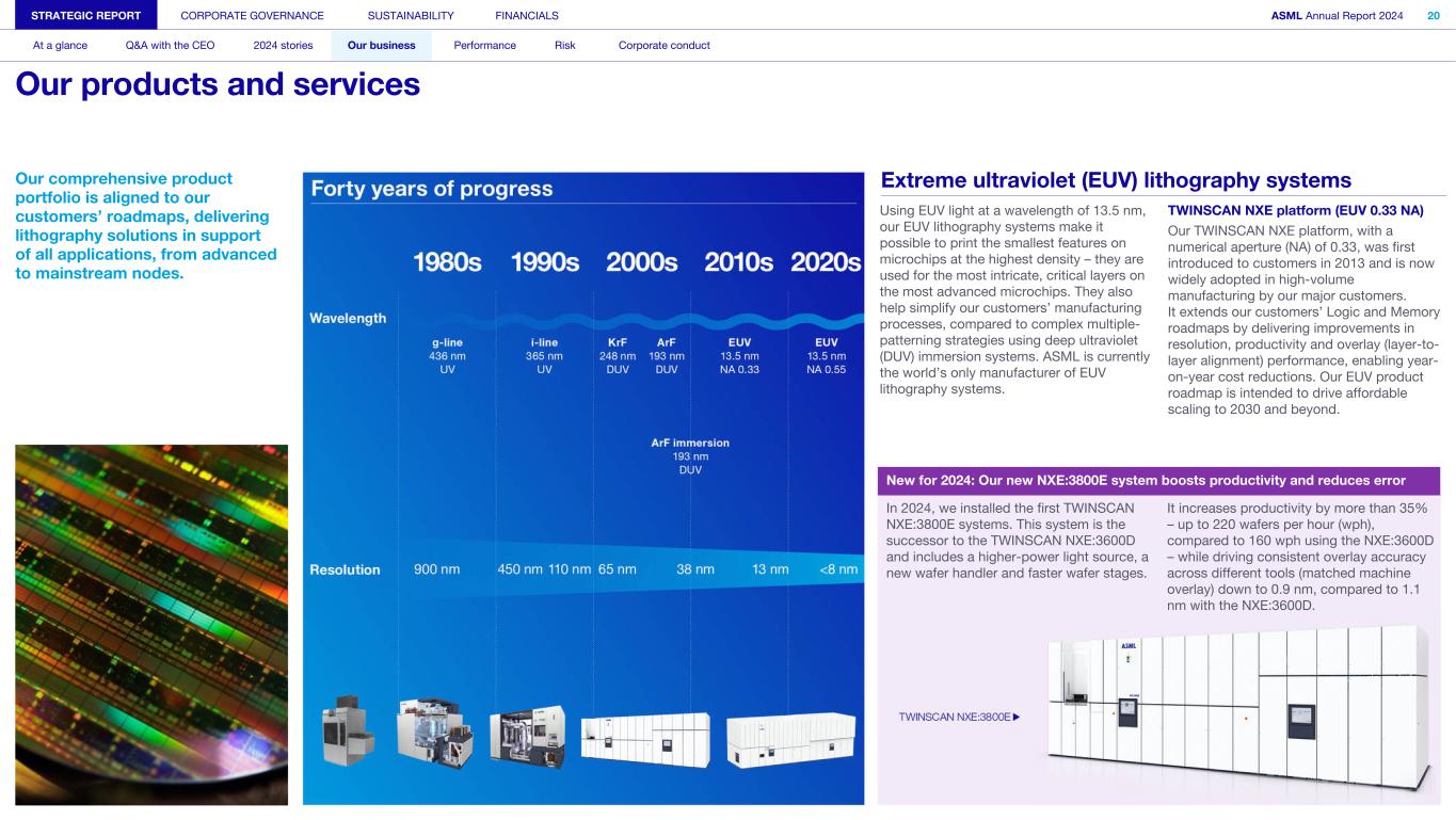 Our comprehensive product portfolio is aligned to our customers’ roadmaps, delivering lithography solutions in support of all applications, from advanced to mainstream nodes. Using EUV light at a wavelength of 13.5 nm, our EUV lithography systems make it possible to print the smallest features on microchips at the highest density – they are used for the most intricate, critical layers on the most advanced microchips. They also help simplify our customers’ manufacturing processes, compared to complex multiple- patterning strategies using deep ultraviolet (DUV) immersion systems. ASML is currently the world’s only manufacturer of EUV lithography systems. TWINSCAN NXE platform (EUV 0.33 NA) Our TWINSCAN NXE platform, with a numerical aperture (NA) of 0.33, was first introduced to customers in 2013 and is now widely adopted in high-volume manufacturing by our major customers. It extends our customers’ Logic and Memory roadmaps by delivering improvements in resolution, productivity and overlay (layer-to- layer alignment) performance, enabling year- on-year cost reductions. Our EUV product roadmap is intended to drive affordable scaling to 2030 and beyond. STRATEGIC REPORT CORPORATE GOVERNANCE SUSTAINABILITY FINANCIALS ASML Annual Report 2024 20 At a glance Q&A with the CEO 2024 stories Our business Performance Risk Corporate conduct Our products and services Extreme ultraviolet (EUV) lithography systems New for 2024: Our new NXE:3800E system boosts productivity and reduces error In 2024, we installed the first TWINSCAN NXE:3800E systems. This system is the successor to the TWINSCAN NXE:3600D and includes a higher-power light source, a new wafer handler and faster wafer stages. It increases productivity by more than 35% – up to 220 wafers per hour (wph), compared to 160 wph using the NXE:3600D – while driving consistent overlay accuracy across different tools (matched machine overlay) down to 0.9 nm, compared to 1.1 nm with the NXE:3600D.