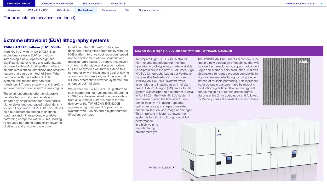 TWINSCAN EXE platform (EUV 0.55 NA) High NA EUV, with an NA of 0.55, is an evolutionary step in EUV technology, introducing a novel optics design and significantly faster reticle and wafer stages. Our new TWINSCAN EXE platform offers chipmakers a critical dimension (the smallest feature that can be printed) of 8 nm. When compared with the TWINSCAN NXE systems, this means they can print transistors 1.7 times smaller – and therefore achieve transistor densities 2.9 times higher. These enhancements offer considerable benefits to our customers, enabling lithography simplification for future nodes, higher yields and decreased defect density for both Logic and DRAM. EUV 0.55 NA will help our customers extend their shrink roadmap and minimize double or triple patterning compared with 0.33 NA, leading to reduced patterning complexity, lower risk of defects and a shorter cycle time. In addition, the EXE platform has been designed to maximize commonality with the NXE platform to drive cost reduction, speed up the development of new solutions and optimize future reuse. Currently, they have a common wafer stage and source module. Our future systems will further extend this commonality with the ultimate goal of having a common platform early next decade that will only differentiate between systems from an optics point of view. We expect our TWINSCAN EXE platform to start supporting high-volume manufacturing in 2026 and have received purchase orders from all our major EUV customers for the delivery of the TWINSCAN EXE:5200B systems – high-volume EUV production systems with 0.55 NA and a higher number of wafers per hour. To prepare High NA EUV (0.55 NA) for high-volume manufacturing, the first operational prototype was made available to chipmakers in the new ASML-imec High NA EUV Lithography Lab at our Veldhoven campus (the Netherlands). Two more TWINSCAN EXE:5000 systems were assembled and installed at an Intel plant near Hillsboro, Oregon (US), and a fourth system was shipped to a customer in Asia. In April 2024, the High NA EUV system in Veldhoven printed the first-ever 10 nm dense lines, with imaging done after optics, sensors and stages completed coarse calibration (see image on the right). This important milestone showed the system is functioning, though not at full performance in a high-volume manufacturing environment yet. The TWINSCAN EXE:5000 EUV system is the first in a new generation of machines that will provide 8 nm resolution to support advanced Logic and Memory chip production. It allows chipmakers to reduce process complexity in high-volume manufacturing by using single instead of multiple patterning. This increases wafer output in customer fabs by reducing production cycle time. The technology will enable multiple future chip architectures, starting at the 2 nm Logic node and followed by Memory nodes at a similar transistor density. STRATEGIC REPORT CORPORATE GOVERNANCE SUSTAINABILITY FINANCIALS ASML Annual Report 2024 21 At a glance Q&A with the CEO 2024 stories Our business Performance Risk Corporate conduct Our products and services (continued) Extreme ultraviolet (EUV) lithography systems New for 2024: High NA EUV success with our TWINSCAN EXE:5000