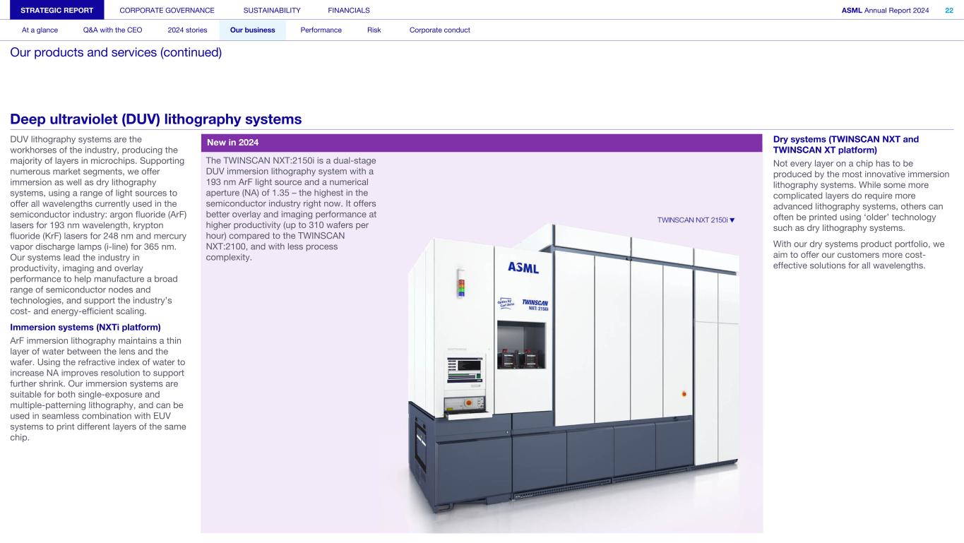 DUV lithography systems are the workhorses of the industry, producing the majority of layers in microchips. Supporting numerous market segments, we offer immersion as well as dry lithography systems, using a range of light sources to offer all wavelengths currently used in the semiconductor industry: argon fluoride (ArF) lasers for 193 nm wavelength, krypton fluoride (KrF) lasers for 248 nm and mercury vapor discharge lamps (i-line) for 365 nm. Our systems lead the industry in productivity, imaging and overlay performance to help manufacture a broad range of semiconductor nodes and technologies, and support the industry’s cost- and energy-efficient scaling. Immersion systems (NXTi platform) ArF immersion lithography maintains a thin layer of water between the lens and the wafer. Using the refractive index of water to increase NA improves resolution to support further shrink. Our immersion systems are suitable for both single-exposure and multiple-patterning lithography, and can be used in seamless combination with EUV systems to print different layers of the same chip. The TWINSCAN NXT:2150i is a dual-stage DUV immersion lithography system with a 193 nm ArF light source and a numerical aperture (NA) of 1.35 – the highest in the semiconductor industry right now. It offers better overlay and imaging performance at higher productivity (up to 310 wafers per hour) compared to the TWINSCAN NXT:2100, and with less process complexity. Dry systems (TWINSCAN NXT and TWINSCAN XT platform) Not every layer on a chip has to be produced by the most innovative immersion lithography systems. While some more complicated layers do require more advanced lithography systems, others can often be printed using ‘older’ technology such as dry lithography systems. With our dry systems product portfolio, we aim to offer our customers more cost- effective solutions for all wavelengths. STRATEGIC REPORT CORPORATE GOVERNANCE SUSTAINABILITY FINANCIALS ASML Annual Report 2024 22 At a glance Q&A with the CEO 2024 stories Our business Performance Risk Corporate conduct Our products and services (continued) Deep ultraviolet (DUV) lithography systems New in 2024