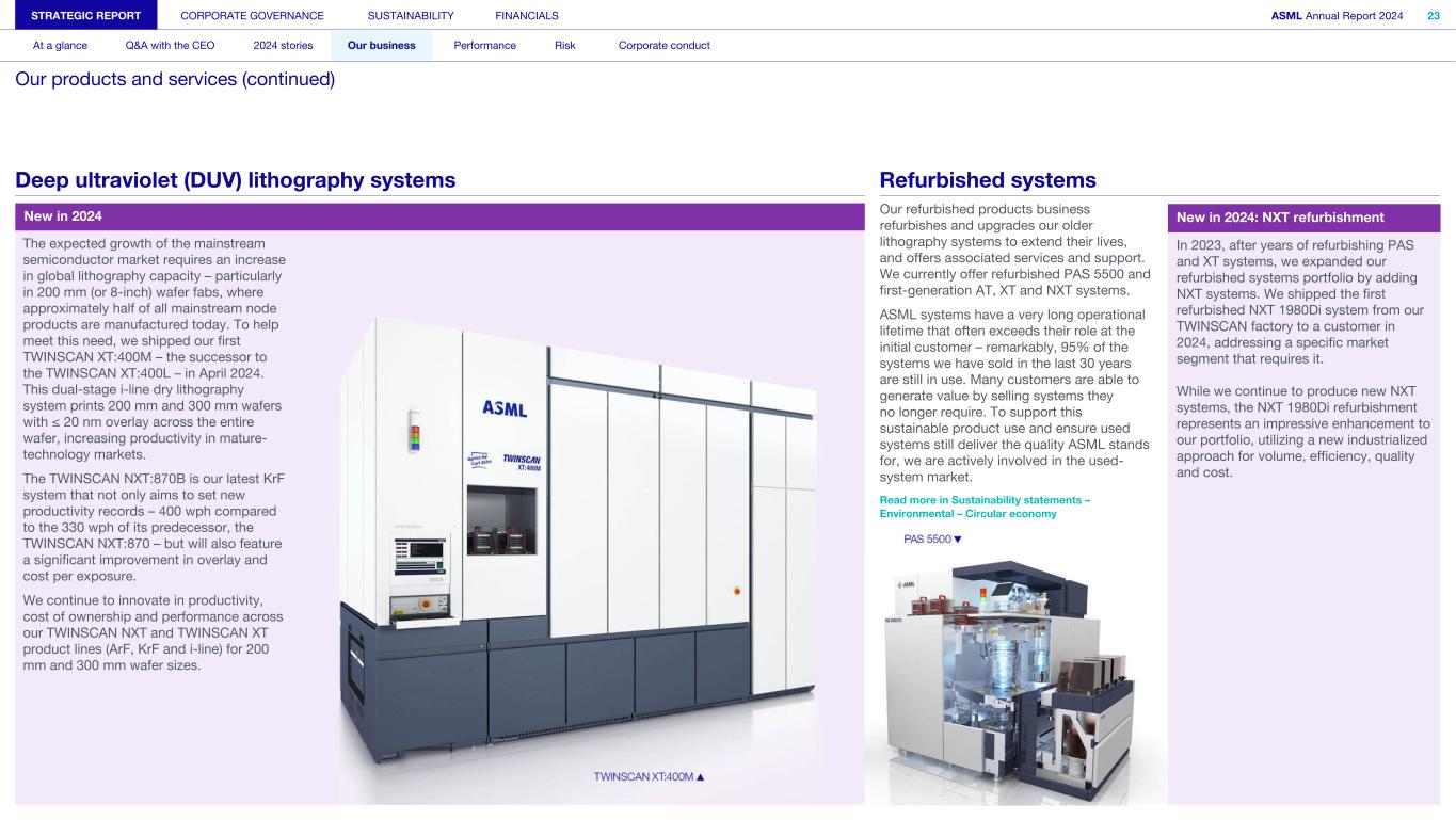 The expected growth of the mainstream semiconductor market requires an increase in global lithography capacity – particularly in 200 mm (or 8-inch) wafer fabs, where approximately half of all mainstream node products are manufactured today. To help meet this need, we shipped our first TWINSCAN XT:400M – the successor to the TWINSCAN XT:400L – in April 2024. This dual-stage i-line dry lithography system prints 200 mm and 300 mm wafers with ≤ 20 nm overlay across the entire wafer, increasing productivity in mature- technology markets. The TWINSCAN NXT:870B is our latest KrF system that not only aims to set new productivity records – 400 wph compared to the 330 wph of its predecessor, the TWINSCAN NXT:870 – but will also feature a significant improvement in overlay and cost per exposure. We continue to innovate in productivity, cost of ownership and performance across our TWINSCAN NXT and TWINSCAN XT product lines (ArF, KrF and i-line) for 200 mm and 300 mm wafer sizes. Our refurbished products business refurbishes and upgrades our older lithography systems to extend their lives, and offers associated services and support. We currently offer refurbished PAS 5500 and first-generation AT, XT and NXT systems. ASML systems have a very long operational lifetime that often exceeds their role at the initial customer – remarkably, 95% of the systems we have sold in the last 30 years are still in use. Many customers are able to generate value by selling systems they no longer require. To support this sustainable product use and ensure used systems still deliver the quality ASML stands for, we are actively involved in the used- system market. Read more in Sustainability statements – Environmental – Circular economy New in 2024: NXT refurbishment In 2023, after years of refurbishing PAS and XT systems, we expanded our refurbished systems portfolio by adding NXT systems. We shipped the first refurbished NXT 1980Di system from our TWINSCAN factory to a customer in 2024, addressing a specific market segment that requires it. While we continue to produce new NXT systems, the NXT 1980Di refurbishment represents an impressive enhancement to our portfolio, utilizing a new industrialized approach for volume, efficiency, quality and cost. STRATEGIC REPORT CORPORATE GOVERNANCE SUSTAINABILITY FINANCIALS ASML Annual Report 2024 23 At a glance Q&A with the CEO 2024 stories Our business Performance Risk Corporate conduct Our products and services (continued) Deep ultraviolet (DUV) lithography systems New in 2024 Refurbished systems