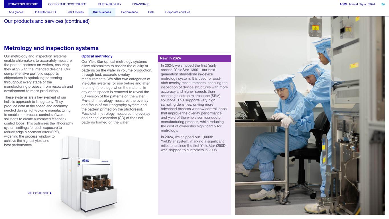 Our metrology and inspection systems enable chipmakers to accurately measure the printed patterns on wafers, ensuring they align with the intended designs. Our comprehensive portfolio supports chipmakers in optimizing patterning throughout every stage of the manufacturing process, from research and development to mass production. These systems are a key element of our holistic approach to lithography. They produce data at the speed and accuracy needed during high-volume manufacturing to enable our process control software solutions to create automated feedback control loops. This optimizes the lithography system settings for each exposure to reduce edge placement error (EPE), widening the process window to achieve the highest yield and best performance. Optical metrology Our YieldStar optical metrology systems allow chipmakers to assess the quality of patterns on the wafer in volume production, through fast, accurate overlay measurements. We offer two categories of YieldStar systems for use before and after ‘etching’ (the stage when the material in any open spaces is removed to reveal the 3D version of the patterns on the wafer). Pre-etch metrology measures the overlay and focus of the lithography system and the pattern printed on the photoresist. Post-etch metrology measures the overlay and critical dimension (CD) of the final patterns formed on the wafer. In 2024, we shipped the first 'early access' YieldStar 1390 – our next- generation standalone in-device metrology system. It is used for post- etch overlay measurements, enabling the inspection of device structures with more accuracy and higher speeds than scanning electron microscope (SEM) solutions. This supports very high sampling densities, driving more advanced process window control loops that improve the overlay performance and yield of the whole semiconductor manufacturing process, while reducing the cost of ownership significantly for metrology. In 2024, we shipped our 1,000th YieldStar system, marking a significant milestone since the first YieldStar (250D) was shipped to customers in 2008. STRATEGIC REPORT CORPORATE GOVERNANCE SUSTAINABILITY FINANCIALS ASML Annual Report 2024 24 At a glance Q&A with the CEO 2024 stories Our business Performance Risk Corporate conduct Our products and services (continued) Metrology and inspection systems New in 2024