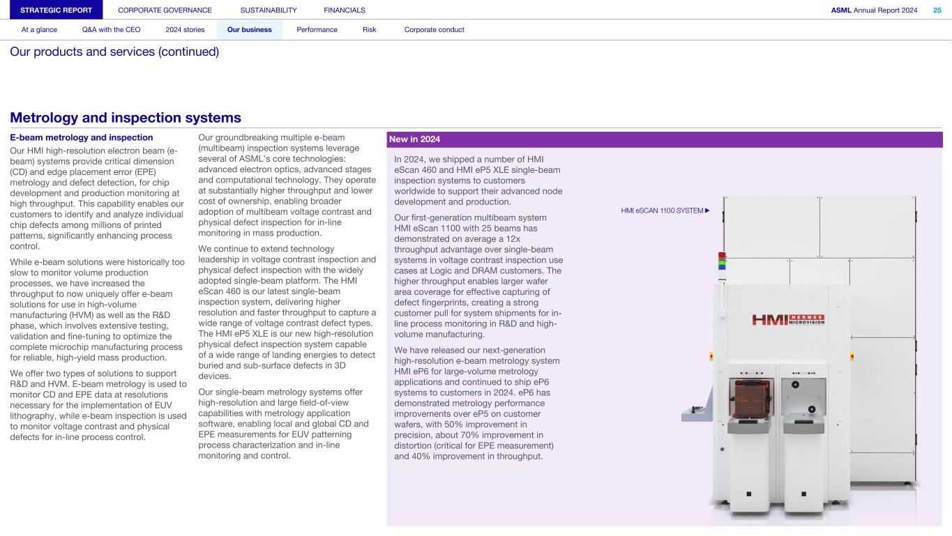 E-beam metrology and inspection Our HMI high-resolution electron beam (e- beam) systems provide critical dimension (CD) and edge placement error (EPE) metrology and defect detection, for chip development and production monitoring at high throughput. This capability enables our customers to identify and analyze individual chip defects among millions of printed patterns, significantly enhancing process control. While e-beam solutions were historically too slow to monitor volume production processes, we have increased the throughput to now uniquely offer e-beam solutions for use in high-volume manufacturing (HVM) as well as the R&D phase, which involves extensive testing, validation and fine-tuning to optimize the complete microchip manufacturing process for reliable, high-yield mass production. We offer two types of solutions to support R&D and HVM. E-beam metrology is used to monitor CD and EPE data at resolutions necessary for the implementation of EUV lithography, while e-beam inspection is used to monitor voltage contrast and physical defects for in-line process control. Our groundbreaking multiple e-beam (multibeam) inspection systems leverage several of ASML’s core technologies: advanced electron optics, advanced stages and computational technology. They operate at substantially higher throughput and lower cost of ownership, enabling broader adoption of multibeam voltage contrast and physical defect inspection for in-line monitoring in mass production. We continue to extend technology leadership in voltage contrast inspection and physical defect inspection with the widely adopted single-beam platform. The HMI eScan 460 is our latest single-beam inspection system, delivering higher resolution and faster throughput to capture a wide range of voltage contrast defect types. The HMI eP5 XLE is our new high-resolution physical defect inspection system capable of a wide range of landing energies to detect buried and sub-surface defects in 3D devices. Our single-beam metrology systems offer high-resolution and large field-of-view capabilities with metrology application software, enabling local and global CD and EPE measurements for EUV patterning process characterization and in-line monitoring and control. In 2024, we shipped a number of HMI eScan 460 and HMI eP5 XLE single-beam inspection systems to customers worldwide to support their advanced node development and production. Our first-generation multibeam system HMI eScan 1100 with 25 beams has demonstrated on average a 12x throughput advantage over single-beam systems in voltage contrast inspection use cases at Logic and DRAM customers. The higher throughput enables larger wafer area coverage for effective capturing of defect fingerprints, creating a strong customer pull for system shipments for in- line process monitoring in R&D and high- volume manufacturing. We have released our next-generation high-resolution e-beam metrology system HMI eP6 for large-volume metrology applications and continued to ship eP6 systems to customers in 2024. eP6 has demonstrated metrology performance improvements over eP5 on customer wafers, with 50% improvement in precision, about 70% improvement in distortion (critical for EPE measurement) and 40% improvement in throughput. STRATEGIC REPORT CORPORATE GOVERNANCE SUSTAINABILITY FINANCIALS ASML Annual Report 2024 25 At a glance Q&A with the CEO 2024 stories Our business Performance Risk Corporate conduct Our products and services (continued) Metrology and inspection systems New in 2024