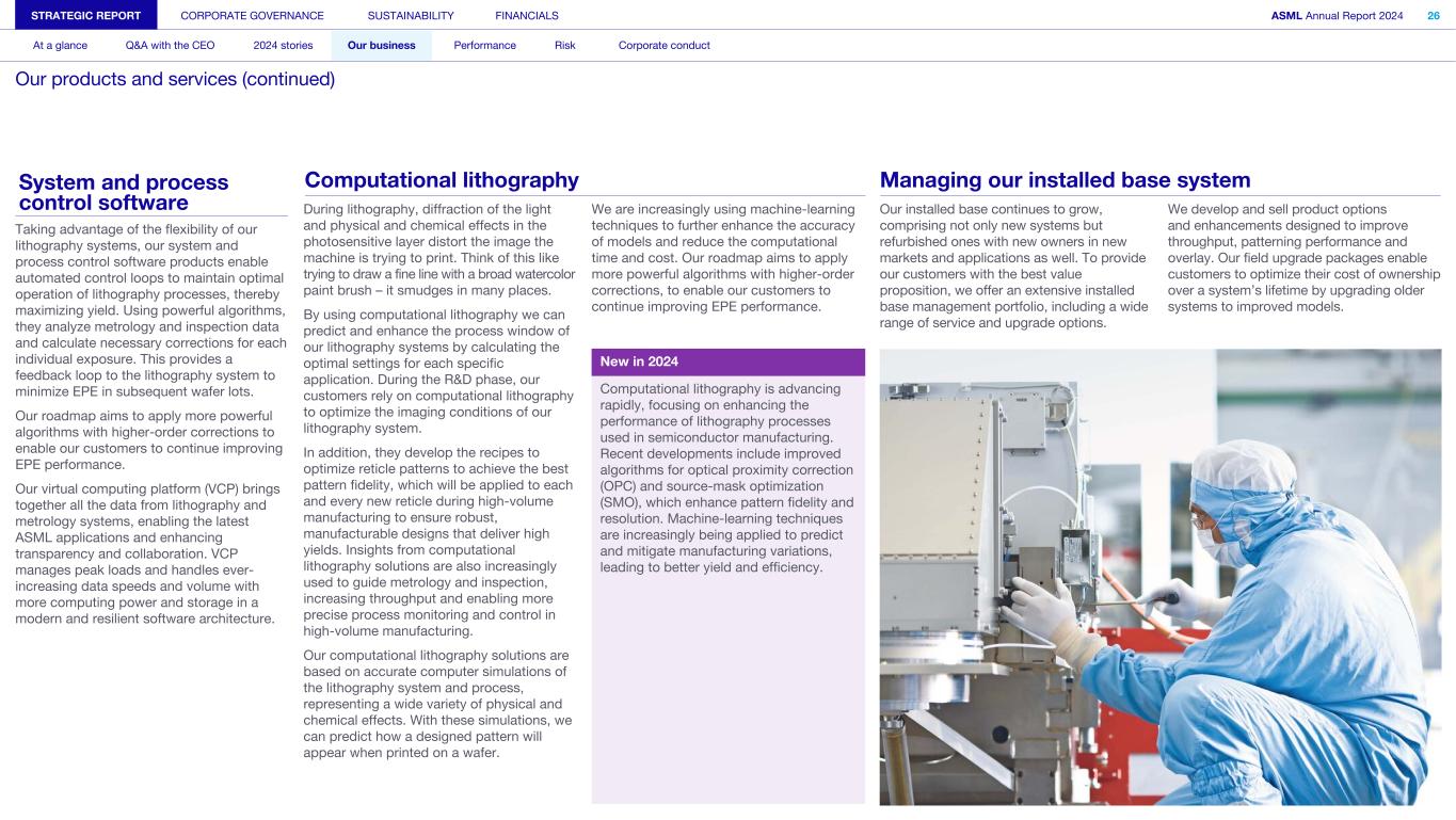 System and process control software Taking advantage of the flexibility of our lithography systems, our system and process control software products enable automated control loops to maintain optimal operation of lithography processes, thereby maximizing yield. Using powerful algorithms, they analyze metrology and inspection data and calculate necessary corrections for each individual exposure. This provides a feedback loop to the lithography system to minimize EPE in subsequent wafer lots. Our roadmap aims to apply more powerful algorithms with higher-order corrections to enable our customers to continue improving EPE performance. Our virtual computing platform (VCP) brings together all the data from lithography and metrology systems, enabling the latest ASML applications and enhancing transparency and collaboration. VCP manages peak loads and handles ever- increasing data speeds and volume with more computing power and storage in a modern and resilient software architecture. During lithography, diffraction of the light and physical and chemical effects in the photosensitive layer distort the image the machine is trying to print. Think of this like trying to draw a fine line with a broad watercolor paint brush – it smudges in many places. By using computational lithography we can predict and enhance the process window of our lithography systems by calculating the optimal settings for each specific application. During the R&D phase, our customers rely on computational lithography to optimize the imaging conditions of our lithography system. In addition, they develop the recipes to optimize reticle patterns to achieve the best pattern fidelity, which will be applied to each and every new reticle during high-volume manufacturing to ensure robust, manufacturable designs that deliver high yields. Insights from computational lithography solutions are also increasingly used to guide metrology and inspection, increasing throughput and enabling more precise process monitoring and control in high-volume manufacturing. Our computational lithography solutions are based on accurate computer simulations of the lithography system and process, representing a wide variety of physical and chemical effects. With these simulations, we can predict how a designed pattern will appear when printed on a wafer. We are increasingly using machine-learning techniques to further enhance the accuracy of models and reduce the computational time and cost. Our roadmap aims to apply more powerful algorithms with higher-order corrections, to enable our customers to continue improving EPE performance. Our installed base continues to grow, comprising not only new systems but refurbished ones with new owners in new markets and applications as well. To provide our customers with the best value proposition, we offer an extensive installed base management portfolio, including a wide range of service and upgrade options. We develop and sell product options and enhancements designed to improve throughput, patterning performance and overlay. Our field upgrade packages enable customers to optimize their cost of ownership over a system’s lifetime by upgrading older systems to improved models. STRATEGIC REPORT CORPORATE GOVERNANCE SUSTAINABILITY FINANCIALS ASML Annual Report 2024 26 At a glance Q&A with the CEO 2024 stories Our business Performance Risk Corporate conduct Our products and services (continued) Computational lithography Managing our installed base system New in 2024 Computational lithography is advancing rapidly, focusing on enhancing the performance of lithography processes used in semiconductor manufacturing. Recent developments include improved algorithms for optical proximity correction (OPC) and source-mask optimization (SMO), which enhance pattern fidelity and resolution. Machine-learning techniques are increasingly being applied to predict and mitigate manufacturing variations, leading to better yield and efficiency.