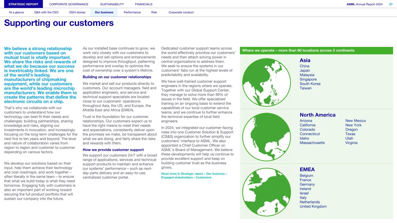 We believe a strong relationship with our customers based on mutual trust is vitally important. We share the risks and rewards of what we do because our success is inextricably linked. We are one of the world’s leading manufacturers of chipmaking equipment, while our customers are the world’s leading microchip manufacturers. We enable them to create the patterns that define the electronic circuits on a chip. That’s why we collaborate with our customers to understand how our technology can best fit their needs and challenges: building partnerships, sharing knowledge and risks, aligning our investments in innovation, and increasingly focusing on the long-term challenges for the next five to ten years and beyond. The level and nature of collaboration varies from region to region and customer to customer depending on various factors. We develop our solutions based on their input, help them achieve their technology and cost roadmaps, and work together – often literally in the same team – to ensure that what we build today is what they need tomorrow. Engaging fully with customers is also an important part of working toward securing the full product portfolio that will sustain our company into the future. As our installed base continues to grow, we work very closely with our customers to develop and sell options and enhancements designed to improve throughput, patterning performance and overlay to optimize the cost of ownership over a system’s lifetime. Building on our customer relationships We market and sell our products directly to customers. Our account managers, field and application engineers, and service and technical support specialists are located close to our customers’ operations throughout Asia, the US, and Europe, the Middle East and Africa (EMEA). Trust is the foundation for our customer relationships. Our customers expect us to have the right means to meet their needs and expectations, consistently deliver upon the promises we make, be transparent about what we are doing, and fairly share the risks and rewards with them. How we provide customer support We support our customers 24/7 with a broad range of applications, services and technical support products to maintain and enhance our systems’ performance – such as next- day parts delivery and an easy-to-use, centralized customer portal. Dedicated customer support teams across the world effectively prioritize our customers’ needs and then attach solving power in central organizations to address them. We seek to ensure the systems in our customers’ fabs run at the highest levels of predictability and availability. We have well-trained customer support engineers in the regions where we operate. Together with our Global Support Center, they manage to solve more than 99% of issues in the field. We offer specialized training on an ongoing basis to extend the capabilities of our local customer service teams, and we continue to further enhance the technical expertise of local field engineers. In 2024, we integrated our customer-facing roles into one Customer Solution & Support (CS&S) organization to further simplify our customers’ interface to ASML. We also appointed a Chief Customer Officer on ASML’s Board of Management. We believe these developments will help us continue to provide excellent support and keep on building customer trust as the business grows. Read more in Strategic report – Our business – Engaged stakeholders – Customers STRATEGIC REPORT CORPORATE GOVERNANCE SUSTAINABILITY FINANCIALS ASML Annual Report 2024 27 At a glance Q&A with the CEO 2024 stories Our business Performance Risk Corporate conduct Supporting our customers Where we operate – more than 60 locations across 3 continents Asia China Japan Malaysia Singapore South Korea Taiwan North America Arizona California Colorado Connecticut Idaho Massachusetts New Mexico New York Oregon Texas Utah Virginia EMEA Belgium France Germany Ireland Israel Italy Netherlands United Kingdom