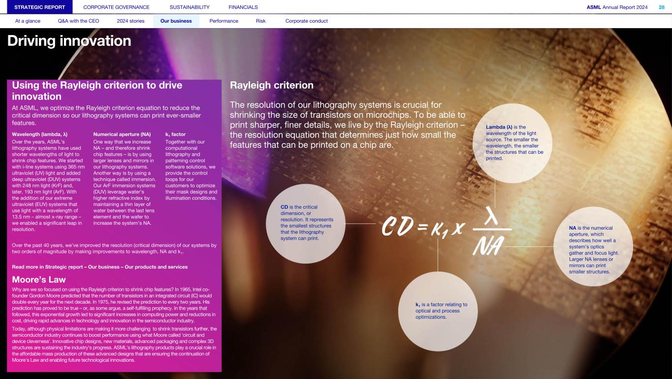 Using the Rayleigh criterion to drive innovation At ASML, we optimize the Rayleigh criterion equation to reduce the critical dimension so our lithography systems can print ever-smaller features. Wavelength (lambda, λ) Numerical aperture (NA) k1 factor Over the years, ASML’s lithography systems have used shorter wavelengths of light to shrink chip features. We started with i-line systems using 365 nm ultraviolet (UV) light and added deep ultraviolet (DUV) systems with 248 nm light (KrF) and, later, 193 nm light (ArF). With the addition of our extreme ultraviolet (EUV) systems that use light with a wavelength of 13.5 nm – almost x-ray range – we enabled a significant leap in resolution. One way that we increase NA – and therefore shrink chip features – is by using larger lenses and mirrors in our lithography systems. Another way is by using a technique called immersion. Our ArF immersion systems (DUV) leverage water’s higher refractive index by maintaining a thin layer of water between the last lens element and the wafer to increase the system’s NA. Together with our computational lithography and patterning control software solutions, we provide the control loops for our customers to optimize their mask designs and illumination conditions. Over the past 40 years, we’ve improved the resolution (critical dimension) of our systems by two orders of magnitude by making improvements to wavelength, NA and k1. Read more in Strategic report – Our business – Our products and services Moore’s Law Why are we so focused on using the Rayleigh criterion to shrink chip features? In 1965, Intel co- founder Gordon Moore predicted that the number of transistors in an integrated circuit (IC) would double every year for the next decade. In 1975, he revised the prediction to every two years. His prediction has proved to be true – or, as some argue, a self-fulfilling prophecy. In the years that followed, this exponential growth led to significant increases in computing power and reductions in cost, driving rapid advances in technology and innovation in the semiconductor industry. Today, although physical limitations are making it more challenging to shrink transistors further, the semiconductor industry continues to boost performance using what Moore called ‘circuit and device cleverness’. Innovative chip designs, new materials, advanced packaging and complex 3D structures are sustaining the industry’s progress. ASML's lithography products play a crucial role in the affordable mass production of these advanced designs that are ensuring the continuation of Moore's Law and enabling future technological innovations. STRATEGIC REPORT CORPORATE GOVERNANCE SUSTAINABILITY FINANCIALS ASML Annual Report 2024 28 At a glance Q&A with the CEO 2024 stories Our business Performance Risk Corporate conduct Driving innovation Rayleigh criterion The resolution of our lithography systems is crucial for shrinking the size of transistors on microchips. To be able to print sharper, finer details, we live by the Rayleigh criterion – the resolution equation that determines just how small the features that can be printed on a chip are. CD is the critical dimension, or resolution. It represents the smallest structures that the lithography system can print. Lambda (λ) is the wavelength of the light source. The smaller the wavelength, the smaller the structures that can be printed. k1 is a factor relating to optical and process optimizations. NA is the numerical aperture, which describes how well a system’s optics gather and focus light. Larger NA lenses or mirrors can print smaller structures.