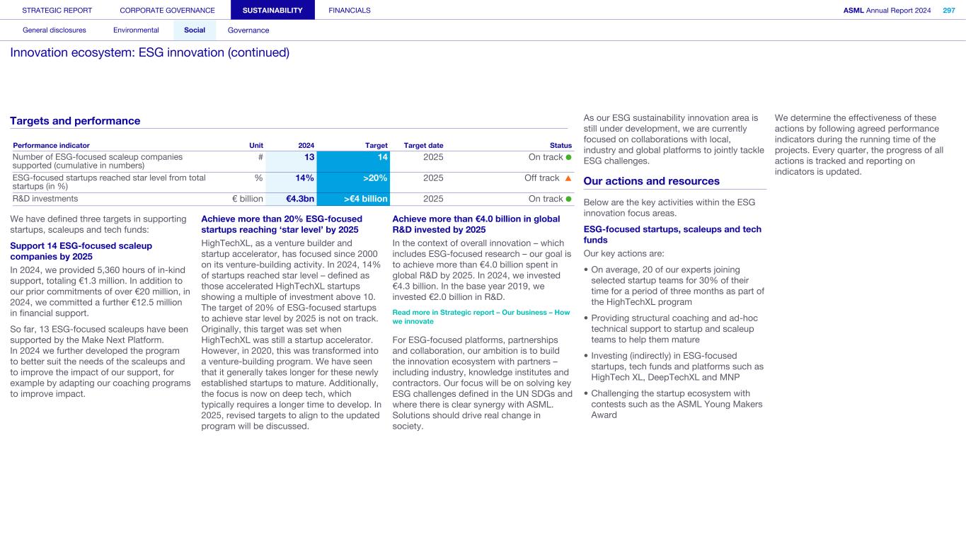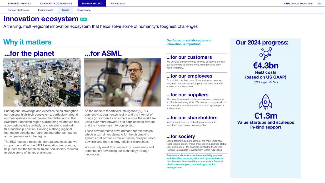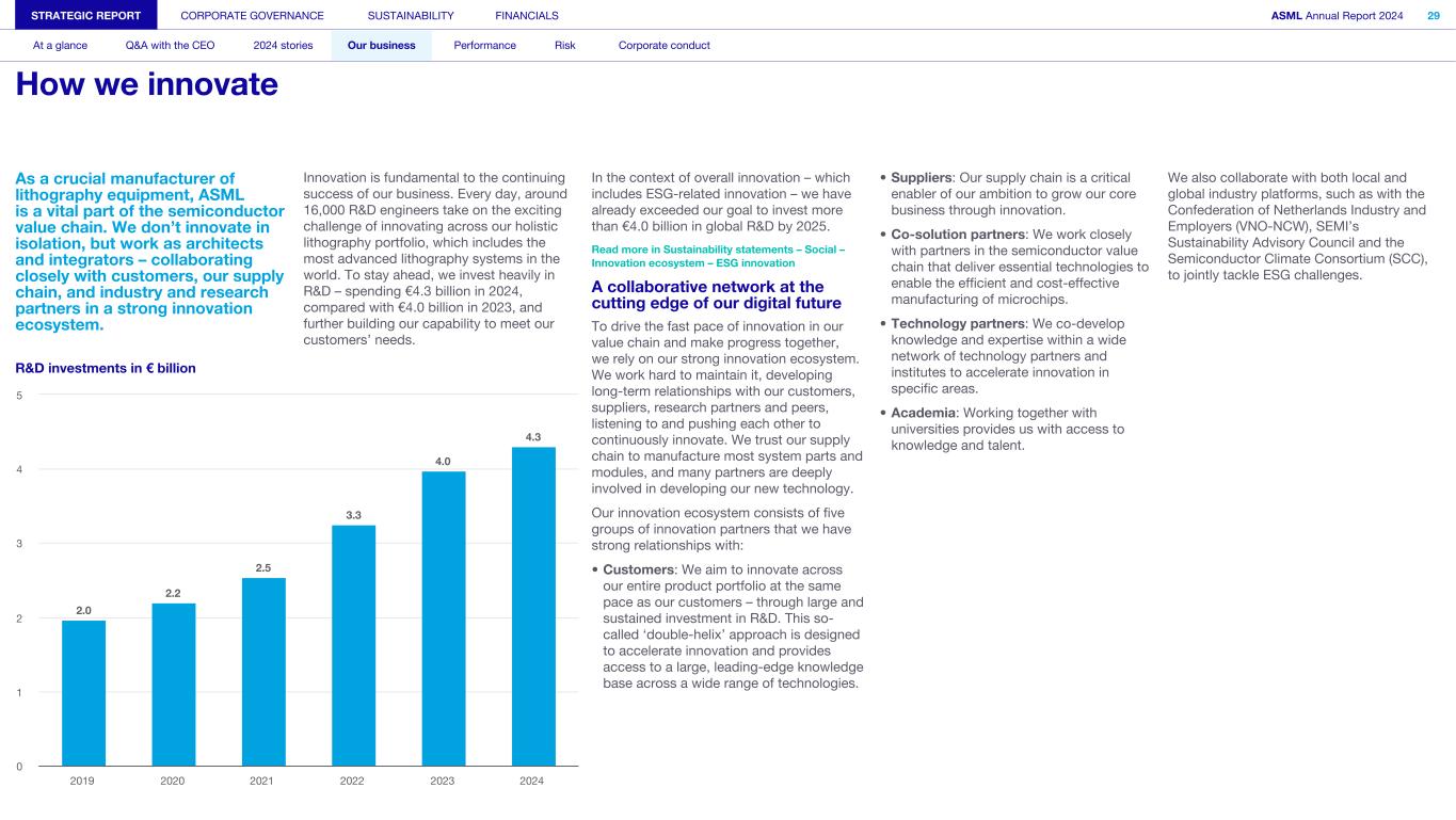 As a crucial manufacturer of lithography equipment, ASML is a vital part of the semiconductor value chain. We don’t innovate in isolation, but work as architects and integrators – collaborating closely with customers, our supply chain, and industry and research partners in a strong innovation ecosystem. R&D investments in € billion 2.0 2.2 2.5 3.3 4.0 4.3 2019 2020 2021 2022 2023 2024 0 1 2 3 4 5 Innovation is fundamental to the continuing success of our business. Every day, around 16,000 R&D engineers take on the exciting challenge of innovating across our holistic lithography portfolio, which includes the most advanced lithography systems in the world. To stay ahead, we invest heavily in R&D – spending €4.3 billion in 2024, compared with €4.0 billion in 2023, and further building our capability to meet our customers’ needs. In the context of overall innovation – which includes ESG-related innovation – we have already exceeded our goal to invest more than €4.0 billion in global R&D by 2025. Read more in Sustainability statements – Social – Innovation ecosystem – ESG innovation A collaborative network at the cutting edge of our digital future To drive the fast pace of innovation in our value chain and make progress together, we rely on our strong innovation ecosystem. We work hard to maintain it, developing long-term relationships with our customers, suppliers, research partners and peers, listening to and pushing each other to continuously innovate. We trust our supply chain to manufacture most system parts and modules, and many partners are deeply involved in developing our new technology. Our innovation ecosystem consists of five groups of innovation partners that we have strong relationships with: • Customers: We aim to innovate across our entire product portfolio at the same pace as our customers – through large and sustained investment in R&D. This so- called ‘double-helix’ approach is designed to accelerate innovation and provides access to a large, leading-edge knowledge base across a wide range of technologies. • Suppliers: Our supply chain is a critical enabler of our ambition to grow our core business through innovation. • Co-solution partners: We work closely with partners in the semiconductor value chain that deliver essential technologies to enable the efficient and cost-effective manufacturing of microchips. • Technology partners: We co-develop knowledge and expertise within a wide network of technology partners and institutes to accelerate innovation in specific areas. • Academia: Working together with universities provides us with access to knowledge and talent. We also collaborate with both local and global industry platforms, such as with the Confederation of Netherlands Industry and Employers (VNO-NCW), SEMI’s Sustainability Advisory Council and the Semiconductor Climate Consortium (SCC), to jointly tackle ESG challenges. STRATEGIC REPORT CORPORATE GOVERNANCE SUSTAINABILITY FINANCIALS ASML Annual Report 2024 29 At a glance Q&A with the CEO 2024 stories Our business Performance Risk Corporate conduct How we innovate
