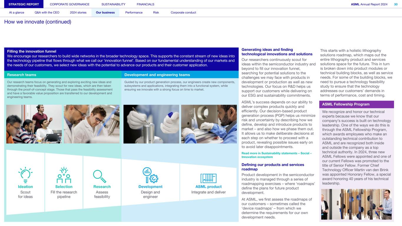 STRATEGIC REPORT CORPORATE GOVERNANCE SUSTAINABILITY FINANCIALS ASML Annual Report 2024 30 At a glance Q&A with the CEO 2024 stories Our business Performance Risk Corporate conduct How we innovate (continued) Filling the innovation funnel We encourage our researchers to build wide networks in the broader technology space. This supports the constant stream of new ideas into the technology pipeline that flows through what we call our ‘innovation funnel’. Based on our fundamental understanding of our markets and the needs of our customers, we select new ideas with the potential to advance our products and their customer application. Research teams Development and engineering teams Our research teams focus on generating and exploring exciting new ideas and demonstrating their feasibility. They scout for new ideas, which are then taken through the proof-of-concept stage. Those that pass the feasibility assessment and have a favorable value proposition are transferred to our development and engineering teams. Guided by our product generation process, our engineers create new components, subsystems and applications, integrating them into a functional system, while ensuring we innovate with a strong focus on time to market. Generating ideas and finding technological innovations and solutions Our researchers continuously scout for ideas within the semiconductor industry and beyond to fill our innovation funnel, searching for potential solutions to the challenges we may face with products in development or production as well as new technologies. Our focus on R&D helps us support our customers while delivering on our ESG and sustainability commitments. ASML’s success depends on our ability to deliver complex products quickly and efficiently. Our decision-based product generation process (PGP) helps us minimize risk and uncertainty by describing how we define, develop and introduce products to market – and also how we phase them out. It allows us to make deliberate decisions at each step on whether to proceed with a product, revealing possible issues early on to avoid later disappointments. Read more in Sustainability statements – Social – Innovation ecosystem Defining our products and services roadmap Product development in the semiconductor industry is managed through a series of roadmapping exercises – where ‘roadmaps’ define the plans for future product development. At ASML, we first assess the roadmaps of our customers – sometimes called the ‘device roadmaps’ – from which we determine the requirements for our own development needs. This starts with a holistic lithography solutions roadmap, which maps out the entire lithography product and services solutions space for the future. This in turn is broken down into product modules or technical building blocks, as well as service needs. For some of the building blocks, we need to pursue a technology feasibility study to ensure that the technology addresses our customers’ demands in terms of performance, cost and timing. ASML Fellowship Program We recognize and honor our technical experts because we know that our company’s success is built on technology leadership. One of the ways we do this is through the ASML Fellowship Program, which awards employees who make an outstanding technical contribution to ASML and are recognized both inside and outside the company as a top technical authority. In 2024, three new ASML Fellows were appointed and one of our current Fellows was promoted to the title of Senior Fellow. Former Chief Technology Officer Martin van den Brink was appointed Honorary Fellow, a special award honoring 40 years of his technical leadership.