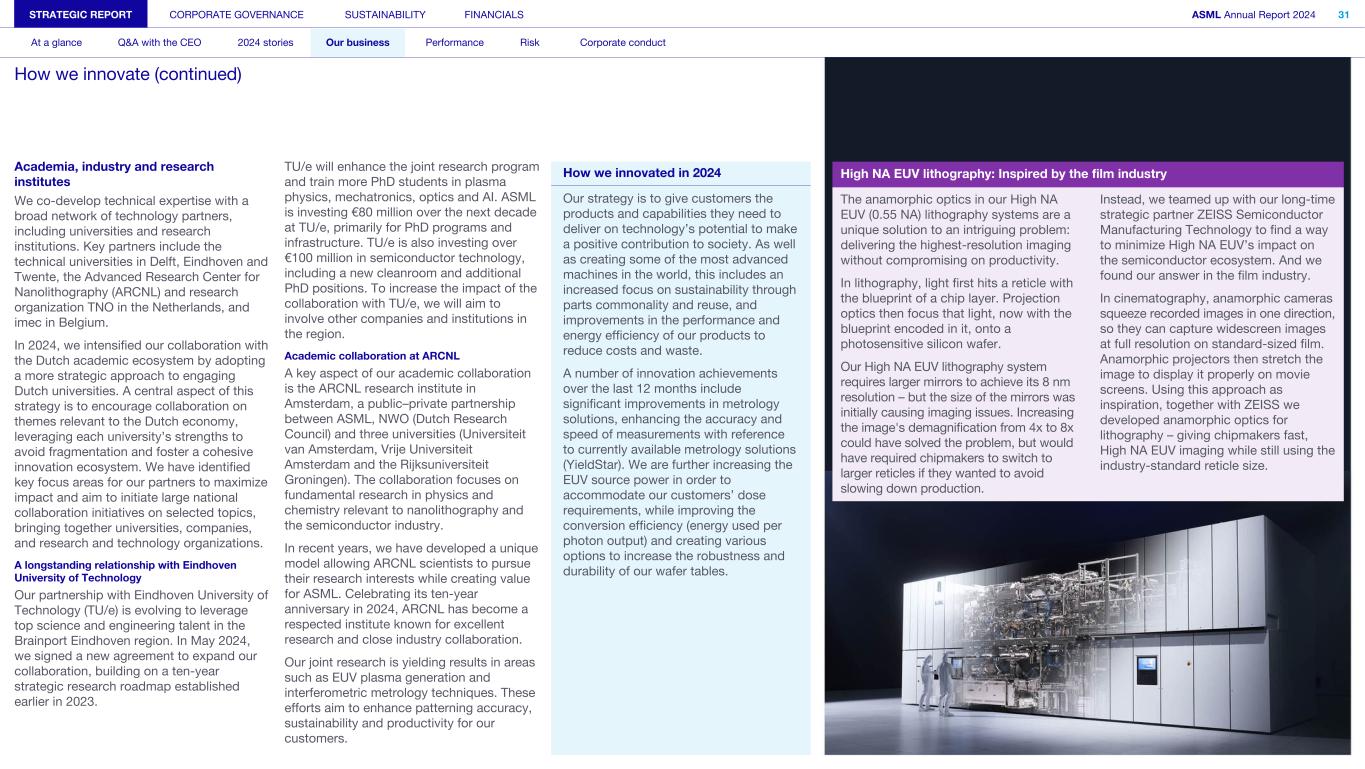Academia, industry and research institutes We co-develop technical expertise with a broad network of technology partners, including universities and research institutions. Key partners include the technical universities in Delft, Eindhoven and Twente, the Advanced Research Center for Nanolithography (ARCNL) and research organization TNO in the Netherlands, and imec in Belgium. In 2024, we intensified our collaboration with the Dutch academic ecosystem by adopting a more strategic approach to engaging Dutch universities. A central aspect of this strategy is to encourage collaboration on themes relevant to the Dutch economy, leveraging each university’s strengths to avoid fragmentation and foster a cohesive innovation ecosystem. We have identified key focus areas for our partners to maximize impact and aim to initiate large national collaboration initiatives on selected topics, bringing together universities, companies, and research and technology organizations. A longstanding relationship with Eindhoven University of Technology Our partnership with Eindhoven University of Technology (TU/e) is evolving to leverage top science and engineering talent in the Brainport Eindhoven region. In May 2024, we signed a new agreement to expand our collaboration, building on a ten-year strategic research roadmap established earlier in 2023. TU/e will enhance the joint research program and train more PhD students in plasma physics, mechatronics, optics and AI. ASML is investing €80 million over the next decade at TU/e, primarily for PhD programs and infrastructure. TU/e is also investing over €100 million in semiconductor technology, including a new cleanroom and additional PhD positions. To increase the impact of the collaboration with TU/e, we will aim to involve other companies and institutions in the region. Academic collaboration at ARCNL A key aspect of our academic collaboration is the ARCNL research institute in Amsterdam, a public–private partnership between ASML, NWO (Dutch Research Council) and three universities (Universiteit van Amsterdam, Vrije Universiteit Amsterdam and the Rijksuniversiteit Groningen). The collaboration focuses on fundamental research in physics and chemistry relevant to nanolithography and the semiconductor industry. In recent years, we have developed a unique model allowing ARCNL scientists to pursue their research interests while creating value for ASML. Celebrating its ten-year anniversary in 2024, ARCNL has become a respected institute known for excellent research and close industry collaboration. Our joint research is yielding results in areas such as EUV plasma generation and interferometric metrology techniques. These efforts aim to enhance patterning accuracy, sustainability and productivity for our customers. STRATEGIC REPORT CORPORATE GOVERNANCE SUSTAINABILITY FINANCIALS ASML Annual Report 2024 31 At a glance Q&A with the CEO 2024 stories Our business Performance Risk Corporate conduct How we innovate (continued) How we innovated in 2024 Our strategy is to give customers the products and capabilities they need to deliver on technology’s potential to make a positive contribution to society. As well as creating some of the most advanced machines in the world, this includes an increased focus on sustainability through parts commonality and reuse, and improvements in the performance and energy efficiency of our products to reduce costs and waste. A number of innovation achievements over the last 12 months include significant improvements in metrology solutions, enhancing the accuracy and speed of measurements with reference to currently available metrology solutions (YieldStar). We are further increasing the EUV source power in order to accommodate our customers’ dose requirements, while improving the conversion efficiency (energy used per photon output) and creating various options to increase the robustness and durability of our wafer tables. High NA EUV lithography: Inspired by the film industry The anamorphic optics in our High NA EUV (0.55 NA) lithography systems are a unique solution to an intriguing problem: delivering the highest-resolution imaging without compromising on productivity. In lithography, light first hits a reticle with the blueprint of a chip layer. Projection optics then focus that light, now with the blueprint encoded in it, onto a photosensitive silicon wafer. Our High NA EUV lithography system requires larger mirrors to achieve its 8 nm resolution – but the size of the mirrors was initially causing imaging issues. Increasing the image's demagnification from 4x to 8x could have solved the problem, but would have required chipmakers to switch to larger reticles if they wanted to avoid slowing down production. Instead, we teamed up with our long-time strategic partner ZEISS Semiconductor Manufacturing Technology to find a way to minimize High NA EUV’s impact on the semiconductor ecosystem. And we found our answer in the film industry. In cinematography, anamorphic cameras squeeze recorded images in one direction, so they can capture widescreen images at full resolution on standard-sized film. Anamorphic projectors then stretch the image to display it properly on movie screens. Using this approach as inspiration, together with ZEISS we developed anamorphic optics for lithography – giving chipmakers fast, High NA EUV imaging while still using the industry-standard reticle size.