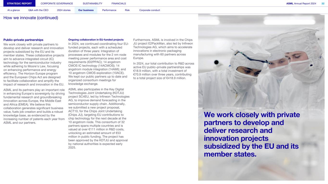 Public–private partnerships We work closely with private partners to develop and deliver research and innovation projects subsidized by the EU and its member states. These collaborative projects aim to advance integrated circuit (IC) technology for the semiconductor industry while adhering to Moore's Law, focusing on enhancing performance and energy efficiency. The Horizon Europe program and the European Chips Act are designed to facilitate collaboration and amplify the impact of research and innovation in the EU. ASML and its partners play an important role in enhancing Europe's sovereignty by driving fundamental research and groundbreaking innovation across Europe, the Middle East and Africa (EMEA). We believe this collaboration generates significant business value, fuels job creation and builds a robust knowledge base, as evidenced by the increasing number of patents each year from ASML and our partners. Ongoing collaboration in EU-funded projects In 2024, we continued coordinating four EU- funded projects, each with a scheduled duration of three years: Integration of processes and modules for the 2 nm node meeting power performance area and cost requirements (ID2PPAC); 14 angstrom CMOS IC technology (14ACMOS); 14 angstrom module integration (14AMI); and 10 angstrom CMOS exploration (10ACE). We kept our public partners up to date and organized consortium meetings for knowledge exchange. ASML also participates in the Key Digital Technologies Joint Undertaking (KDTJU) project SC4EU, led by Infineon Technologies AG, to improve demand forecasting in the semiconductor supply chain. Additionally, we submitted a new project proposal, ACT10, for the Chips Joint Undertaking (Chips JU), targeting EU contributions to chip technology for the next decade at the 10 angstrom node. This consortium of 32 partners spans multiple countries and is valued at over €111 million in R&D costs, unlocking an estimated amount of €53 million in public funding. The project has been approved by the KDTJU and approval by national authorities is expected early 2025. Furthermore, ASML is involved in the Chips JU project E2PackMan, also led by Infineon Technologies AG, which aims to accelerate innovations in electronic packaging manufacturing with 60 partners across Europe. In 2024, our total contribution to R&D across active EU public–private partnerships was €18.9 million, with a total investment of €70.9 million over three years, contributing to a total project size of €418.9 million. STRATEGIC REPORT CORPORATE GOVERNANCE SUSTAINABILITY FINANCIALS ASML Annual Report 2024 32 At a glance Q&A with the CEO 2024 stories Our business Performance Risk Corporate conduct How we innovate (continued) We work closely with private partners to develop and deliver research and innovation projects subsidized by the EU and its member states.