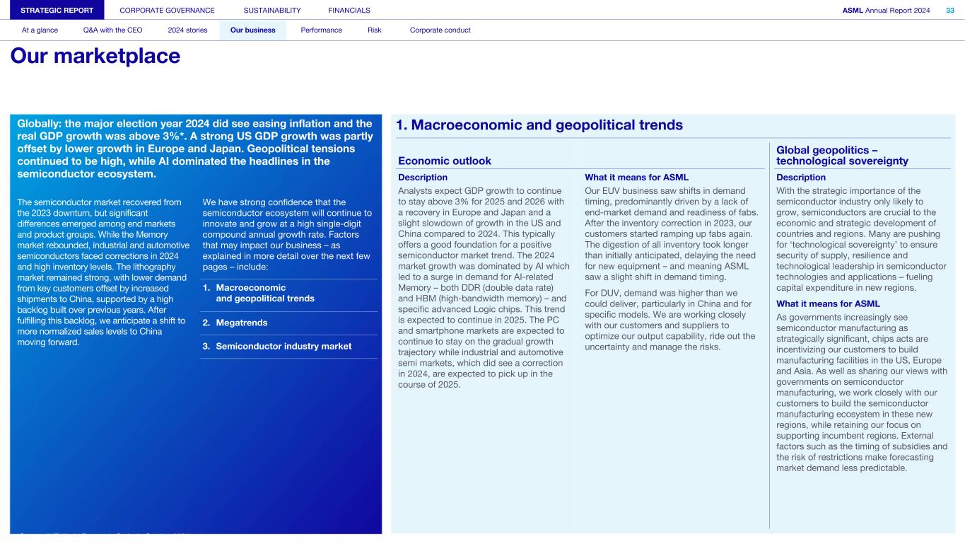 STRATEGIC REPORT CORPORATE GOVERNANCE SUSTAINABILITY FINANCIALS ASML Annual Report 2024 33 At a glance Q&A with the CEO 2024 stories Our business Performance Risk Corporate conduct Our marketplace Globally: the major election year 2024 did see easing inflation and the real GDP growth was above 3%*. A strong US GDP growth was partly offset by lower growth in Europe and Japan. Geopolitical tensions continued to be high, while AI dominated the headlines in the semiconductor ecosystem. The semiconductor market recovered from the 2023 downturn, but significant differences emerged among end markets and product groups. While the Memory market rebounded, industrial and automotive semiconductors faced corrections in 2024 and high inventory levels. The lithography market remained strong, with lower demand from key customers offset by increased shipments to China, supported by a high backlog built over previous years. After fulfilling this backlog, we anticipate a shift to more normalized sales levels to China moving forward. We have strong confidence that the semiconductor ecosystem will continue to innovate and grow at a high single-digit compound annual growth rate. Factors that may impact our business – as explained in more detail over the next few pages – include: 1. Macroeconomic and geopolitical trends 2. Megatrends 3. Semiconductor industry market *Source: IMF World Economic Outlook, October 2024 1. Macroeconomic and geopolitical trends Economic outlook Global geopolitics – technological sovereignty Description Analysts expect GDP growth to continue to stay above 3% for 2025 and 2026 with a recovery in Europe and Japan and a slight slowdown of growth in the US and China compared to 2024. This typically offers a good foundation for a positive semiconductor market trend. The 2024 market growth was dominated by AI which led to a surge in demand for AI-related Memory – both DDR (double data rate) and HBM (high-bandwidth memory) – and specific advanced Logic chips. This trend is expected to continue in 2025. The PC and smartphone markets are expected to continue to stay on the gradual growth trajectory while industrial and automotive semi markets, which did see a correction in 2024, are expected to pick up in the course of 2025. What it means for ASML Our EUV business saw shifts in demand timing, predominantly driven by a lack of end-market demand and readiness of fabs. After the inventory correction in 2023, our customers started ramping up fabs again. The digestion of all inventory took longer than initially anticipated, delaying the need for new equipment – and meaning ASML saw a slight shift in demand timing. For DUV, demand was higher than we could deliver, particularly in China and for specific models. We are working closely with our customers and suppliers to optimize our output capability, ride out the uncertainty and manage the risks. Description With the strategic importance of the semiconductor industry only likely to grow, semiconductors are crucial to the economic and strategic development of countries and regions. Many are pushing for ‘technological sovereignty’ to ensure security of supply, resilience and technological leadership in semiconductor technologies and applications – fueling capital expenditure in new regions. What it means for ASML As governments increasingly see semiconductor manufacturing as strategically significant, chips acts are incentivizing our customers to build manufacturing facilities in the US, Europe and Asia. As well as sharing our views with governments on semiconductor manufacturing, we work closely with our customers to build the semiconductor manufacturing ecosystem in these new regions, while retaining our focus on supporting incumbent regions. External factors such as the timing of subsidies and the risk of restrictions make forecasting market demand less predictable.