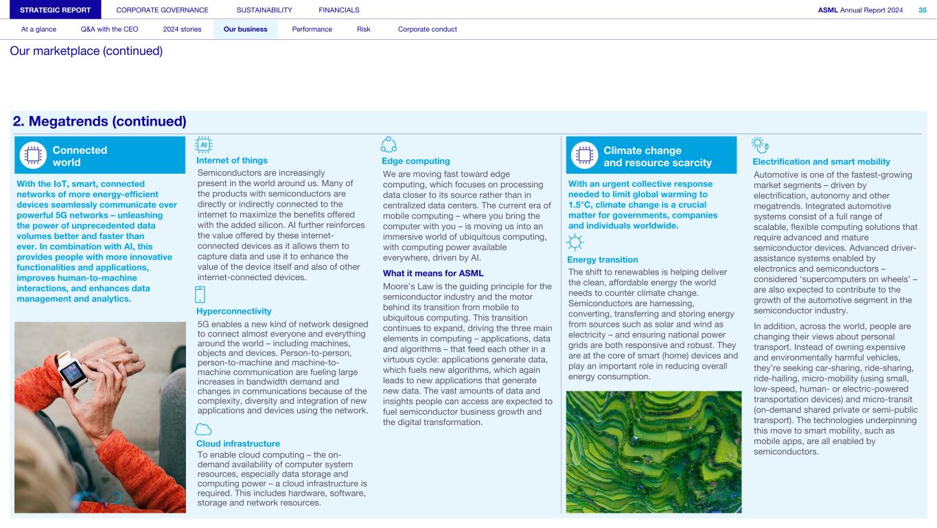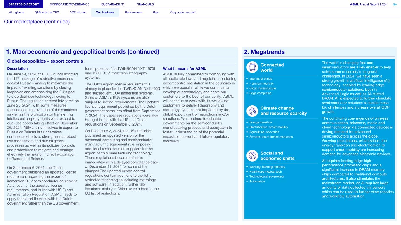 STRATEGIC REPORT CORPORATE GOVERNANCE SUSTAINABILITY FINANCIALS ASML Annual Report 2024 34 At a glance Q&A with the CEO 2024 stories Our business Performance Risk Corporate conduct Our marketplace (continued) 1. Macroeconomic and geopolitical trends (continued) Global geopolitics – export controls Description On June 24, 2024, the EU Council adopted the 14th package of restrictive measures against Russia – aiming to maximize the impact of existing sanctions by closing loopholes and emphasizing the EU’s goal to stop dual-use technology flowing to Russia. The regulation entered into force on June 25, 2024, with some measures focused on circumvention of the sanctions as well as the prohibition on transferring intellectual property rights with respect to dual-use goods taking effect on December 26, 2024. ASML is not involved in export to Russia or Belarus but undertakes continuous efforts to strengthen its robust risk assessment and due diligence processes as well as its policies, controls and procedures to mitigate and manage effectively the risks of indirect exportation to Russia and Belarus. On September 6, 2024, the Dutch government published an updated license requirement regarding the export of immersion DUV semiconductor equipment. As a result of the updated license requirements, and in line with US Export Administration Regulation, ASML needs to apply for export licenses with the Dutch government rather than the US government for shipments of its TWINSCAN NXT:1970i and 1980i DUV immersion lithography systems. The Dutch export license requirement is already in place for the TWINSCAN NXT:2000i and subsequent DUV immersion systems. Sales of ASML’s EUV systems are also subject to license requirements. The updated license requirement published by the Dutch government came into effect from September 7, 2024. The Japanese regulations were also brought in line with the US and Dutch regulations on September 8, 2024. On December 2, 2024, the US authorities published an updated version of the advanced computing and semiconductor manufacturing equipment rule, imposing additional restrictions on suppliers for the export of chip manufacturing technology. These regulations became effective immediately with a delayed compliance date of December 31, 2024 for some of the changes.The updated export control regulations contain additions to the list of restricted technologies including metrology and software. In addition, further fab locations, mainly in China, were added to the US list of restrictions. What it means for ASML ASML is fully committed to complying with all applicable laws and regulations including export control legislation in the countries in which we operate, while we continue to develop our technology and serve our customers to the best of our ability. ASML will continue to work with its worldwide customers to deliver lithography and metrology systems not impacted by the global export control restrictions and/or sanctions. We continue to educate governments on the semiconductor manufacturing process and ecosystem to foster understanding of the potential impacts of current and future regulatory measures. 2. Megatrends The world is changing fast and semiconductors are a key enabler to help solve some of society's toughest challenges. In 2024, we have seen a strong growth in artificial intelligence (AI) technology, enabled by leading-edge semiconductor solutions, both in Advanced Logic as well as AI-related DRAM. AI is expected to further stimulate semiconductor solutions to tackle these big challenges and increase overall GDP growth. The continuing convergence of wireless communication, telecoms, media and cloud technology via connected devices is driving demand for advanced semiconductors across the globe. Growing populations, urbanization, the energy transition and electrification to support smart mobility are increasing demand for advanced electronic devices. AI requires leading-edge high- performance processor chips and a significant increase in DRAM memory chips compared to traditional compute architectures. It also stimulates the mainstream market, as AI requires large amounts of data collected via sensors which can be used to further drive robotics and workflow automation. Connected world • Internet of things • Hyperconnectivity • Cloud infrastructure • Edge computing Climate change and resource scarcity • Energy transition • Electrification, smart mobility • Agricultural innovation • Smarter use of limited resources Social and economic shifts • Working, learning remotely • Healthcare medical tech • Technological sovereignty • Automation
