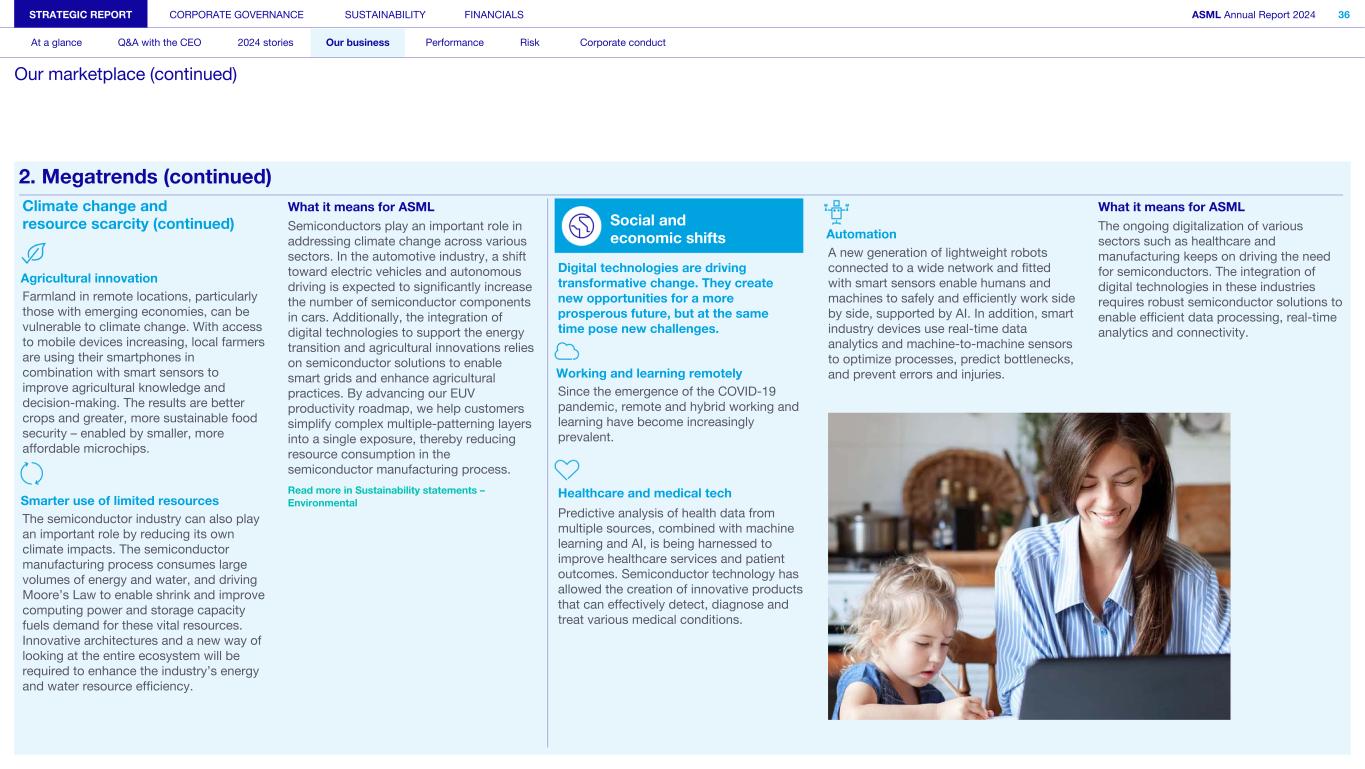 Climate change and resource scarcity (continued) Agricultural innovation Farmland in remote locations, particularly those with emerging economies, can be vulnerable to climate change. With access to mobile devices increasing, local farmers are using their smartphones in combination with smart sensors to improve agricultural knowledge and decision-making. The results are better crops and greater, more sustainable food security – enabled by smaller, more affordable microchips. Smarter use of limited resources The semiconductor industry can also play an important role by reducing its own climate impacts. The semiconductor manufacturing process consumes large volumes of energy and water, and driving Moore’s Law to enable shrink and improve computing power and storage capacity fuels demand for these vital resources. Innovative architectures and a new way of looking at the entire ecosystem will be required to enhance the industry’s energy and water resource efficiency. What it means for ASML Semiconductors play an important role in addressing climate change across various sectors. In the automotive industry, a shift toward electric vehicles and autonomous driving is expected to significantly increase the number of semiconductor components in cars. Additionally, the integration of digital technologies to support the energy transition and agricultural innovations relies on semiconductor solutions to enable smart grids and enhance agricultural practices. By advancing our EUV productivity roadmap, we help customers simplify complex multiple-patterning layers into a single exposure, thereby reducing resource consumption in the semiconductor manufacturing process. Read more in Sustainability statements – Environmental Social and economic shifts Digital technologies are driving transformative change. They create new opportunities for a more prosperous future, but at the same time pose new challenges. Working and learning remotely Since the emergence of the COVID-19 pandemic, remote and hybrid working and learning have become increasingly prevalent. Healthcare and medical tech Predictive analysis of health data from multiple sources, combined with machine learning and AI, is being harnessed to improve healthcare services and patient outcomes. Semiconductor technology has allowed the creation of innovative products that can effectively detect, diagnose and treat various medical conditions. Automation A new generation of lightweight robots connected to a wide network and fitted with smart sensors enable humans and machines to safely and efficiently work side by side, supported by AI. In addition, smart industry devices use real-time data analytics and machine-to-machine sensors to optimize processes, predict bottlenecks, and prevent errors and injuries. What it means for ASML The ongoing digitalization of various sectors such as healthcare and manufacturing keeps on driving the need for semiconductors. The integration of digital technologies in these industries requires robust semiconductor solutions to enable efficient data processing, real-time analytics and connectivity. STRATEGIC REPORT CORPORATE GOVERNANCE SUSTAINABILITY FINANCIALS ASML Annual Report 2024 36 At a glance Q&A with the CEO 2024 stories Our business Performance Risk Corporate conduct Our marketplace (continued) 2. Megatrends (continued)