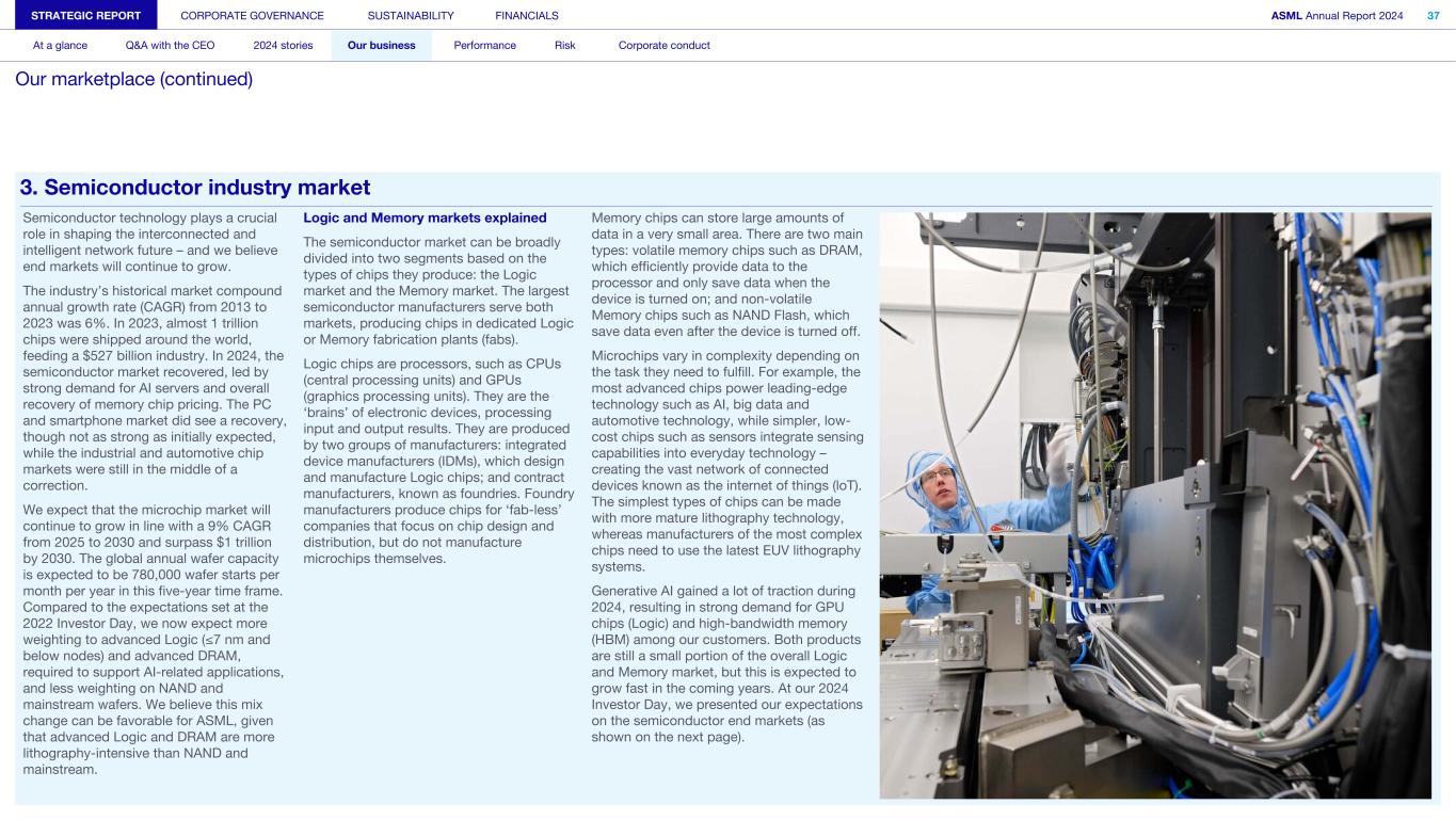 3. Semiconductor industry market Semiconductor technology plays a crucial role in shaping the interconnected and intelligent network future – and we believe end markets will continue to grow. The industry’s historical market compound annual growth rate (CAGR) from 2013 to 2023 was 6%. In 2023, almost 1 trillion chips were shipped around the world, feeding a $527 billion industry. In 2024, the semiconductor market recovered, led by strong demand for AI servers and overall recovery of memory chip pricing. The PC and smartphone market did see a recovery, though not as strong as initially expected, while the industrial and automotive chip markets were still in the middle of a correction. We expect that the microchip market will continue to grow in line with a 9% CAGR from 2025 to 2030 and surpass $1 trillion by 2030. The global annual wafer capacity is expected to be 780,000 wafer starts per month per year in this five-year time frame. Compared to the expectations set at the 2022 Investor Day, we now expect more weighting to advanced Logic (≤7 nm and below nodes) and advanced DRAM, required to support AI-related applications, and less weighting on NAND and mainstream wafers. We believe this mix change can be favorable for ASML, given that advanced Logic and DRAM are more lithography-intensive than NAND and mainstream. Logic and Memory markets explained The semiconductor market can be broadly divided into two segments based on the types of chips they produce: the Logic market and the Memory market. The largest semiconductor manufacturers serve both markets, producing chips in dedicated Logic or Memory fabrication plants (fabs). Logic chips are processors, such as CPUs (central processing units) and GPUs (graphics processing units). They are the ‘brains’ of electronic devices, processing input and output results. They are produced by two groups of manufacturers: integrated device manufacturers (IDMs), which design and manufacture Logic chips; and contract manufacturers, known as foundries. Foundry manufacturers produce chips for ‘fab-less’ companies that focus on chip design and distribution, but do not manufacture microchips themselves. Memory chips can store large amounts of data in a very small area. There are two main types: volatile memory chips such as DRAM, which efficiently provide data to the processor and only save data when the device is turned on; and non-volatile Memory chips such as NAND Flash, which save data even after the device is turned off. Microchips vary in complexity depending on the task they need to fulfill. For example, the most advanced chips power leading-edge technology such as AI, big data and automotive technology, while simpler, low- cost chips such as sensors integrate sensing capabilities into everyday technology – creating the vast network of connected devices known as the internet of things (loT). The simplest types of chips can be made with more mature lithography technology, whereas manufacturers of the most complex chips need to use the latest EUV lithography systems. Generative AI gained a lot of traction during 2024, resulting in strong demand for GPU chips (Logic) and high-bandwidth memory (HBM) among our customers. Both products are still a small portion of the overall Logic and Memory market, but this is expected to grow fast in the coming years. At our 2024 Investor Day, we presented our expectations on the semiconductor end markets (as shown on the next page). STRATEGIC REPORT CORPORATE GOVERNANCE SUSTAINABILITY FINANCIALS ASML Annual Report 2024 37 At a glance Q&A with the CEO 2024 stories Our business Performance Risk Corporate conduct Our marketplace (continued)