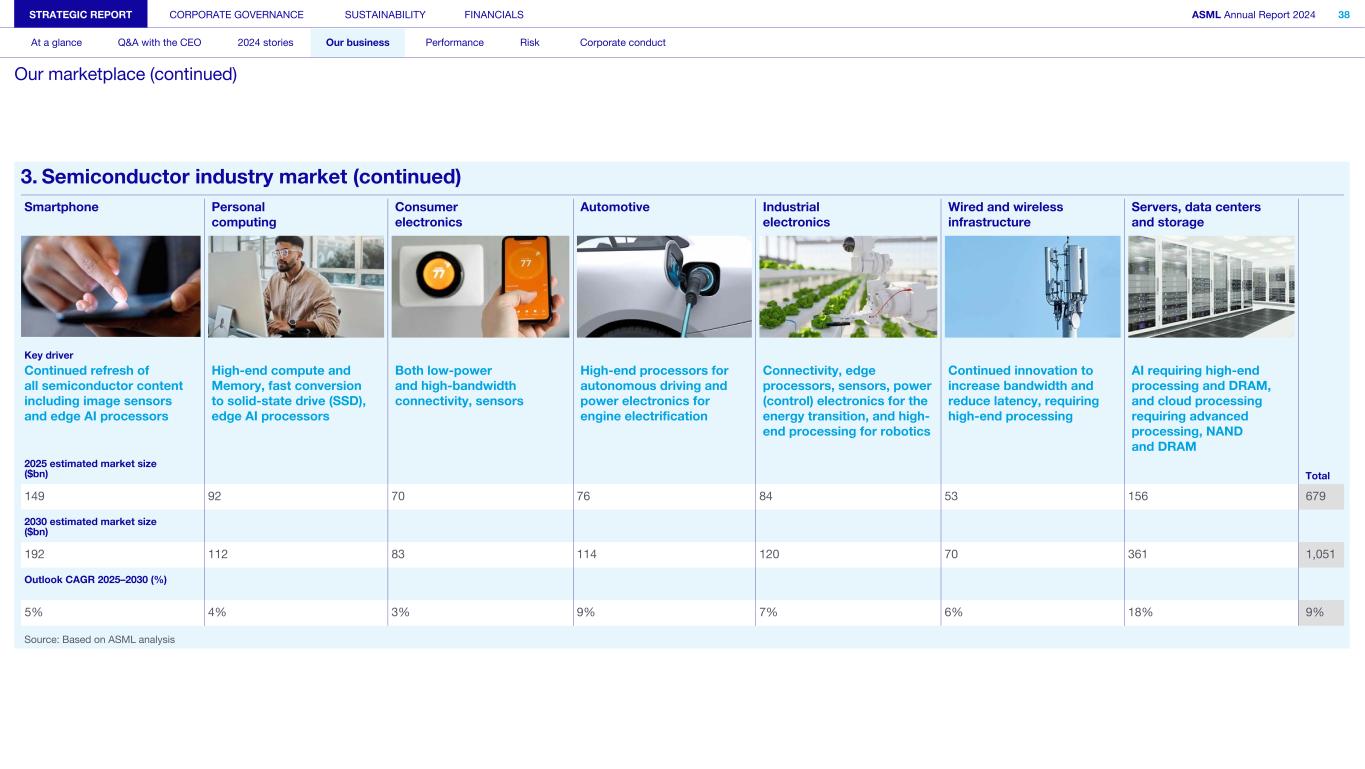 3. Semiconductor industry market (continued) Smartphone Personal computing Consumer electronics Automotive Industrial electronics Wired and wireless infrastructure Servers, data centers and storage Key driver Continued refresh of all semiconductor content including image sensors and edge AI processors High-end compute and Memory, fast conversion to solid-state drive (SSD), edge AI processors Both low-power and high-bandwidth connectivity, sensors High-end processors for autonomous driving and power electronics for engine electrification Connectivity, edge processors, sensors, power (control) electronics for the energy transition, and high- end processing for robotics Continued innovation to increase bandwidth and reduce latency, requiring high-end processing AI requiring high-end processing and DRAM, and cloud processing requiring advanced processing, NAND and DRAM 2025 estimated market size ($bn) Total 149 92 70 76 84 53 156 679 2030 estimated market size ($bn) 192 112 83 114 120 70 361 1,051 Outlook CAGR 2025–2030 (%) 5% 4% 3% 9% 7% 6% 18% 9% Source: Based on ASML analysis STRATEGIC REPORT CORPORATE GOVERNANCE SUSTAINABILITY FINANCIALS ASML Annual Report 2024 38 At a glance Q&A with the CEO 2024 stories Our business Performance Risk Corporate conduct Our marketplace (continued)