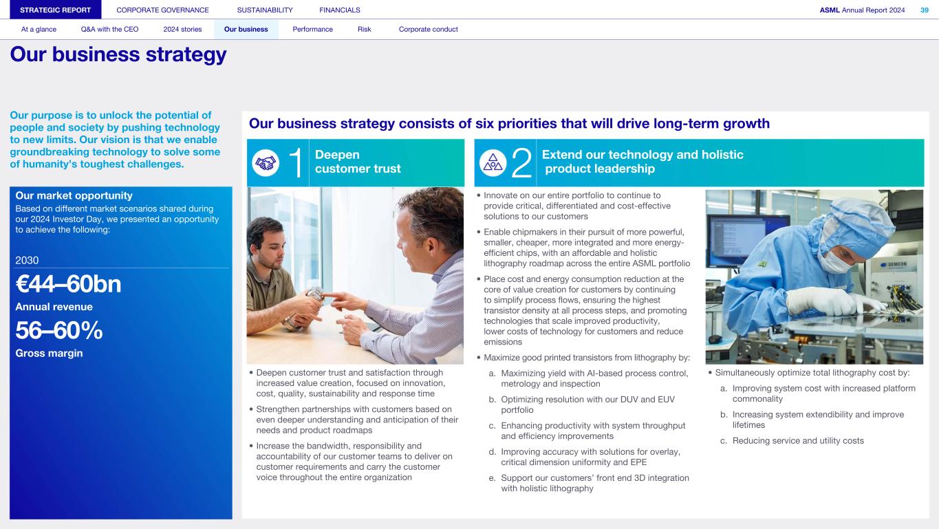 Our purpose is to unlock the potential of people and society by pushing technology to new limits. Our vision is that we enable groundbreaking technology to solve some of humanity’s toughest challenges. Our market opportunity Based on different market scenarios shared during our 2024 Investor Day, we presented an opportunity to achieve the following: 2030 €44–60bn Annual revenue 56–60% Gross margin STRATEGIC REPORT CORPORATE GOVERNANCE SUSTAINABILITY FINANCIALS ASML Annual Report 2024 39 At a glance Q&A with the CEO 2024 stories Our business Performance Risk Corporate conduct Our business strategy Our business strategy consists of six priorities that will drive long-term growth Deepen customer trust Extend our technology and holistic product leadership 1 2 • Innovate on our entire portfolio to continue to provide critical, differentiated and cost-effective solutions to our customers • Enable chipmakers in their pursuit of more powerful, smaller, cheaper, more integrated and more energy- efficient chips, with an affordable and holistic lithography roadmap across the entire ASML portfolio • Place cost and energy consumption reduction at the core of value creation for customers by continuing to simplify process flows, ensuring the highest transistor density at all process steps, and promoting technologies that scale improved productivity, lower costs of technology for customers and reduce emissions • Maximize good printed transistors from lithography by: a. Maximizing yield with AI-based process control, metrology and inspection b. Optimizing resolution with our DUV and EUV portfolio c. Enhancing productivity with system throughput and efficiency improvements d. Improving accuracy with solutions for overlay, critical dimension uniformity and EPE e. Support our customers’ front end 3D integration with holistic lithography • Deepen customer trust and satisfaction through increased value creation, focused on innovation, cost, quality, sustainability and response time • Strengthen partnerships with customers based on even deeper understanding and anticipation of their needs and product roadmaps • Increase the bandwidth, responsibility and accountability of our customer teams to deliver on customer requirements and carry the customer voice throughout the entire organization • Simultaneously optimize total lithography cost by: a. Improving system cost with increased platform commonality b. Increasing system extendibility and improve lifetimes c. Reducing service and utility costs