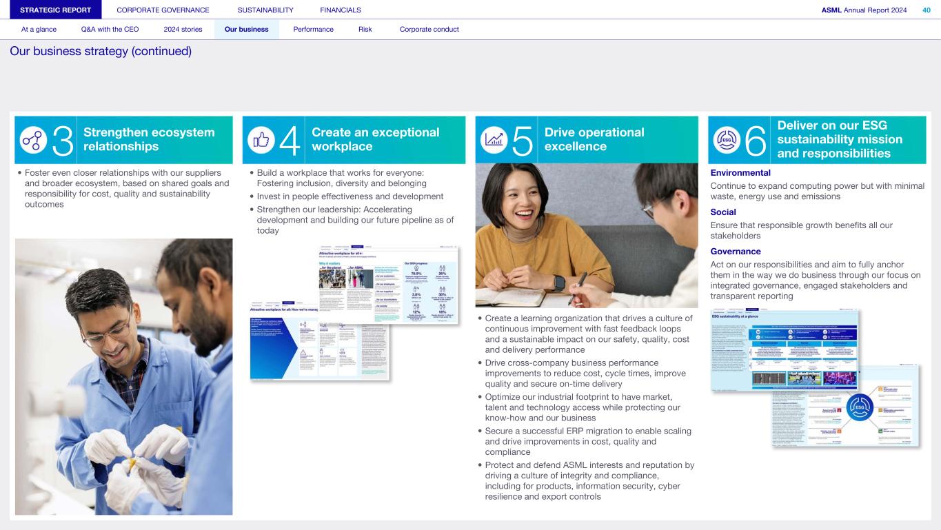 3 Strengthen ecosystem relationships • Foster even closer relationships with our suppliers and broader ecosystem, based on shared goals and responsibility for cost, quality and sustainability outcomes 4 Create an exceptional workplace • Build a workplace that works for everyone: Fostering inclusion, diversity and belonging • Invest in people effectiveness and development • Strengthen our leadership: Accelerating development and building our future pipeline as of today 5 Drive operational excellence • Create a learning organization that drives a culture of continuous improvement with fast feedback loops and a sustainable impact on our safety, quality, cost and delivery performance • Drive cross-company business performance improvements to reduce cost, cycle times, improve quality and secure on-time delivery • Optimize our industrial footprint to have market, talent and technology access while protecting our know-how and our business • Secure a successful ERP migration to enable scaling and drive improvements in cost, quality and compliance • Protect and defend ASML interests and reputation by driving a culture of integrity and compliance, including for products, information security, cyber resilience and export controls Deliver on our ESG sustainability mission and responsibilities6 Environmental Continue to expand computing power but with minimal waste, energy use and emissions Social Ensure that responsible growth benefits all our stakeholders Governance Act on our responsibilities and aim to fully anchor them in the way we do business through our focus on integrated governance, engaged stakeholders and transparent reporting STRATEGIC REPORT CORPORATE GOVERNANCE SUSTAINABILITY FINANCIALS ASML Annual Report 2024 40 At a glance Q&A with the CEO 2024 stories Our business Performance Risk Corporate conduct Our business strategy (continued)