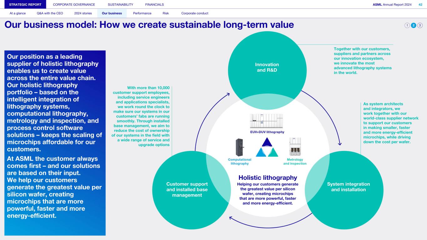 Our position as a leading supplier of holistic lithography enables us to create value across the entire value chain. Our holistic lithography portfolio – based on the intelligent integration of lithography systems, computational lithography, metrology and inspection, and process control software solutions – keeps the scaling of microchips affordable for our customers. At ASML the customer always comes first – and our solutions are based on their input. We help our customers generate the greatest value per silicon wafer, creating microchips that are more powerful, faster and more energy-efficient. STRATEGIC REPORT CORPORATE GOVERNANCE SUSTAINABILITY FINANCIALS ASML Annual Report 2024 42 At a glance Q&A with the CEO 2024 stories Our business Performance Risk Corporate conduct Our business model: How we create sustainable long-term value With more than 10,000 customer support employees, including service engineers and applications specialists, we work round the clock to make sure our systems in our customers’ fabs are running smoothly. Through installed base management, we aim to reduce the cost of ownership of our systems in the field with a wide range of service and upgrade options Innovation and R&D Customer support and installed base management System integration and installation Together with our customers, suppliers and partners across our innovation ecosystem, we innovate the most advanced lithography systems in the world. As system architects and integrators, we work together with our world-class supplier network to support our customers in making smaller, faster and more energy-efficient microchips, while driving down the cost per wafer. Holistic lithography Helping our customers generate the greatest value per silicon wafer, creating microchips that are more powerful, faster and more energy-efficient.