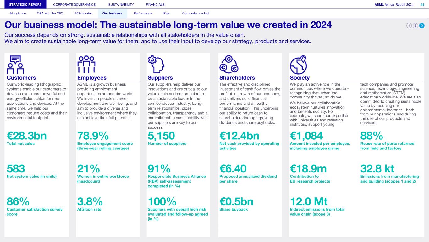 Customers Employees Suppliers Shareholders Society Our world-leading lithographic systems enable our customers to develop ever-more powerful and energy-efficient chips for new applications and devices. At the same time, we help our customers reduce costs and their environmental footprint. ASML is a growth business providing employment opportunities around the world. We invest in people’s career development and well-being, and aim to provide a diverse and inclusive environment where they can achieve their full potential. Our suppliers help deliver our innovations and are critical to our value chain and our ambition to be a sustainable leader in the semiconductor industry. Long- term relationships, close collaboration, transparency and a commitment to sustainability with our suppliers are key to our success. The effective and disciplined investment of cash flow drives the profitable growth of our company, and delivers solid financial performance and a healthy financial position. This underpins our ability to return cash to shareholders through growing dividends and share buybacks. We play an active role in the communities where we operate – recognizing that, when the community thrives, so do we. We believe our collaborative ecosystem nurtures innovation and benefits society. For example, we share our expertise with universities and research institutes, support young tech companies and promote science, technology, engineering and mathematics (STEM) education worldwide. We are also committed to creating sustainable value by reducing our environmental footprint – both from our operations and during the use of our products and services. €28.3bn 78.9% 5,150 €12.4bn €1,084 88% Total net sales Employee engagement score (three-year rolling average) Number of suppliers Net cash provided by operating activities Amount invested per employee, including employee giving Reuse rate of parts returned from field and factory 583 21% 91% €6.40 €18.9m 32.8 kt Net system sales (in units) Women in entire workforce (headcount) Responsible Business Alliance (RBA) self-assessment completed (in %) Proposed annualized dividend per share Contribution to EU research projects Emissions from manufacturing and building (scopes 1 and 2) 86% 3.8% 100% €0.5bn 12.0 Mt Customer satisfaction survey score Attrition rate Suppliers with overall high risk evaluated and follow-up agreed (in %) Share buyback Indirect emissions from total value chain (scope 3) STRATEGIC REPORT CORPORATE GOVERNANCE SUSTAINABILITY FINANCIALS ASML Annual Report 2024 43 At a glance Q&A with the CEO 2024 stories Our business Performance Risk Corporate conduct Our business model: The sustainable long-term value we created in 2024 Our success depends on strong, sustainable relationships with all stakeholders in the value chain. We aim to create sustainable long-term value for them, and to use their input to develop our strategy, products and services.