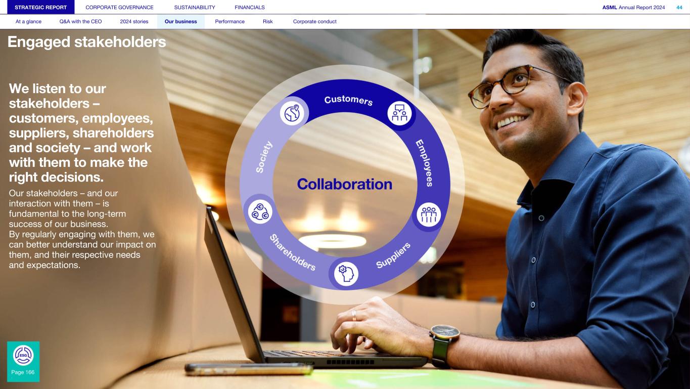 We listen to our stakeholders – customers, employees, suppliers, shareholders and society – and work with them to make the right decisions. Our stakeholders – and our interaction with them – is fundamental to the long-term success of our business. By regularly engaging with them, we can better understand our impact on them, and their respective needs and expectations. Page 166 > STRATEGIC REPORT CORPORATE GOVERNANCE SUSTAINABILITY FINANCIALS ASML Annual Report 2024 44 At a glance Q&A with the CEO 2024 stories Our business Performance Risk Corporate conduct Engaged stakeholders