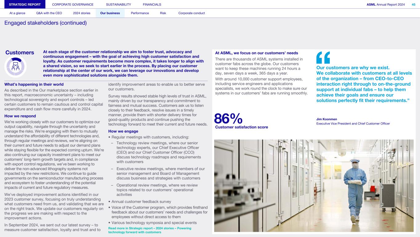 Customers At each stage of the customer relationship we aim to foster trust, advocacy and continuous engagement – with the goal of achieving high customer satisfaction and loyalty. As customer requirements become more complex, it takes longer to align with a shared vision, so we seek to start earlier in the process. By placing our customer relationship at the center of our work, we can leverage our innovations and develop even more sophisticated solutions alongside them. What’s happening in their world As described in the Our marketplace section earlier in this report, macroeconomic uncertainty – including technological sovereignty and export controls – led certain customers to remain cautious and control capital expenditure and cash flow more carefully in 2024. How we respond We’re working closely with our customers to optimize our output capability, navigate through the uncertainty and manage the risks. We’re engaging with them to mutually understand the affordability of different technologies and, through regular meetings and reviews, we’re aligning on their current and future needs to adjust our demand plans while staying flexible for the expected coming upturn. We’re also continuing our capacity investment plans to meet our customers’ long-term growth targets and, in compliance with export control regulations, we’ve been working to deliver the non-advanced lithography systems not impacted by the new restrictions. We continue to guide governments on the semiconductor manufacturing process and ecosystem to foster understanding of the potential impacts of current and future regulatory measures. We’ve deployed improvement actions identified in our 2023 customer survey, focusing on truly understanding what customers need from us, and validating that we are on the right track. We update our customers regularly on the progress we are making with respect to the improvement actions. In September 2024, we sent out our latest survey – to measure customer satisfaction, loyalty and trust and to identify improvement areas to enable us to better serve our customers. Survey results showed stable high levels of trust in ASML, mainly driven by our transparency and commitment to fairness and mutual success. Customers ask us to listen closely to their feedback, resolve issues in a timely manner, provide them with shorter delivery times for good-quality products and continue pushing the technology forward to meet their current and future needs. How we engage • Regular meetings with customers, including: – Technology review meetings, where our senior technology experts, our Chief Executive Officer (CEO) and our Chief Customer Officer (CCO) discuss technology roadmaps and requirements with customers – Executive review meetings, where members of our senior management and Board of Management discuss business and strategies with customers – Operational review meetings, where we review topics related to our customers’ operational activities • Annual customer feedback survey • Voice of the Customer program, which provides firsthand feedback about our customers’ needs and challenges for employees without direct access to them • Various technology symposia and special events Read more in Strategic report – 2024 stories – Powering technology forward with customers STRATEGIC REPORT CORPORATE GOVERNANCE SUSTAINABILITY FINANCIALS ASML Annual Report 2024 45 At a glance Q&A with the CEO 2024 stories Our business Performance Risk Corporate conduct Engaged stakeholders (continued) At ASML, we focus on our customers’ needs There are thousands of ASML systems installed in customer fabs across the globe. Our customers want to keep these machines running 24 hours a day, seven days a week, 365 days a year. With around 10,000 customer support employees, including service engineers and applications specialists, we work round the clock to make sure our systems in our customers’ fabs are running smoothly. Our customers are why we exist. We collaborate with customers at all levels of the organization – from CEO-to-CEO interaction right through to on-the-ground support at individual fabs – to help them achieve their goals and ensure our solutions perfectly fit their requirements.” 86% Jim Koonmen Executive Vice President and Chief Customer Officer Customer satisfaction score