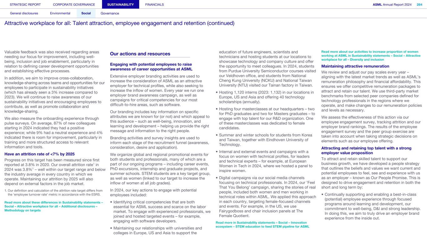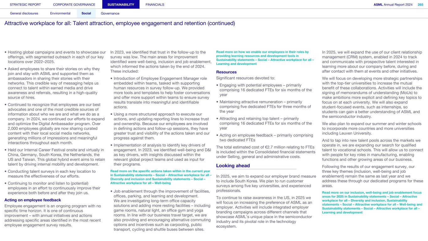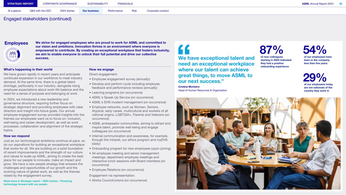 Employees We strive for engaged employees who are proud to work for ASML and committed to our vision and ambitions. Innovation thrives in an environment where everyone is empowered to contribute. By creating an exceptional workplace that fosters inclusivity, we aim to enable everyone to unlock their full potential and drive our collective success. What’s happening in their world We have grown rapidly in recent years and anticipate continued expansion in our workforce to meet industry demand. At the same time, there is a global talent shortage, particularly in our industry, alongside rising employee expectations about work-life balance and the need for a sense of purpose and belonging at work. In 2024, we introduced a new leadership and governance structure, requiring further focus on strategic alignment and providing employees with clear direction and insight into future goals. Our annual employee engagement survey provided insights into the themes our employees want us to focus on: inclusion, well-being and career development, as well as work processes, collaboration and alignment of the strategic topics. How we respond Just as our technological ambitions continue at pace, so do our aspirations for building an exceptional workplace that works for all. We are building on a solid foundation of recent improvements and the strength of our culture and values to scale up ASML, aiming to create the best place for our people to innovate, make an impact and grow. We have a new people strategy that answers the challenges and opportunities of our growth and the evolving nature of global work, as well as the themes raised by the engagement survey. Read more in Strategic report – 2024 stories – Powering technology forward with our people How we engage Direct engagement: • Employee engagement survey (annually) • Develop and perform cycle including employee feedback and performance reviews (annually) • Learning programs (on occurrence) • ASML's Speak Up Service (on occurrence) • ASML's EHS incident management (on occurrence) • Employee networks, such as Women, Seniors, Atypical, early career, multicultural and workers of all national origins, LGBTQIA+, Parents and Veterans (on occurrence) • ASML ambassador communities, aiming to attract and inspire talent, promote well-being and engage colleagues (on occurrence) • Internal communication and awareness, for example, through the intranet, our ethics program and myEHS (daily) • Onboarding program for new employees (upon joining) • All-employee meeting and senior management meetings, department employee meetings and interactive lunch sessions with Board members (on occurrence) • Employee Relations (on occurrence) Engagement via representation: • Works Council/unions (on occurrence) STRATEGIC REPORT CORPORATE GOVERNANCE SUSTAINABILITY FINANCIALS ASML Annual Report 2024 46 At a glance Q&A with the CEO 2024 stories Our business Performance Risk Corporate conduct Engaged stakeholders (continued) We have exceptional talent and need an exceptional workplace where our talent can achieve great things, to move ASML to our next success.” Cristina Monteiro Head of Human Resources & Organization 87% 54% of new colleagues starting in 2024 indicated they had a positive onboarding experience of our employees have been in the company less than five years 29% of our employees today are not nationals of the country they work in