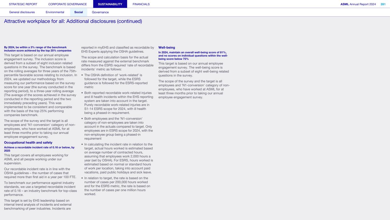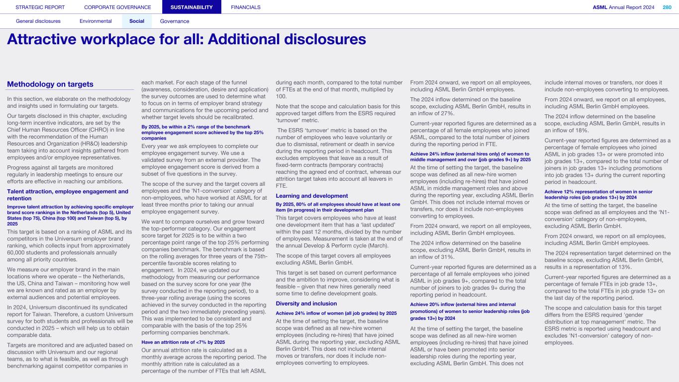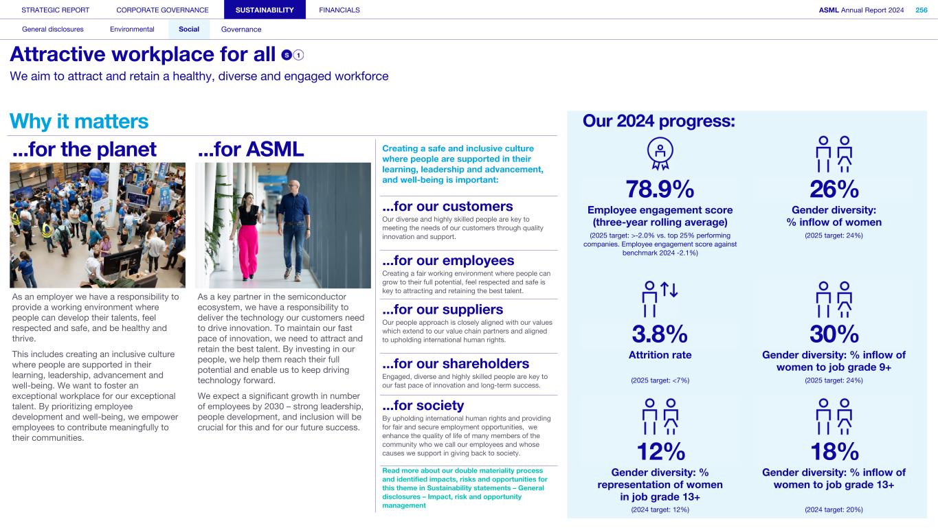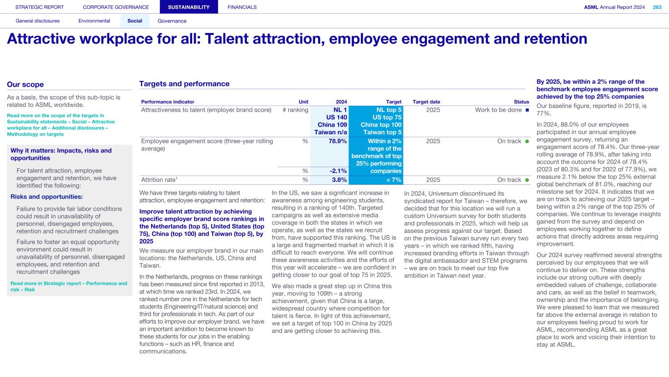 Employees We strive for engaged employees who are proud to work for ASML and committed to our vision and ambitions. Innovation thrives in an environment where everyone is empowered to contribute. By creating an exceptional workplace that fosters inclusivity, we aim to enable everyone to unlock their full potential and drive our collective success. What’s happening in their world We have grown rapidly in recent years and anticipate continued expansion in our workforce to meet industry demand. At the same time, there is a global talent shortage, particularly in our industry, alongside rising employee expectations about work-life balance and the need for a sense of purpose and belonging at work. In 2024, we introduced a new leadership and governance structure, requiring further focus on strategic alignment and providing employees with clear direction and insight into future goals. Our annual employee engagement survey provided insights into the themes our employees want us to focus on: inclusion, well-being and career development, as well as work processes, collaboration and alignment of the strategic topics. How we respond Just as our technological ambitions continue at pace, so do our aspirations for building an exceptional workplace that works for all. We are building on a solid foundation of recent improvements and the strength of our culture and values to scale up ASML, aiming to create the best place for our people to innovate, make an impact and grow. We have a new people strategy that answers the challenges and opportunities of our growth and the evolving nature of global work, as well as the themes raised by the engagement survey. Read more in Strategic report – 2024 stories – Powering technology forward with our people How we engage Direct engagement: • Employee engagement survey (annually) • Develop and perform cycle including employee feedback and performance reviews (annually) • Learning programs (on occurrence) • ASML's Speak Up Service (on occurrence) • ASML's EHS incident management (on occurrence) • Employee networks, such as Women, Seniors, Atypical, early career, multicultural and workers of all national origins, LGBTQIA+, Parents and Veterans (on occurrence) • ASML ambassador communities, aiming to attract and inspire talent, promote well-being and engage colleagues (on occurrence) • Internal communication and awareness, for example, through the intranet, our ethics program and myEHS (daily) • Onboarding program for new employees (upon joining) • All-employee meeting and senior management meetings, department employee meetings and interactive lunch sessions with Board members (on occurrence) • Employee Relations (on occurrence) Engagement via representation: • Works Council/unions (on occurrence) STRATEGIC REPORT CORPORATE GOVERNANCE SUSTAINABILITY FINANCIALS ASML Annual Report 2024 46 At a glance Q&A with the CEO 2024 stories Our business Performance Risk Corporate conduct Engaged stakeholders (continued) We have exceptional talent and need an exceptional workplace where our talent can achieve great things, to move ASML to our next success.” Cristina Monteiro Head of Human Resources & Organization 87% 54% of new colleagues starting in 2024 indicated they had a positive onboarding experience of our employees have been in the company less than five years 29% of our employees today are not nationals of the country they work in
