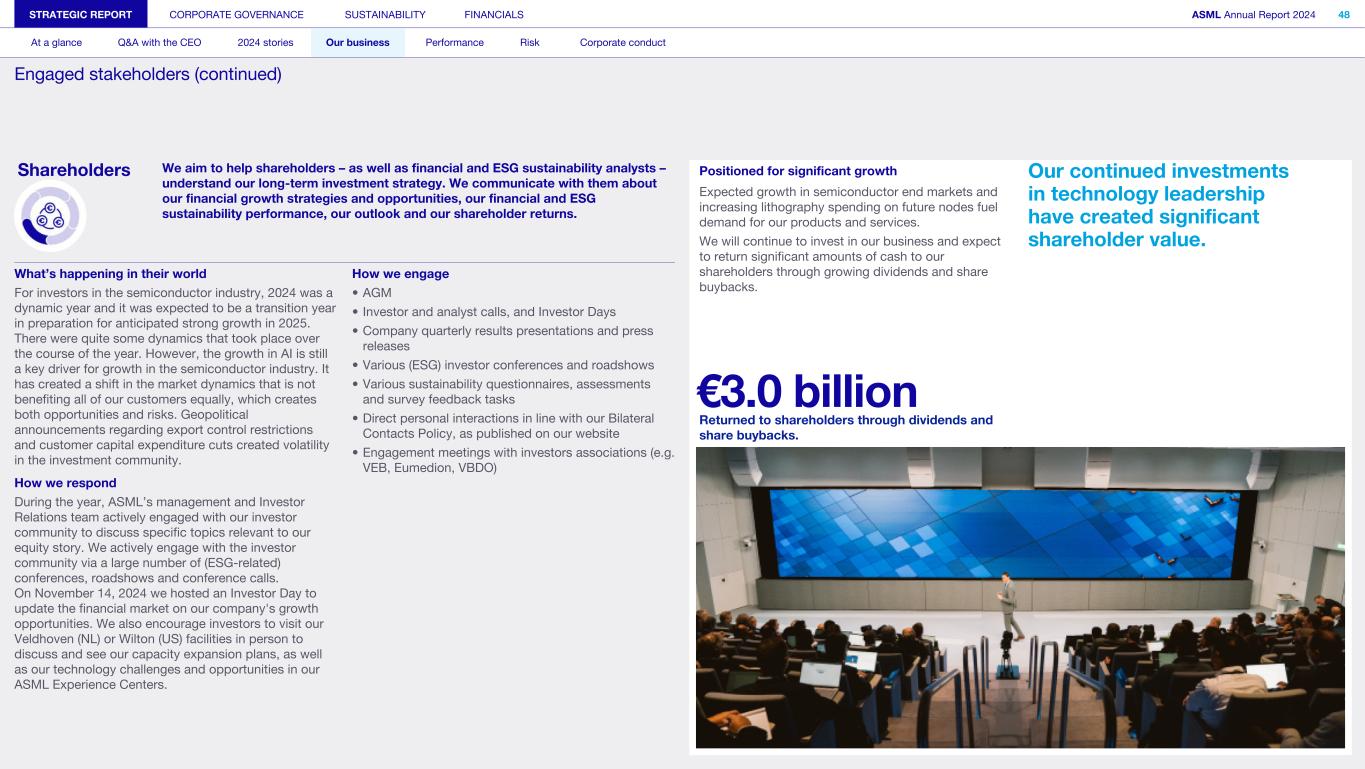 Shareholders We aim to help shareholders – as well as financial and ESG sustainability analysts – understand our long-term investment strategy. We communicate with them about our financial growth strategies and opportunities, our financial and ESG sustainability performance, our outlook and our shareholder returns. What’s happening in their world For investors in the semiconductor industry, 2024 was a dynamic year and it was expected to be a transition year in preparation for anticipated strong growth in 2025. There were quite some dynamics that took place over the course of the year. However, the growth in AI is still a key driver for growth in the semiconductor industry. It has created a shift in the market dynamics that is not benefiting all of our customers equally, which creates both opportunities and risks. Geopolitical announcements regarding export control restrictions and customer capital expenditure cuts created volatility in the investment community. How we respond During the year, ASML’s management and Investor Relations team actively engaged with our investor community to discuss specific topics relevant to our equity story. We actively engage with the investor community via a large number of (ESG-related) conferences, roadshows and conference calls. On November 14, 2024 we hosted an Investor Day to update the financial market on our company's growth opportunities. We also encourage investors to visit our Veldhoven (NL) or Wilton (US) facilities in person to discuss and see our capacity expansion plans, as well as our technology challenges and opportunities in our ASML Experience Centers. How we engage • AGM • Investor and analyst calls, and Investor Days • Company quarterly results presentations and press releases • Various (ESG) investor conferences and roadshows • Various sustainability questionnaires, assessments and survey feedback tasks • Direct personal interactions in line with our Bilateral Contacts Policy, as published on our website • Engagement meetings with investors associations (e.g. VEB, Eumedion, VBDO) STRATEGIC REPORT CORPORATE GOVERNANCE SUSTAINABILITY FINANCIALS ASML Annual Report 2024 48 At a glance Q&A with the CEO 2024 stories Our business Performance Risk Corporate conduct Engaged stakeholders (continued) Positioned for significant growth Our continued investments in technology leadership have created significant shareholder value. Expected growth in semiconductor end markets and increasing lithography spending on future nodes fuel demand for our products and services. We will continue to invest in our business and expect to return significant amounts of cash to our shareholders through growing dividends and share buybacks. €3.0 billion Returned to shareholders through dividends and share buybacks.