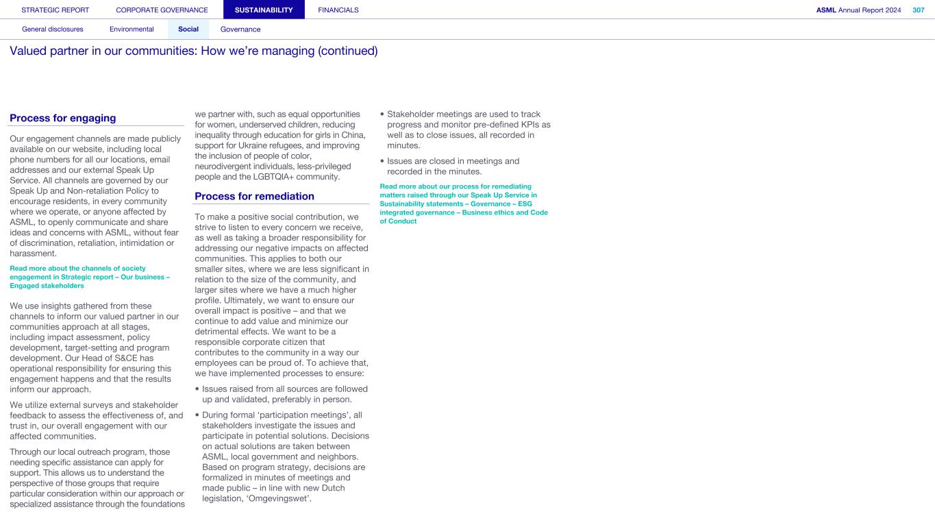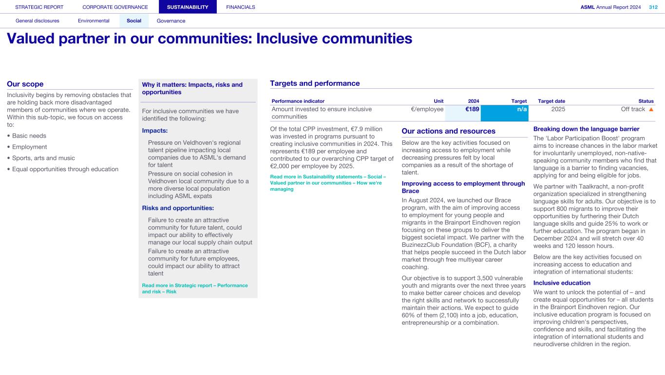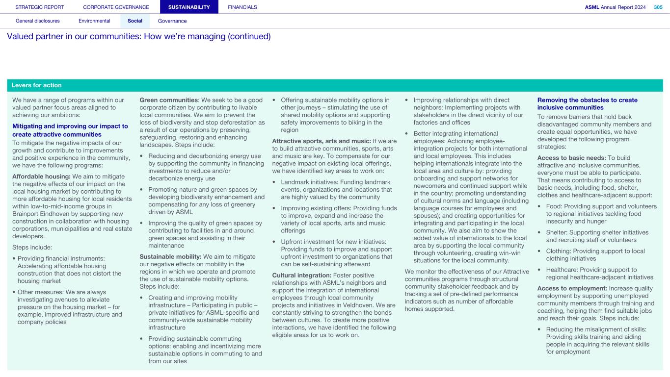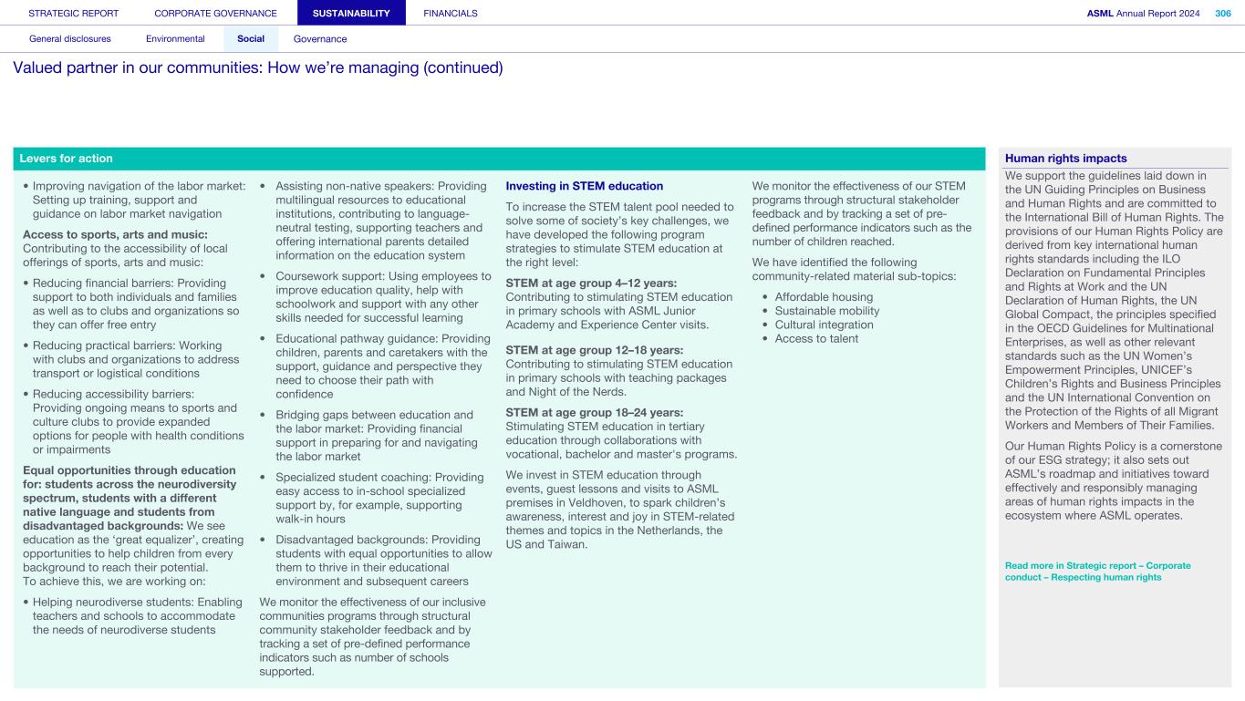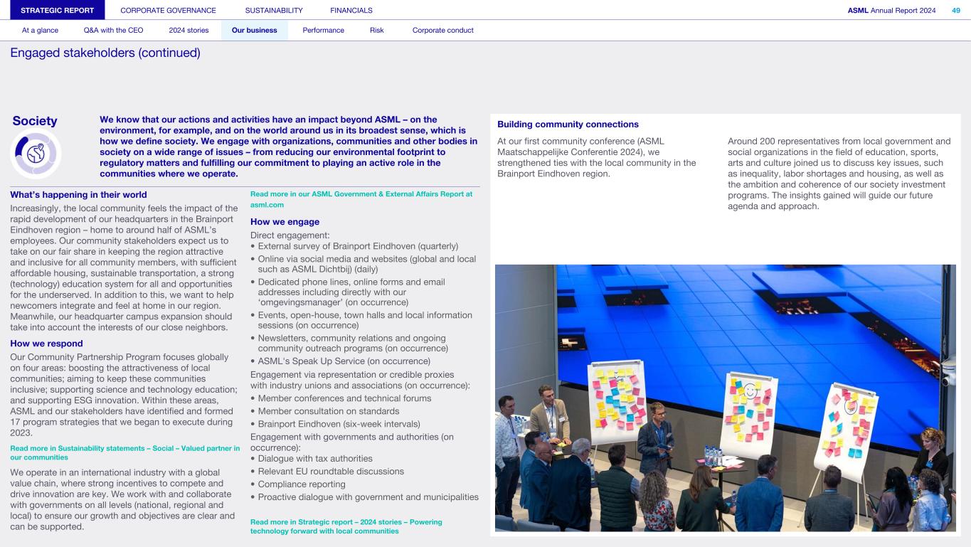 Society We know that our actions and activities have an impact beyond ASML – on the environment, for example, and on the world around us in its broadest sense, which is how we define society. We engage with organizations, communities and other bodies in society on a wide range of issues – from reducing our environmental footprint to regulatory matters and fulfilling our commitment to playing an active role in the communities where we operate. What’s happening in their world Increasingly, the local community feels the impact of the rapid development of our headquarters in the Brainport Eindhoven region – home to around half of ASML’s employees. Our community stakeholders expect us to take on our fair share in keeping the region attractive and inclusive for all community members, with sufficient affordable housing, sustainable transportation, a strong (technology) education system for all and opportunities for the underserved. In addition to this, we want to help newcomers integrate and feel at home in our region. Meanwhile, our headquarter campus expansion should take into account the interests of our close neighbors. How we respond Our Community Partnership Program focuses globally on four areas: boosting the attractiveness of local communities; aiming to keep these communities inclusive; supporting science and technology education; and supporting ESG innovation. Within these areas, ASML and our stakeholders have identified and formed 17 program strategies that we began to execute during 2023. Read more in Sustainability statements – Social – Valued partner in our communities We operate in an international industry with a global value chain, where strong incentives to compete and drive innovation are key. We work with and collaborate with governments on all levels (national, regional and local) to ensure our growth and objectives are clear and can be supported. Read more in our ASML Government & External Affairs Report at asml.com How we engage Direct engagement: • External survey of Brainport Eindhoven (quarterly) • Online via social media and websites (global and local such as ASML Dichtbij) (daily) • Dedicated phone lines, online forms and email addresses including directly with our ‘omgevingsmanager’ (on occurrence) • Events, open-house, town halls and local information sessions (on occurrence) • Newsletters, community relations and ongoing community outreach programs (on occurrence) • ASML's Speak Up Service (on occurrence) Engagement via representation or credible proxies with industry unions and associations (on occurrence): • Member conferences and technical forums • Member consultation on standards • Brainport Eindhoven (six-week intervals) Engagement with governments and authorities (on occurrence): • Dialogue with tax authorities • Relevant EU roundtable discussions • Compliance reporting • Proactive dialogue with government and municipalities Read more in Strategic report – 2024 stories – Powering technology forward with local communities STRATEGIC REPORT CORPORATE GOVERNANCE SUSTAINABILITY FINANCIALS ASML Annual Report 2024 49 At a glance Q&A with the CEO 2024 stories Our business Performance Risk Corporate conduct Engaged stakeholders (continued) Building community connections At our first community conference (ASML Maatschappelijke Conferentie 2024), we strengthened ties with the local community in the Brainport Eindhoven region. Around 200 representatives from local government and social organizations in the field of education, sports, arts and culture joined us to discuss key issues, such as inequality, labor shortages and housing, as well as the ambition and coherence of our society investment programs. The insights gained will guide our future agenda and approach.