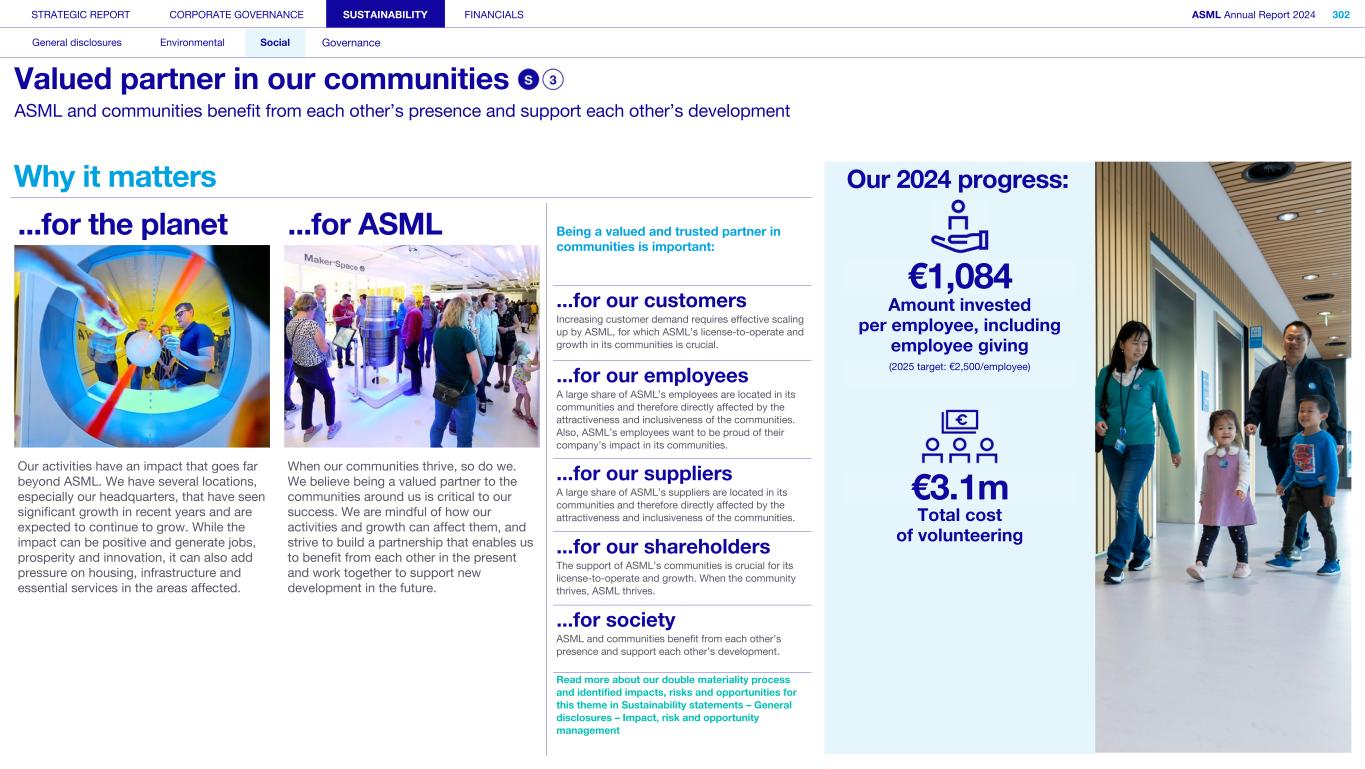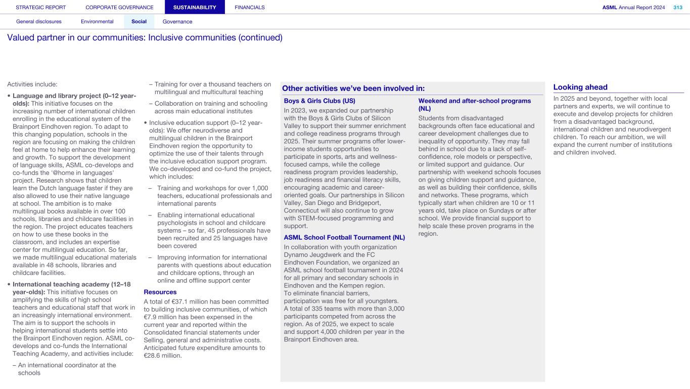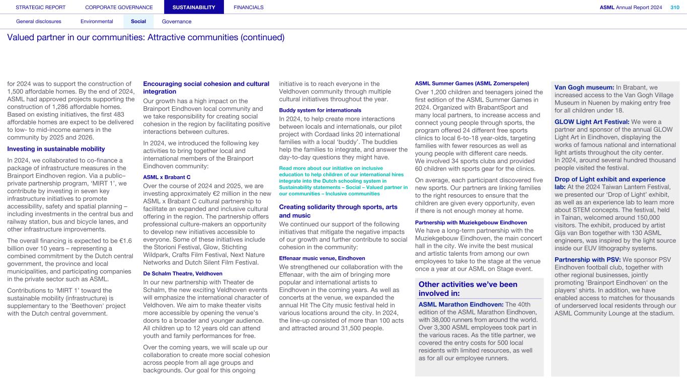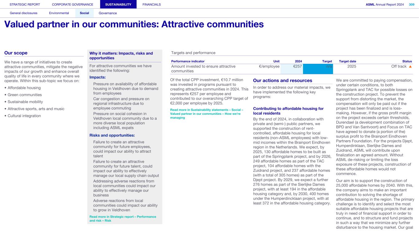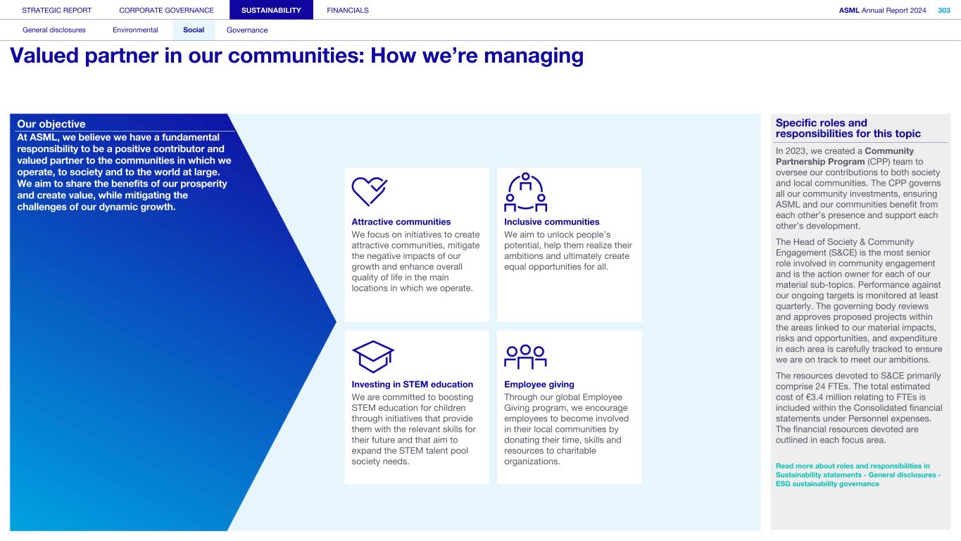 Society We know that our actions and activities have an impact beyond ASML – on the environment, for example, and on the world around us in its broadest sense, which is how we define society. We engage with organizations, communities and other bodies in society on a wide range of issues – from reducing our environmental footprint to regulatory matters and fulfilling our commitment to playing an active role in the communities where we operate. What’s happening in their world Increasingly, the local community feels the impact of the rapid development of our headquarters in the Brainport Eindhoven region – home to around half of ASML’s employees. Our community stakeholders expect us to take on our fair share in keeping the region attractive and inclusive for all community members, with sufficient affordable housing, sustainable transportation, a strong (technology) education system for all and opportunities for the underserved. In addition to this, we want to help newcomers integrate and feel at home in our region. Meanwhile, our headquarter campus expansion should take into account the interests of our close neighbors. How we respond Our Community Partnership Program focuses globally on four areas: boosting the attractiveness of local communities; aiming to keep these communities inclusive; supporting science and technology education; and supporting ESG innovation. Within these areas, ASML and our stakeholders have identified and formed 17 program strategies that we began to execute during 2023. Read more in Sustainability statements – Social – Valued partner in our communities We operate in an international industry with a global value chain, where strong incentives to compete and drive innovation are key. We work with and collaborate with governments on all levels (national, regional and local) to ensure our growth and objectives are clear and can be supported. Read more in our ASML Government & External Affairs Report at asml.com How we engage Direct engagement: • External survey of Brainport Eindhoven (quarterly) • Online via social media and websites (global and local such as ASML Dichtbij) (daily) • Dedicated phone lines, online forms and email addresses including directly with our ‘omgevingsmanager’ (on occurrence) • Events, open-house, town halls and local information sessions (on occurrence) • Newsletters, community relations and ongoing community outreach programs (on occurrence) • ASML's Speak Up Service (on occurrence) Engagement via representation or credible proxies with industry unions and associations (on occurrence): • Member conferences and technical forums • Member consultation on standards • Brainport Eindhoven (six-week intervals) Engagement with governments and authorities (on occurrence): • Dialogue with tax authorities • Relevant EU roundtable discussions • Compliance reporting • Proactive dialogue with government and municipalities Read more in Strategic report – 2024 stories – Powering technology forward with local communities STRATEGIC REPORT CORPORATE GOVERNANCE SUSTAINABILITY FINANCIALS ASML Annual Report 2024 49 At a glance Q&A with the CEO 2024 stories Our business Performance Risk Corporate conduct Engaged stakeholders (continued) Building community connections At our first community conference (ASML Maatschappelijke Conferentie 2024), we strengthened ties with the local community in the Brainport Eindhoven region. Around 200 representatives from local government and social organizations in the field of education, sports, arts and culture joined us to discuss key issues, such as inequality, labor shortages and housing, as well as the ambition and coherence of our society investment programs. The insights gained will guide our future agenda and approach.