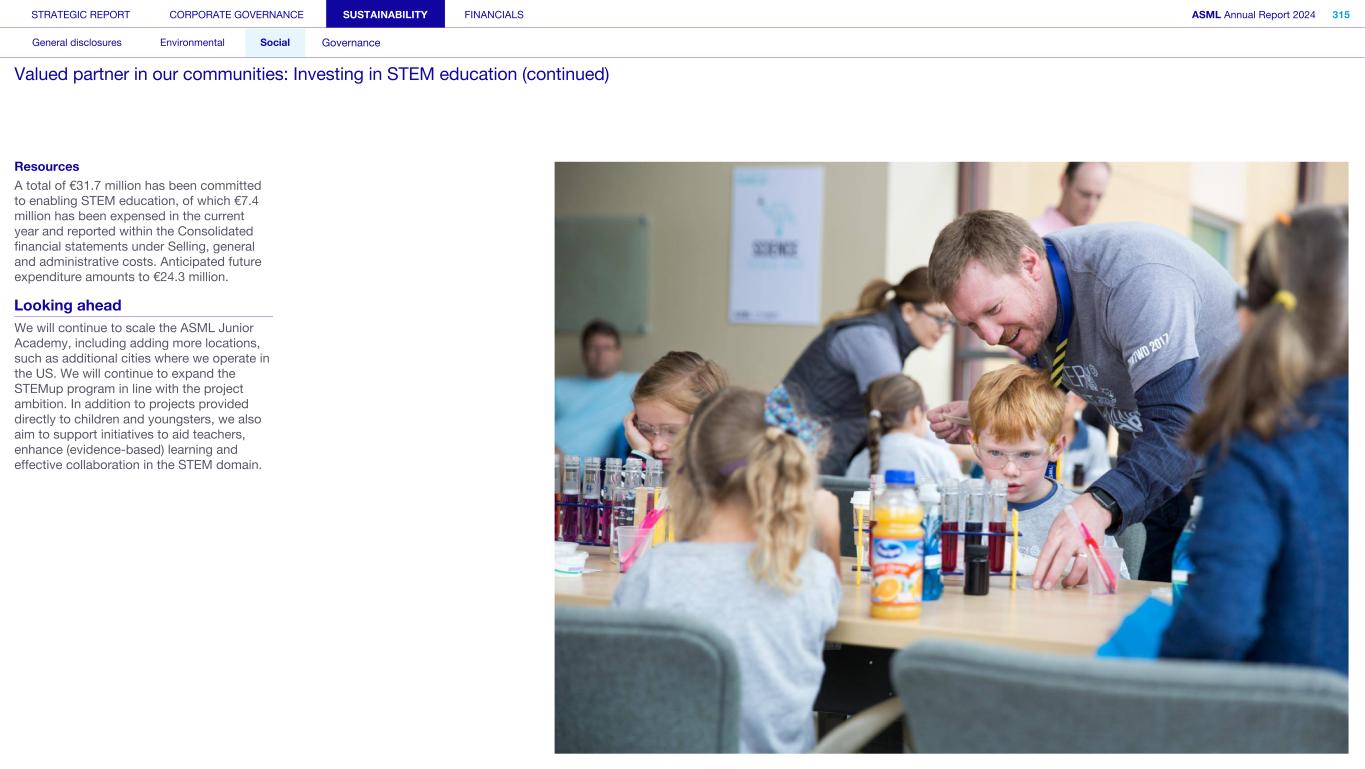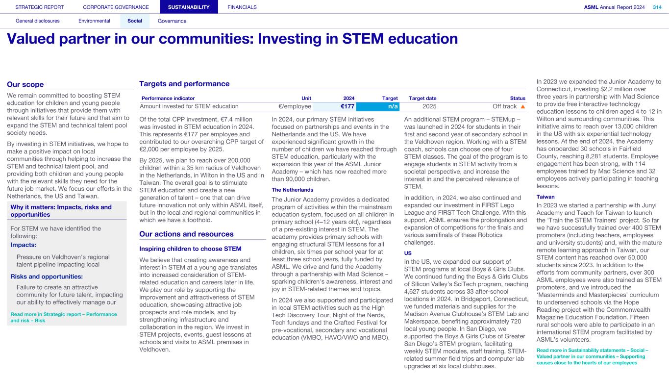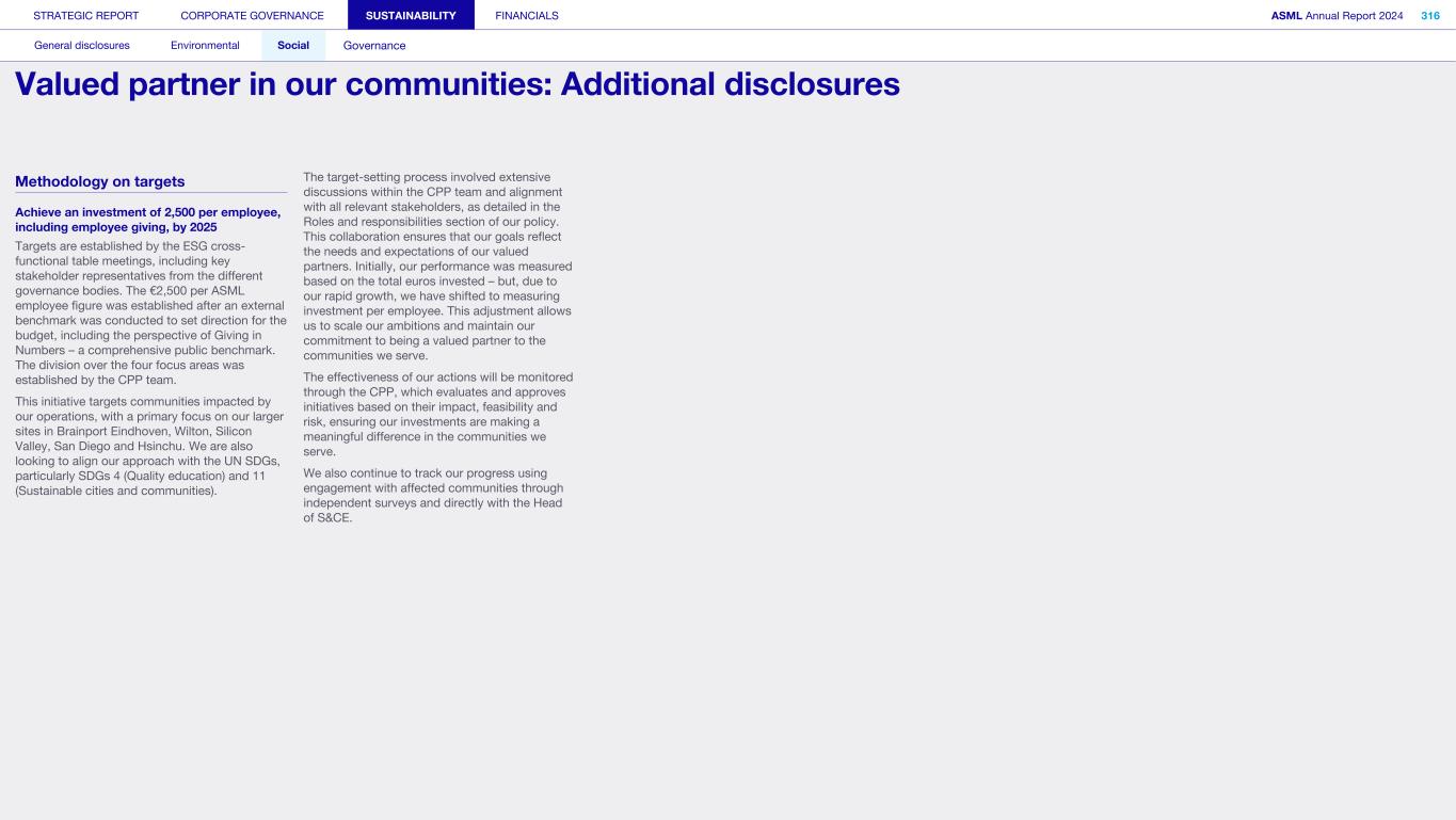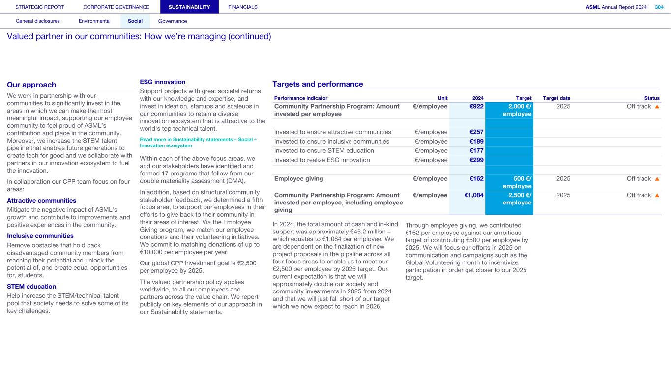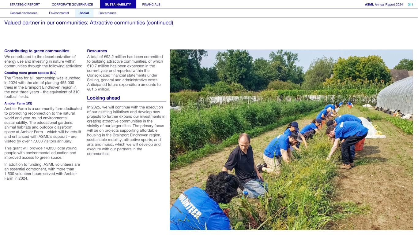 Society We know that our actions and activities have an impact beyond ASML – on the environment, for example, and on the world around us in its broadest sense, which is how we define society. We engage with organizations, communities and other bodies in society on a wide range of issues – from reducing our environmental footprint to regulatory matters and fulfilling our commitment to playing an active role in the communities where we operate. What’s happening in their world Increasingly, the local community feels the impact of the rapid development of our headquarters in the Brainport Eindhoven region – home to around half of ASML’s employees. Our community stakeholders expect us to take on our fair share in keeping the region attractive and inclusive for all community members, with sufficient affordable housing, sustainable transportation, a strong (technology) education system for all and opportunities for the underserved. In addition to this, we want to help newcomers integrate and feel at home in our region. Meanwhile, our headquarter campus expansion should take into account the interests of our close neighbors. How we respond Our Community Partnership Program focuses globally on four areas: boosting the attractiveness of local communities; aiming to keep these communities inclusive; supporting science and technology education; and supporting ESG innovation. Within these areas, ASML and our stakeholders have identified and formed 17 program strategies that we began to execute during 2023. Read more in Sustainability statements – Social – Valued partner in our communities We operate in an international industry with a global value chain, where strong incentives to compete and drive innovation are key. We work with and collaborate with governments on all levels (national, regional and local) to ensure our growth and objectives are clear and can be supported. Read more in our ASML Government & External Affairs Report at asml.com How we engage Direct engagement: • External survey of Brainport Eindhoven (quarterly) • Online via social media and websites (global and local such as ASML Dichtbij) (daily) • Dedicated phone lines, online forms and email addresses including directly with our ‘omgevingsmanager’ (on occurrence) • Events, open-house, town halls and local information sessions (on occurrence) • Newsletters, community relations and ongoing community outreach programs (on occurrence) • ASML's Speak Up Service (on occurrence) Engagement via representation or credible proxies with industry unions and associations (on occurrence): • Member conferences and technical forums • Member consultation on standards • Brainport Eindhoven (six-week intervals) Engagement with governments and authorities (on occurrence): • Dialogue with tax authorities • Relevant EU roundtable discussions • Compliance reporting • Proactive dialogue with government and municipalities Read more in Strategic report – 2024 stories – Powering technology forward with local communities STRATEGIC REPORT CORPORATE GOVERNANCE SUSTAINABILITY FINANCIALS ASML Annual Report 2024 49 At a glance Q&A with the CEO 2024 stories Our business Performance Risk Corporate conduct Engaged stakeholders (continued) Building community connections At our first community conference (ASML Maatschappelijke Conferentie 2024), we strengthened ties with the local community in the Brainport Eindhoven region. Around 200 representatives from local government and social organizations in the field of education, sports, arts and culture joined us to discuss key issues, such as inequality, labor shortages and housing, as well as the ambition and coherence of our society investment programs. The insights gained will guide our future agenda and approach.
