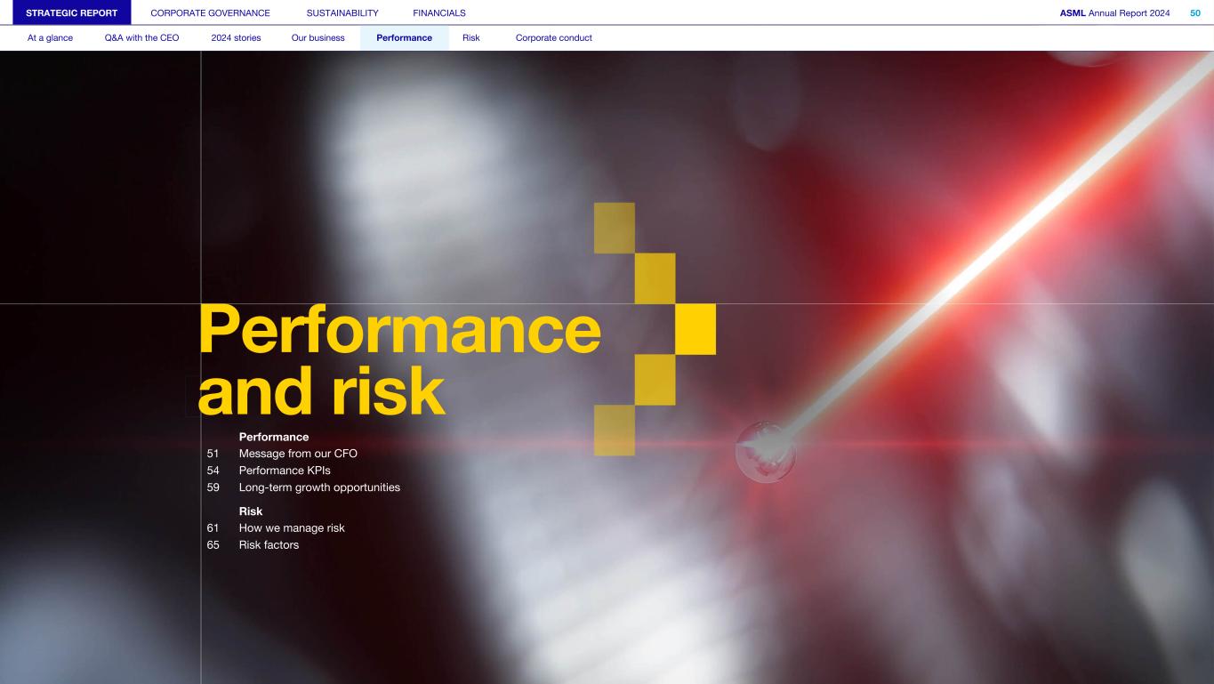 STRATEGIC REPORT CORPORATE GOVERNANCE SUSTAINABILITY FINANCIALS ASML Annual Report 2024 50 At a glance Q&A with the CEO 2024 stories Our business Performance Risk Corporate conduct Performance and risk Performance 51 Message from our CFO 54 Performance KPIs 59 Long-term growth opportunities Risk 61 How we manage risk 65 Risk factors