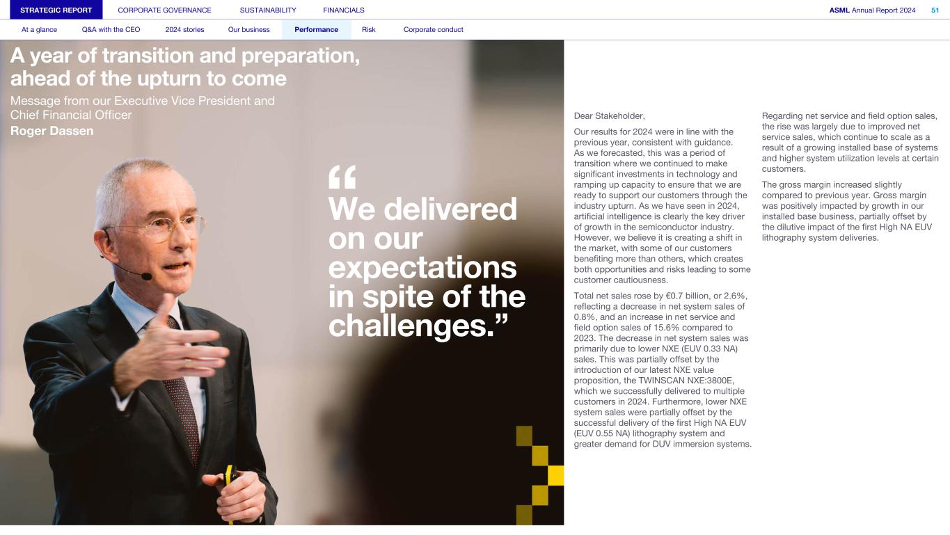 Dear Stakeholder, Our results for 2024 were in line with the previous year, consistent with guidance. As we forecasted, this was a period of transition where we continued to make significant investments in technology and ramping up capacity to ensure that we are ready to support our customers through the industry upturn. As we have seen in 2024, artificial intelligence is clearly the key driver of growth in the semiconductor industry. However, we believe it is creating a shift in the market, with some of our customers benefiting more than others, which creates both opportunities and risks leading to some customer cautiousness. Total net sales rose by €0.7 billion, or 2.6%, reflecting a decrease in net system sales of 0.8%, and an increase in net service and field option sales of 15.6% compared to 2023. The decrease in net system sales was primarily due to lower NXE (EUV 0.33 NA) sales. This was partially offset by the introduction of our latest NXE value proposition, the TWINSCAN NXE:3800E, which we successfully delivered to multiple customers in 2024. Furthermore, lower NXE system sales were partially offset by the successful delivery of the first High NA EUV (EUV 0.55 NA) lithography system and greater demand for DUV immersion systems. Regarding net service and field option sales, the rise was largely due to improved net service sales, which continue to scale as a result of a growing installed base of systems and higher system utilization levels at certain customers. The gross margin increased slightly compared to previous year. Gross margin was positively impacted by growth in our installed base business, partially offset by the dilutive impact of the first High NA EUV lithography system deliveries. STRATEGIC REPORT CORPORATE GOVERNANCE SUSTAINABILITY FINANCIALS ASML Annual Report 2024 51 At a glance Q&A with the CEO 2024 stories Our business Performance Risk Corporate conduct A year of transition and preparation, ahead of the upturn to come Message from our Executive Vice President and Chief Financial Officer Roger Dassen We delivered on our expectations in spite of the challenges.”