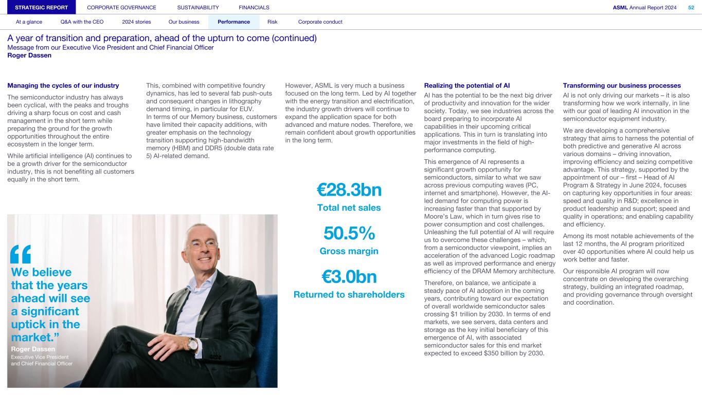 Managing the cycles of our industry The semiconductor industry has always been cyclical, with the peaks and troughs driving a sharp focus on cost and cash management in the short term while preparing the ground for the growth opportunities throughout the entire ecosystem in the longer term. While artificial intelligence (AI) continues to be a growth driver for the semiconductor industry, this is not benefiting all customers equally in the short term. This, combined with competitive foundry dynamics, has led to several fab push-outs and consequent changes in lithography demand timing, in particular for EUV. In terms of our Memory business, customers have limited their capacity additions, with greater emphasis on the technology transition supporting high-bandwidth memory (HBM) and DDR5 (double data rate 5) AI-related demand. However, ASML is very much a business focused on the long term. Led by AI together with the energy transition and electrification, the industry growth drivers will continue to expand the application space for both advanced and mature nodes. Therefore, we remain confident about growth opportunities in the long term. Realizing the potential of AI AI has the potential to be the next big driver of productivity and innovation for the wider society. Today, we see industries across the board preparing to incorporate AI capabilities in their upcoming critical applications. This in turn is translating into major investments in the field of high- performance computing. This emergence of AI represents a significant growth opportunity for semiconductors, similar to what we saw across previous computing waves (PC, internet and smartphone). However, the AI- led demand for computing power is increasing faster than that supported by Moore’s Law, which in turn gives rise to power consumption and cost challenges. Unleashing the full potential of AI will require us to overcome these challenges – which, from a semiconductor viewpoint, implies an acceleration of the advanced Logic roadmap as well as improved performance and energy efficiency of the DRAM Memory architecture. Therefore, on balance, we anticipate a steady pace of AI adoption in the coming years, contributing toward our expectation of overall worldwide semiconductor sales crossing $1 trillion by 2030. In terms of end markets, we see servers, data centers and storage as the key initial beneficiary of this emergence of AI, with associated semiconductor sales for this end market expected to exceed $350 billion by 2030. Transforming our business processes AI is not only driving our markets – it is also transforming how we work internally, in line with our goal of leading AI innovation in the semiconductor equipment industry. We are developing a comprehensive strategy that aims to harness the potential of both predictive and generative AI across various domains – driving innovation, improving efficiency and seizing competitive advantage. This strategy, supported by the appointment of our – first – Head of AI Program & Strategy in June 2024, focuses on capturing key opportunities in four areas: speed and quality in R&D; excellence in product leadership and support; speed and quality in operations; and enabling capability and efficiency. Among its most notable achievements of the last 12 months, the AI program prioritized over 40 opportunities where AI could help us work better and faster. Our responsible AI program will now concentrate on developing the overarching strategy, building an integrated roadmap, and providing governance through oversight and coordination. STRATEGIC REPORT CORPORATE GOVERNANCE SUSTAINABILITY FINANCIALS ASML Annual Report 2024 52 At a glance Q&A with the CEO 2024 stories Our business Performance Risk Corporate conduct A year of transition and preparation, ahead of the upturn to come (continued) Message from our Executive Vice President and Chief Financial Officer Roger Dassen €28.3bn Total net sales 50.5% Gross margin €3.0bn Returned to shareholders “We believe that the years ahead will see a significant uptick in the market.” Roger Dassen Executive Vice President and Chief Financial Officer