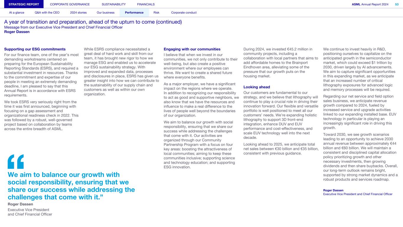 Supporting our ESG commitments For our finance team, one of the year’s most demanding workstreams centered on preparing for the European Sustainability Reporting Standards (ESRS), and required a substantial investment in resources. Thanks to the commitment and expertise of our people in meeting an extremely demanding deadline, I am pleased to say that this Annual Report is in accordance with ESRS requirements. We took ESRS very seriously right from the time it was first announced, beginning with focusing on a gap assessment and organizational readiness check in 2022. This was followed by a robust, well-governed project based on collaboration by teams across the entire breadth of ASML. While ESRS compliance necessitated a great deal of hard work and skill from our team, it has brought new rigor to how we manage ESG and enabled us to accelerate our ESG sustainability strategy. With improved and expanded data, processes and disclosures in place, ESRS has given us greater insight into how we can contribute to the sustainability of our supply chain and customers as well as within our own organization. Engaging with our communities I believe that when we invest in our communities, we not only contribute to their well-being, but also create a positive environment where our employees can thrive. We want to create a shared future where everyone benefits. As a major employer, we have a significant impact on the regions where we operate. In addition to recognizing our responsibility to act as good and supportive neighbors, we also know that we have the resources and influence to make a real difference to the lives of people well beyond the boundaries of our organization. We aim to balance our growth with social responsibility, ensuring that we share our success while addressing the challenges that come with it. Our activities are organized through our Community Partnership Program with a focus on four key areas: boosting the attractiveness of local communities; aiming to keep these communities inclusive; supporting science and technology education; and supporting ESG innovation. During 2024, we invested €45.2 million in community projects, including a collaboration with local partners that aims to add affordable homes to the Brainport Eindhoven area, alleviating some of the pressure that our growth puts on the housing market. Looking ahead Our customers are fundamental to our strategy, and we believe that lithography will continue to play a crucial role in driving their innovation forward. Our flexible and versatile portfolio is well positioned to meet all our customers’ needs. We’re expanding holistic lithography to support 3D front-end integration, enhance DUV and EUV performance and cost-effectiveness, and scale EUV technology well into the next decade. Looking ahead to 2025, we anticipate total net sales between €30 billion and €35 billion, consistent with previous guidance. We continue to invest heavily in R&D, positioning ourselves to capitalize on the anticipated growth in the semiconductor market, which could exceed $1 trillion by 2030, driven largely by AI advancements. We aim to capture significant opportunities in this expanding market, as we anticipate that an increased number of critical lithography exposures for advanced logic and memory processes will be required. Regarding our net service and field option sales business, we anticipate revenue growth compared to 2024, fueled by increased service and upgrade activities linked to our expanding installed base. EUV technology in particular is playing an increasingly significant role in driving this growth. Toward 2030, we see growth scenarios leading to an opportunity to achieve 2030 annual revenue between approximately €44 billion and €60 billion. We will maintain a consistent and disciplined capital allocation policy prioritizing growth and other necessary investments, then growing dividends and then share buybacks. Overall, our long-term outlook remains bright, supported by strong market dynamics and a robust products and services roadmap. Roger Dassen Executive Vice President and Chief Financial Officer STRATEGIC REPORT CORPORATE GOVERNANCE SUSTAINABILITY FINANCIALS ASML Annual Report 2024 53 At a glance Q&A with the CEO 2024 stories Our business Performance Risk Corporate conduct A year of transition and preparation, ahead of the upturn to come (continued) Message from our Executive Vice President and Chief Financial Officer Roger Dassen We aim to balance our growth with social responsibility, ensuring that we share our success while addressing the challenges that come with it.” Roger Dassen Executive Vice President and Chief Financial Officer