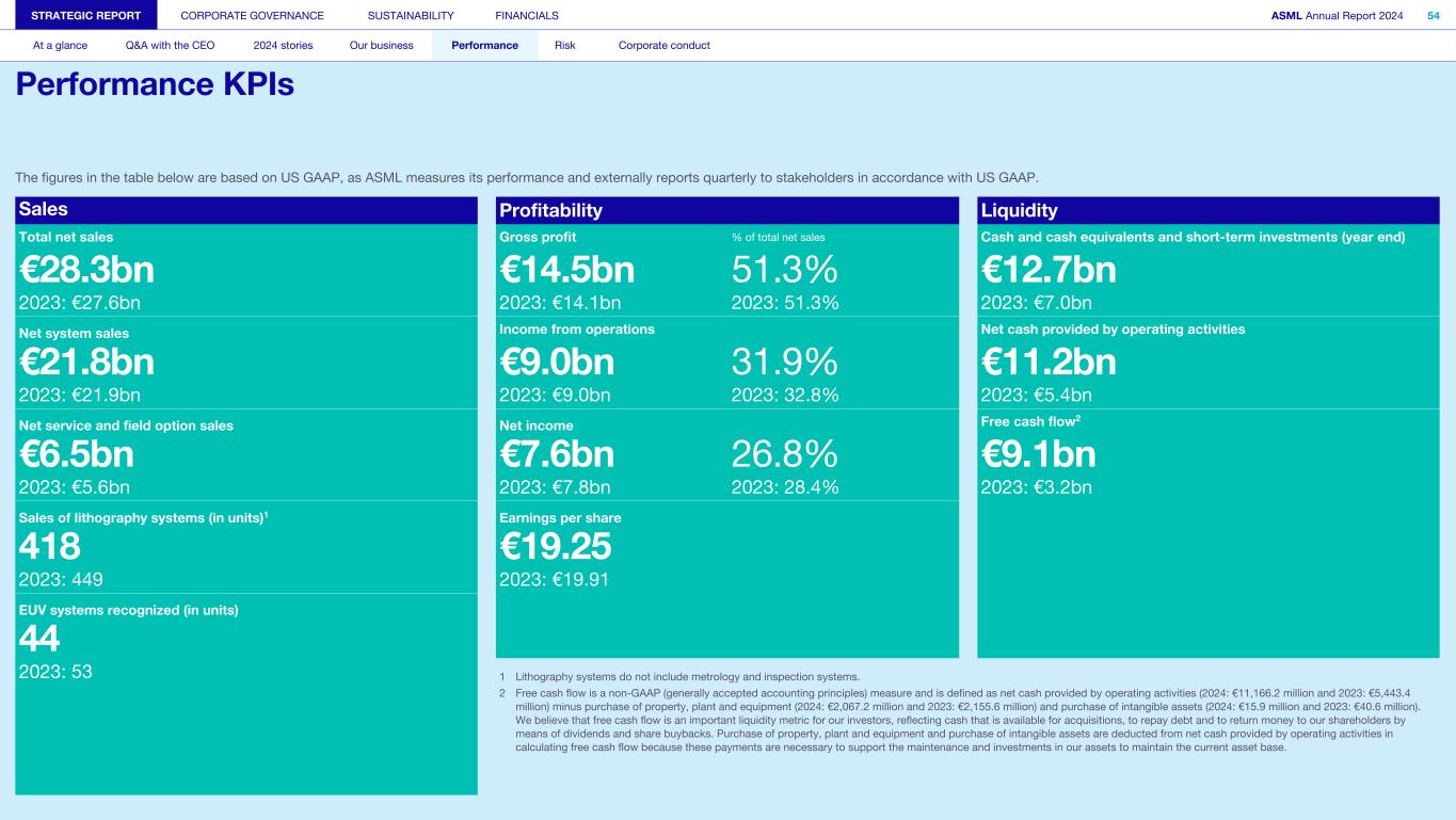 The figures in the table below are based on US GAAP, as ASML measures its performance and externally reports quarterly to stakeholders in accordance with US GAAP. Sales Profitability Liquidity Total net sales Gross profit % of total net sales Cash and cash equivalents and short-term investments (year end) €28.3bn €14.5bn 51.3% €12.7bn 2023: €27.6bn 2023: €14.1bn 2023: 51.3% 2023: €7.0bn Net system sales Income from operations Net cash provided by operating activities €21.8bn €9.0bn 31.9% €11.2bn 2023: €21.9bn 2023: €9.0bn 2023: 32.8% 2023: €5.4bn Net service and field option sales Net income Free cash flow2 €6.5bn €7.6bn 26.8% €9.1bn 2023: €5.6bn 2023: €7.8bn 2023: 28.4% 2023: €3.2bn Sales of lithography systems (in units)1 Earnings per share 418 €19.25 2023: 449 2023: €19.91 EUV systems recognized (in units) 44 2023: 53 1 Lithography systems do not include metrology and inspection systems. 2 Free cash flow is a non-GAAP (generally accepted accounting principles) measure and is defined as net cash provided by operating activities (2024: €11,166.2 million and 2023: €5,443.4 million) minus purchase of property, plant and equipment (2024: €2,067.2 million and 2023: €2,155.6 million) and purchase of intangible assets (2024: €15.9 million and 2023: €40.6 million). We believe that free cash flow is an important liquidity metric for our investors, reflecting cash that is available for acquisitions, to repay debt and to return money to our shareholders by means of dividends and share buybacks. Purchase of property, plant and equipment and purchase of intangible assets are deducted from net cash provided by operating activities in calculating free cash flow because these payments are necessary to support the maintenance and investments in our assets to maintain the current asset base. STRATEGIC REPORT CORPORATE GOVERNANCE SUSTAINABILITY FINANCIALS ASML Annual Report 2024 54 At a glance Q&A with the CEO 2024 stories Our business Performance Risk Corporate conduct Performance KPIs