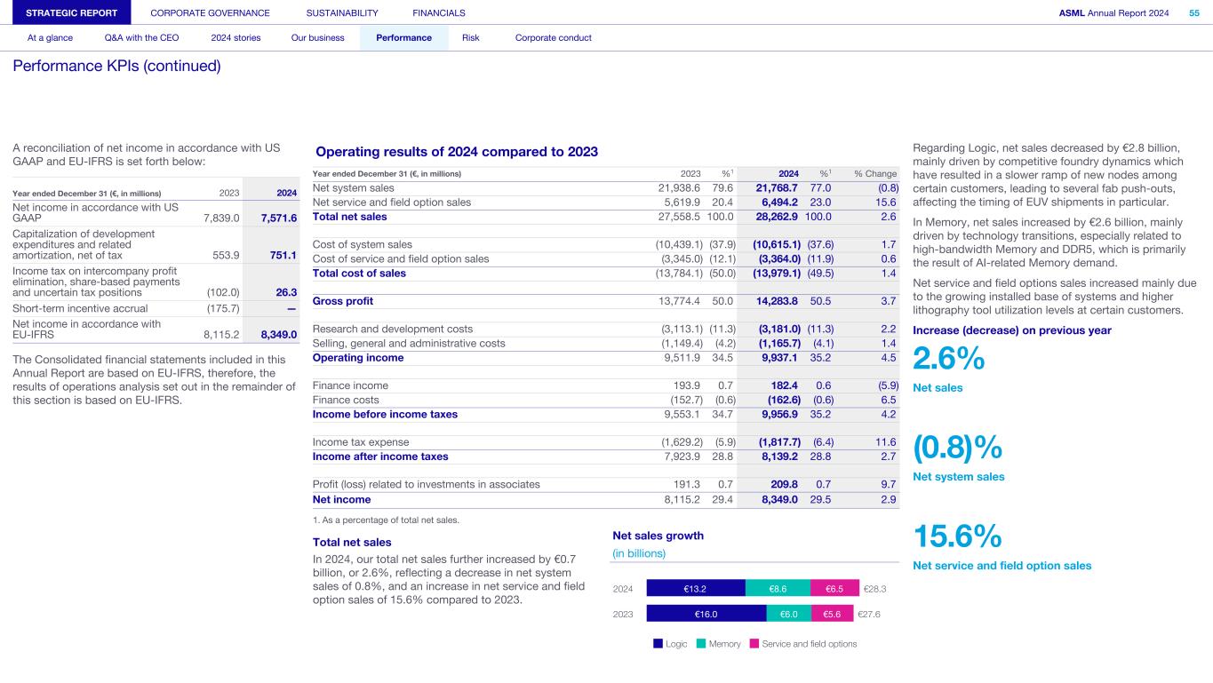A reconciliation of net income in accordance with US GAAP and EU-IFRS is set forth below: Year ended December 31 (€, in millions) 2023 2024 Net income in accordance with US GAAP 7,839.0 7,571.6 Capitalization of development expenditures and related amortization, net of tax 553.9 751.1 Income tax on intercompany profit elimination, share-based payments and uncertain tax positions (102.0) 26.3 Short-term incentive accrual (175.7) — Net income in accordance with EU-IFRS 8,115.2 8,349.0 The Consolidated financial statements included in this Annual Report are based on EU-IFRS, therefore, the results of operations analysis set out in the remainder of this section is based on EU-IFRS. Operating results of 2024 compared to 2023 Year ended December 31 (€, in millions) 2023 %1 2024 %1 % Change Net system sales 21,938.6 79.6 21,768.7 77.0 (0.8) Net service and field option sales 5,619.9 20.4 6,494.2 23.0 15.6 Total net sales 27,558.5 100.0 28,262.9 100.0 2.6 Cost of system sales (10,439.1) (37.9) (10,615.1) (37.6) 1.7 Cost of service and field option sales (3,345.0) (12.1) (3,364.0) (11.9) 0.6 Total cost of sales (13,784.1) (50.0) (13,979.1) (49.5) 1.4 Gross profit 13,774.4 50.0 14,283.8 50.5 3.7 Research and development costs (3,113.1) (11.3) (3,181.0) (11.3) 2.2 Selling, general and administrative costs (1,149.4) (4.2) (1,165.7) (4.1) 1.4 Operating income 9,511.9 34.5 9,937.1 35.2 4.5 Finance income 193.9 0.7 182.4 0.6 (5.9) Finance costs (152.7) (0.6) (162.6) (0.6) 6.5 Income before income taxes 9,553.1 34.7 9,956.9 35.2 4.2 Income tax expense (1,629.2) (5.9) (1,817.7) (6.4) 11.6 Income after income taxes 7,923.9 28.8 8,139.2 28.8 2.7 Profit (loss) related to investments in associates 191.3 0.7 209.8 0.7 9.7 Net income 8,115.2 29.4 8,349.0 29.5 2.9 1. As a percentage of total net sales. Total net sales In 2024, our total net sales further increased by €0.7 billion, or 2.6%, reflecting a decrease in net system sales of 0.8%, and an increase in net service and field option sales of 15.6% compared to 2023. Net sales growth (in billions) €28.3 €27.6 €13.2 €16.0 €8.6 €6.0 €6.5 €5.6 Logic Memory Service and field options 2024 2023 Regarding Logic, net sales decreased by €2.8 billion, mainly driven by competitive foundry dynamics which have resulted in a slower ramp of new nodes among certain customers, leading to several fab push-outs, affecting the timing of EUV shipments in particular. In Memory, net sales increased by €2.6 billion, mainly driven by technology transitions, especially related to high-bandwidth Memory and DDR5, which is primarily the result of AI-related Memory demand. Net service and field options sales increased mainly due to the growing installed base of systems and higher lithography tool utilization levels at certain customers. Increase (decrease) on previous year 2.6% Net sales (0.8)% Net system sales 15.6% Net service and field option sales STRATEGIC REPORT CORPORATE GOVERNANCE SUSTAINABILITY FINANCIALS ASML Annual Report 2024 55 At a glance Q&A with the CEO 2024 stories Our business Performance Risk Corporate conduct Performance KPIs (continued)