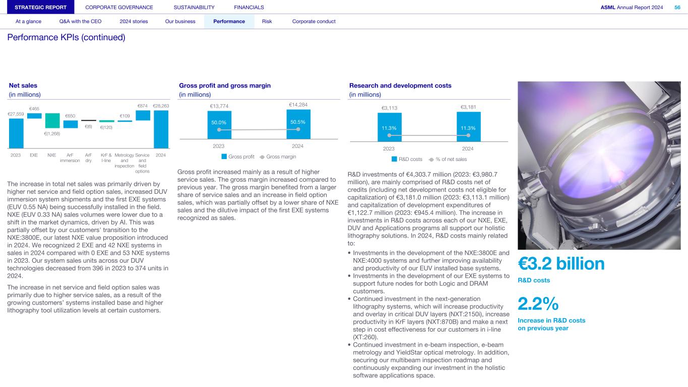 Net sales (in millions) €27,559 €465 €(1,268) €650 €(6) €(120) €109 €874 €28,263 2023 EXE NXE ArF immersion ArF dry KrF & I-line Metrology and inspection Service and field options 2024 The increase in total net sales was primarily driven by higher net service and field option sales, increased DUV immersion system shipments and the first EXE systems (EUV 0.55 NA) being successfully installed in the field. NXE (EUV 0.33 NA) sales volumes were lower due to a shift in the market dynamics, driven by AI. This was partially offset by our customers' transition to the NXE:3800E, our latest NXE value proposition introduced in 2024. We recognized 2 EXE and 42 NXE systems in sales in 2024 compared with 0 EXE and 53 NXE systems in 2023. Our system sales units across our DUV technologies decreased from 396 in 2023 to 374 units in 2024. The increase in net service and field option sales was primarily due to higher service sales, as a result of the growing customers’ systems installed base and higher lithography tool utilization levels at certain customers. Gross profit and gross margin (in millions) €13,774 €14,284 50.0% 50.5% Gross profit Gross margin 2023 2024 Gross profit increased mainly as a result of higher service sales. The gross margin increased compared to previous year. The gross margin benefited from a larger share of service sales and an increase in field option sales, which was partially offset by a lower share of NXE sales and the dilutive impact of the first EXE systems recognized as sales. Research and development costs (in millions) €3,113 €3,181 11.3% 11.3% R&D costs % of net sales 2023 2024 R&D investments of €4,303.7 million (2023: €3,980.7 million), are mainly comprised of R&D costs net of credits (including net development costs not eligible for capitalization) of €3,181.0 million (2023: €3,113.1 million) and capitalization of development expenditures of €1,122.7 million (2023: €945.4 million). The increase in investments in R&D costs across each of our NXE, EXE, DUV and Applications programs all support our holistic lithography solutions. In 2024, R&D costs mainly related to: • Investments in the development of the NXE:3800E and NXE:4000 systems and further improving availability and productivity of our EUV installed base systems. • Investments in the development of our EXE systems to support future nodes for both Logic and DRAM customers. • Continued investment in the next-generation lithography systems, which will increase productivity and overlay in critical DUV layers (NXT:2150i), increase productivity in KrF layers (NXT:870B) and make a next step in cost effectiveness for our customers in i-line (XT:260). • Continued investment in e-beam inspection, e-beam metrology and YieldStar optical metrology. In addition, securing our multibeam inspection roadmap and continuously expanding our investment in the holistic software applications space. €3.2 billion R&D costs 2.2% Increase in R&D costs on previous year STRATEGIC REPORT CORPORATE GOVERNANCE SUSTAINABILITY FINANCIALS ASML Annual Report 2024 56 At a glance Q&A with the CEO 2024 stories Our business Performance Risk Corporate conduct Performance KPIs (continued)